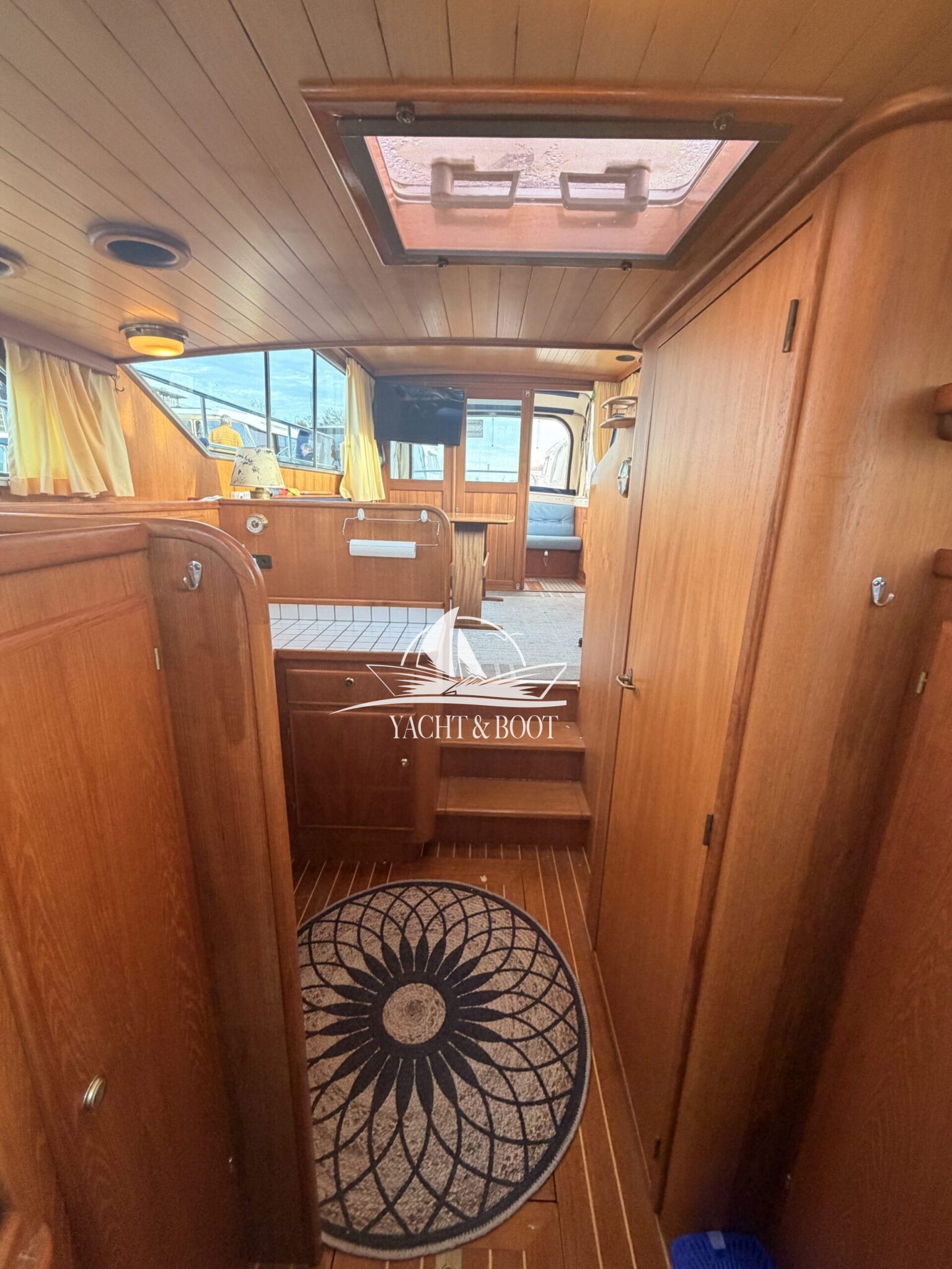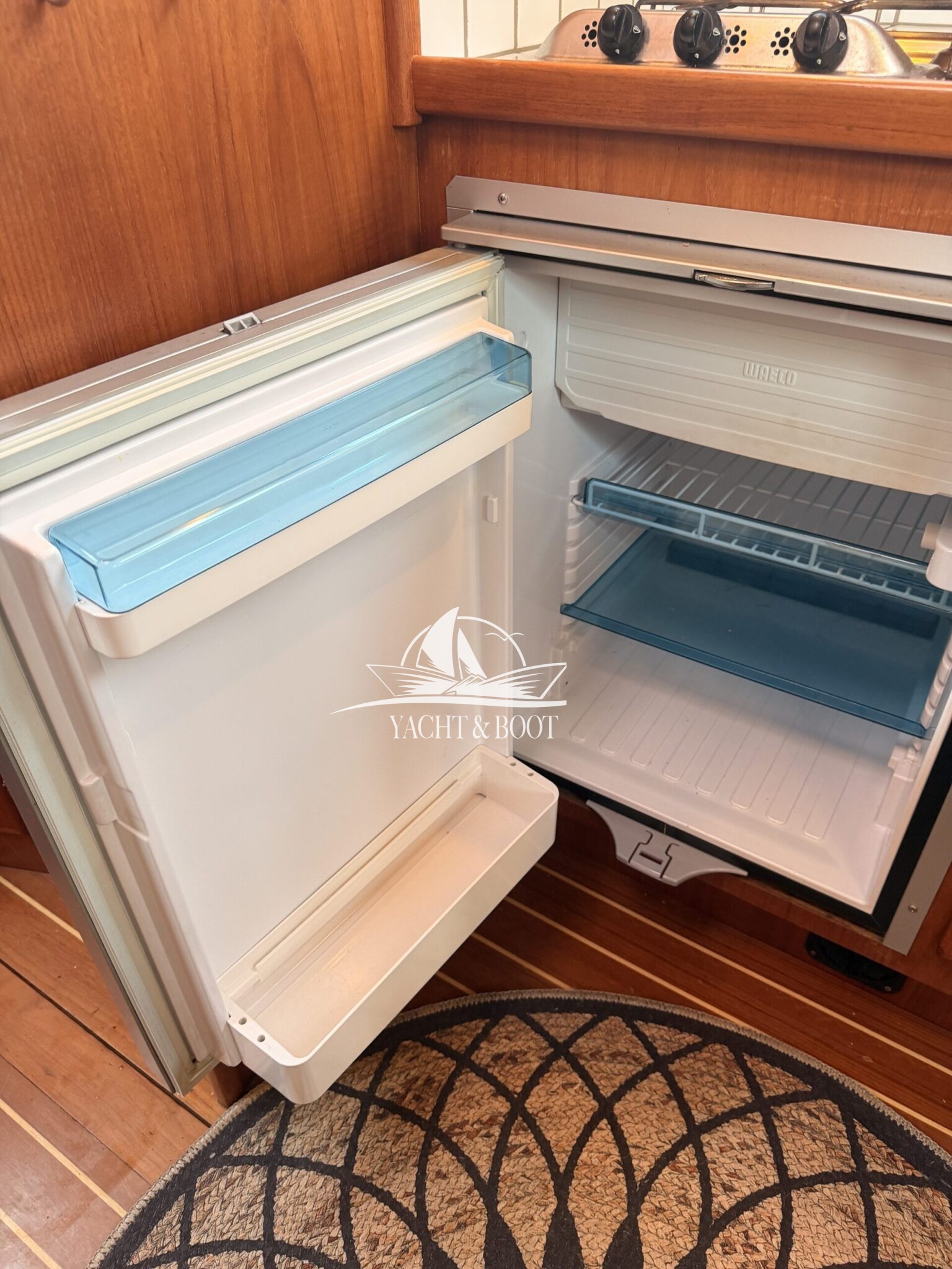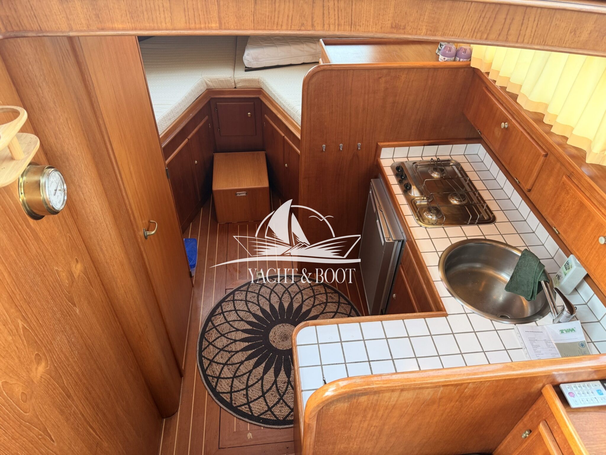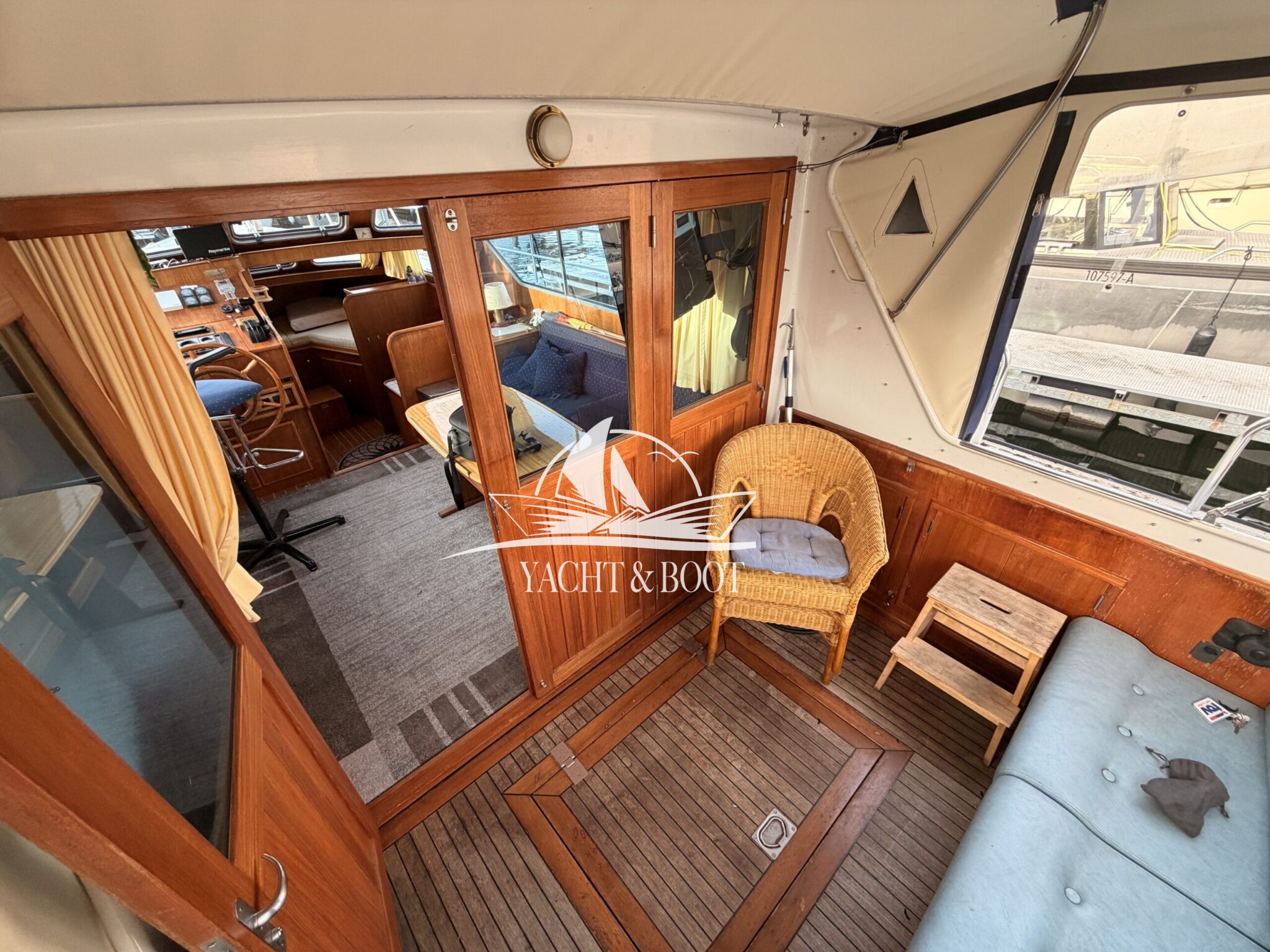Ein Highlight ist die Teak-Salontür. Diese besteht aus 4 Elementen und ist über die gesamte Breite des Schiffes aufklappbar und ermöglicht eine gemeinsame Nutzung von Plicht und Salon als einen großen Raum, was bei schlechtem Wetter eine Atmosphäre von Wintergarten schafft.