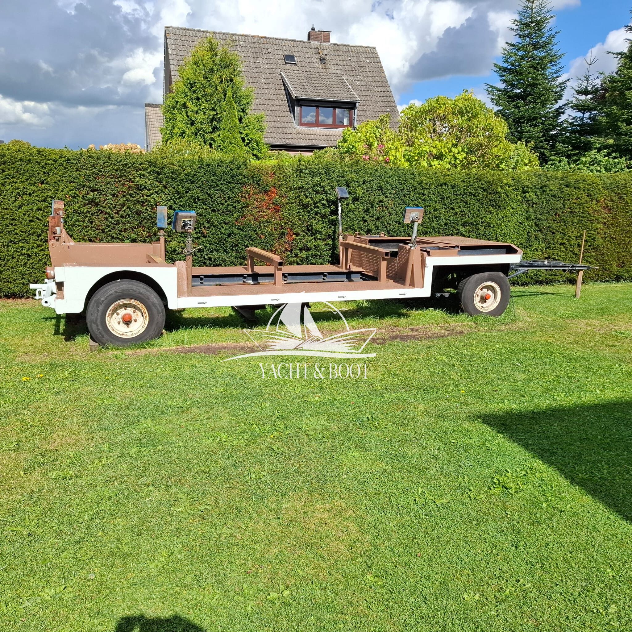 Zum Boot gehört ein 11 Tonnen Hafen- bzw. Straßentrailer. Allerdings fehlt für die Zulassung die Tüv- Bescheinigung. Der Trailer wurde vom Eigner auf das Boot angepasst und neu lackiert.