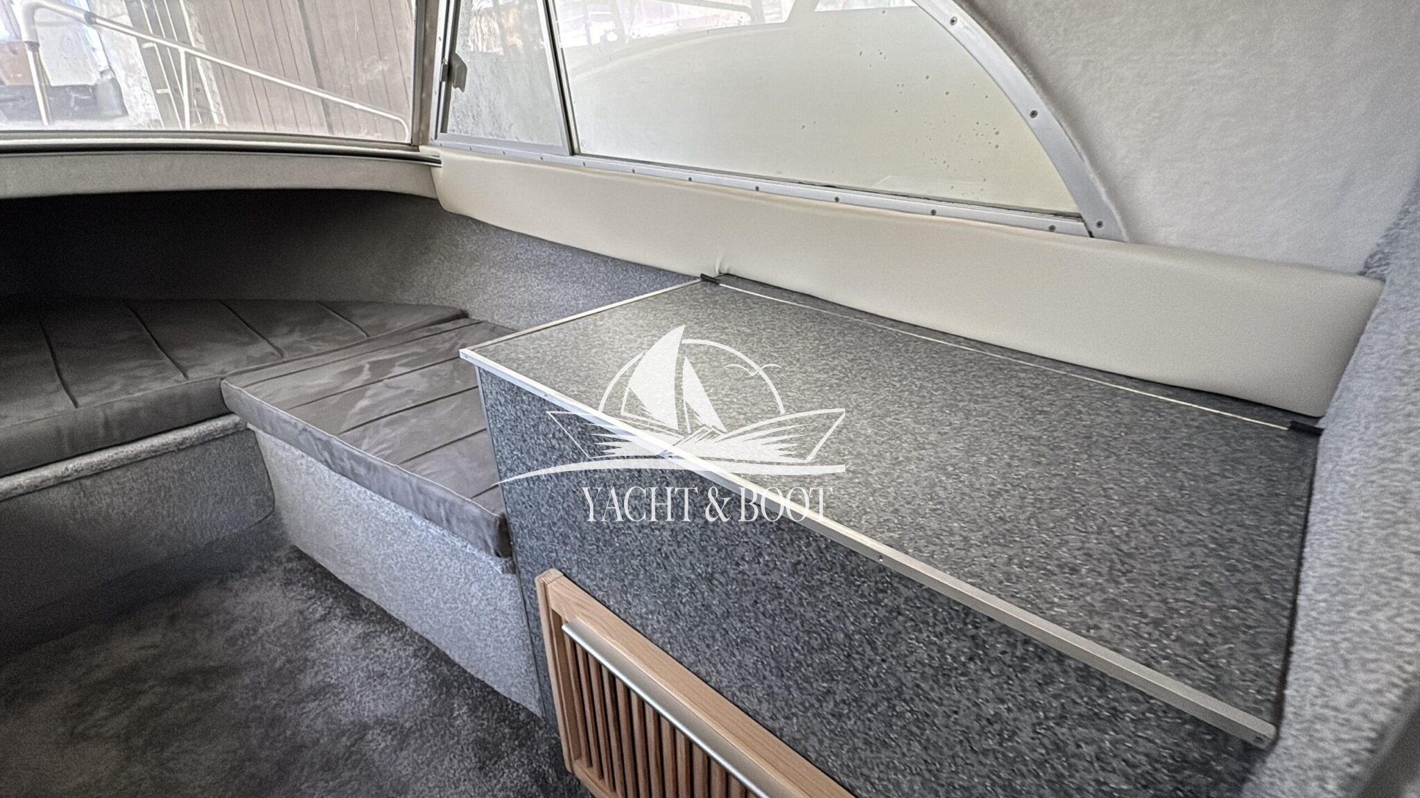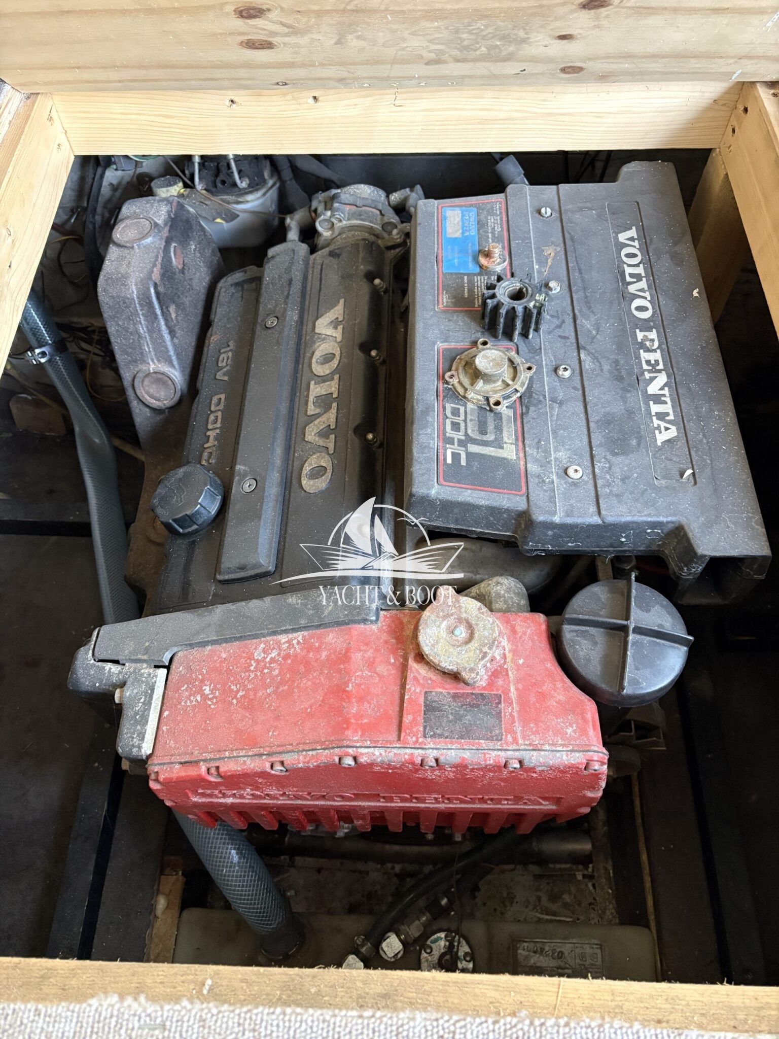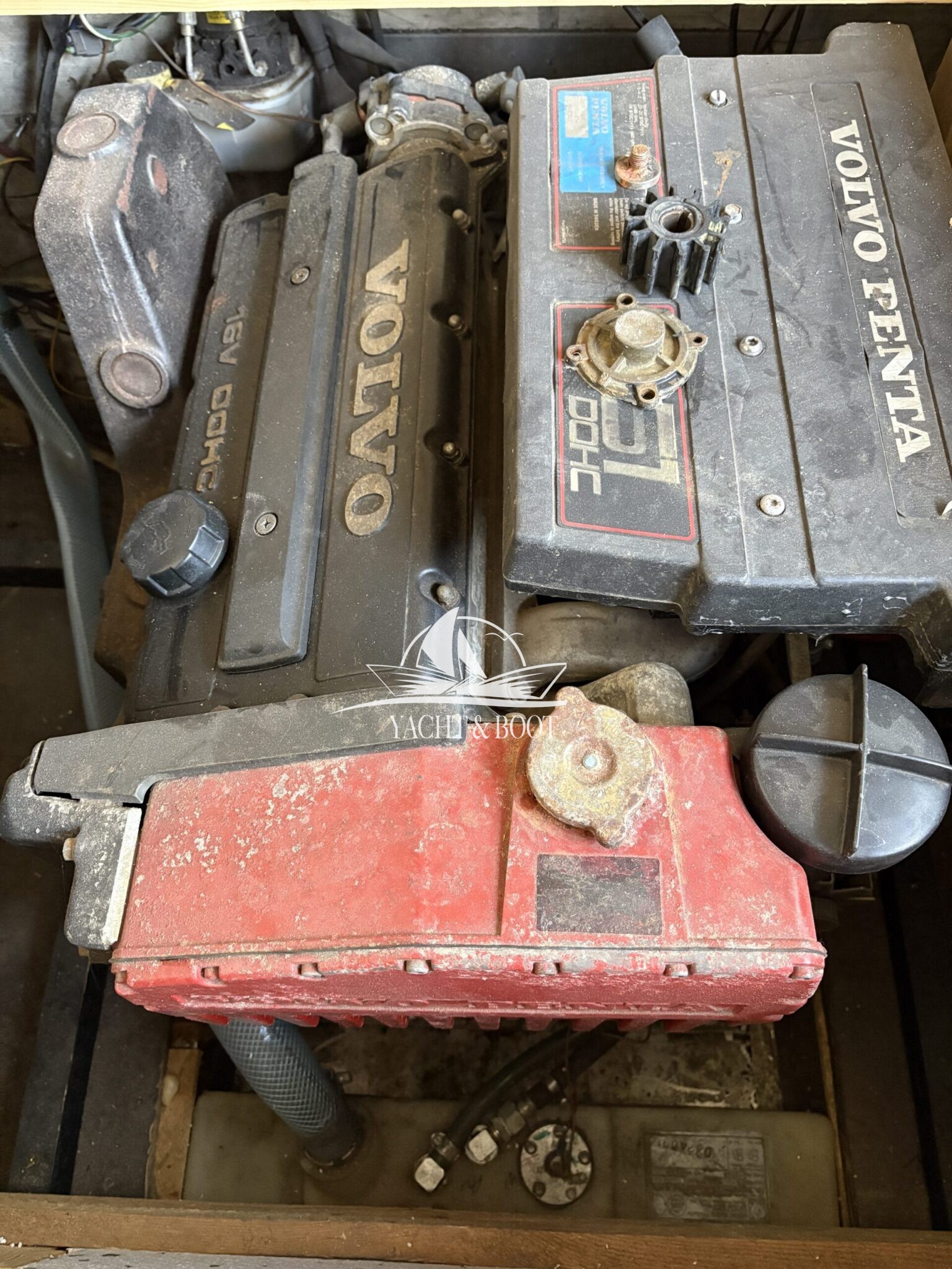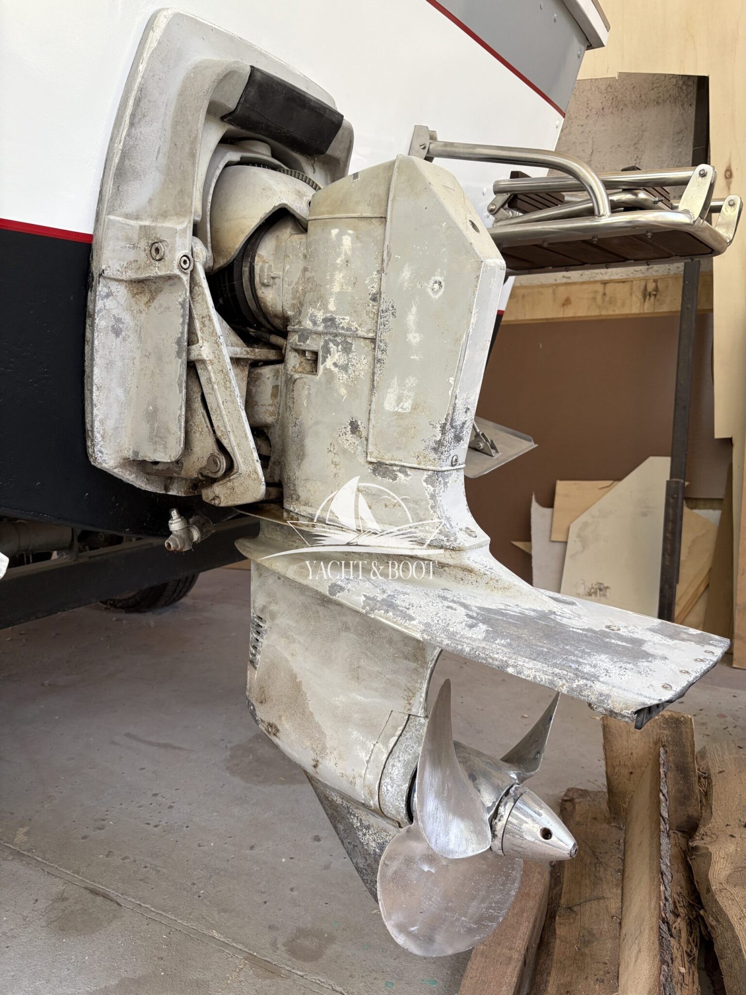 Angetrieben wird die Chieftain von einem kräftigen Volvo Penta Innenborder mit 164 PS, 6 Zylindern und Zweikreiskühlung. Über einen Z-Antrieb mit Edelstahl-Propeller erreicht das Boot eine Geschwindigkeit von bis zu 26 Knoten. Der 100-Liter-Benzintank sorgt dabei für die nötige Reichweite. Die hydraulische Steuerung mit Einhebelbedienung macht das Manövrieren angenehm und präzise, während Trimmklappen und eine elektrische Bilgepumpe für zusätzliche Sicherheit und Komfort sorgen.