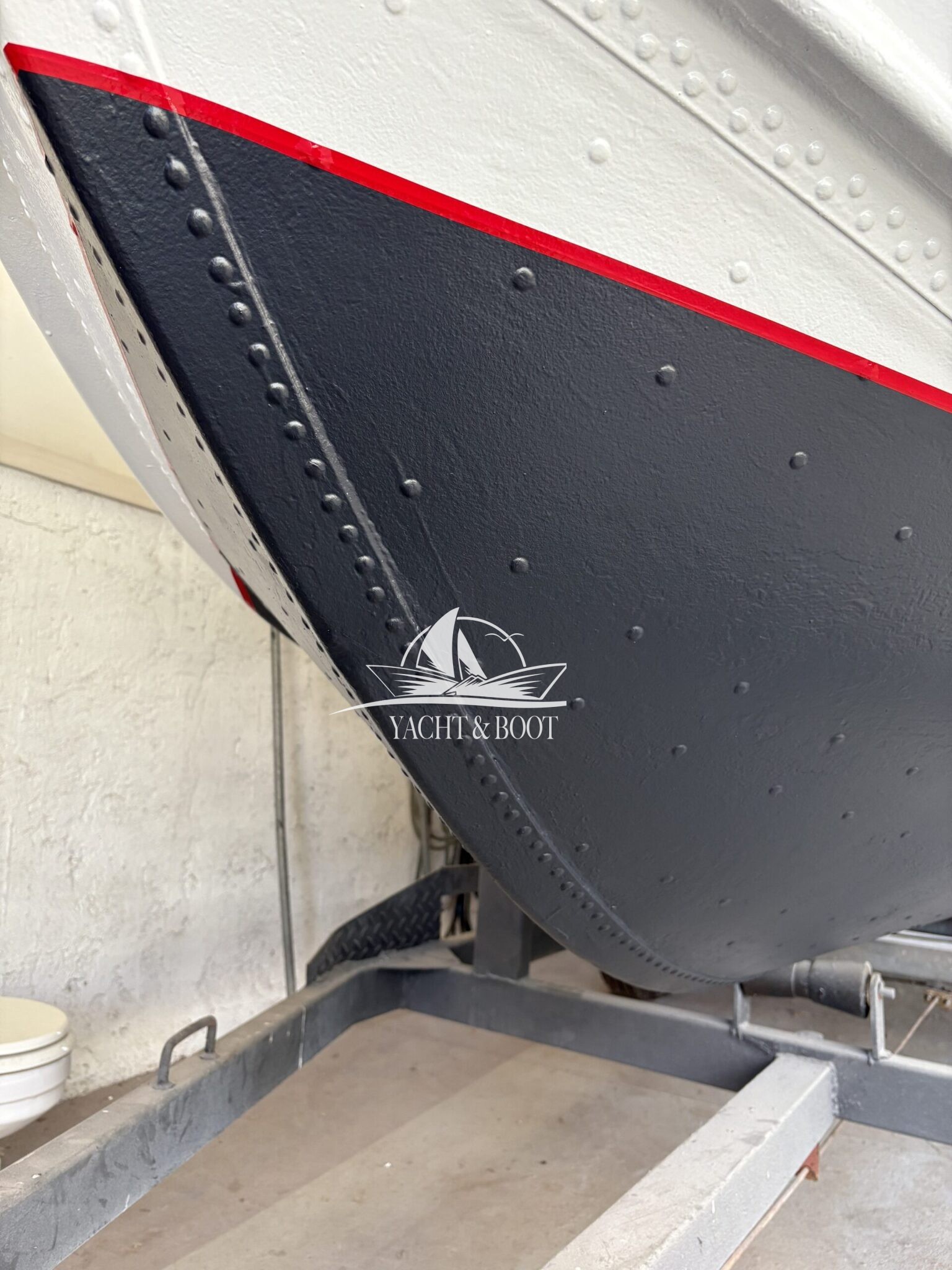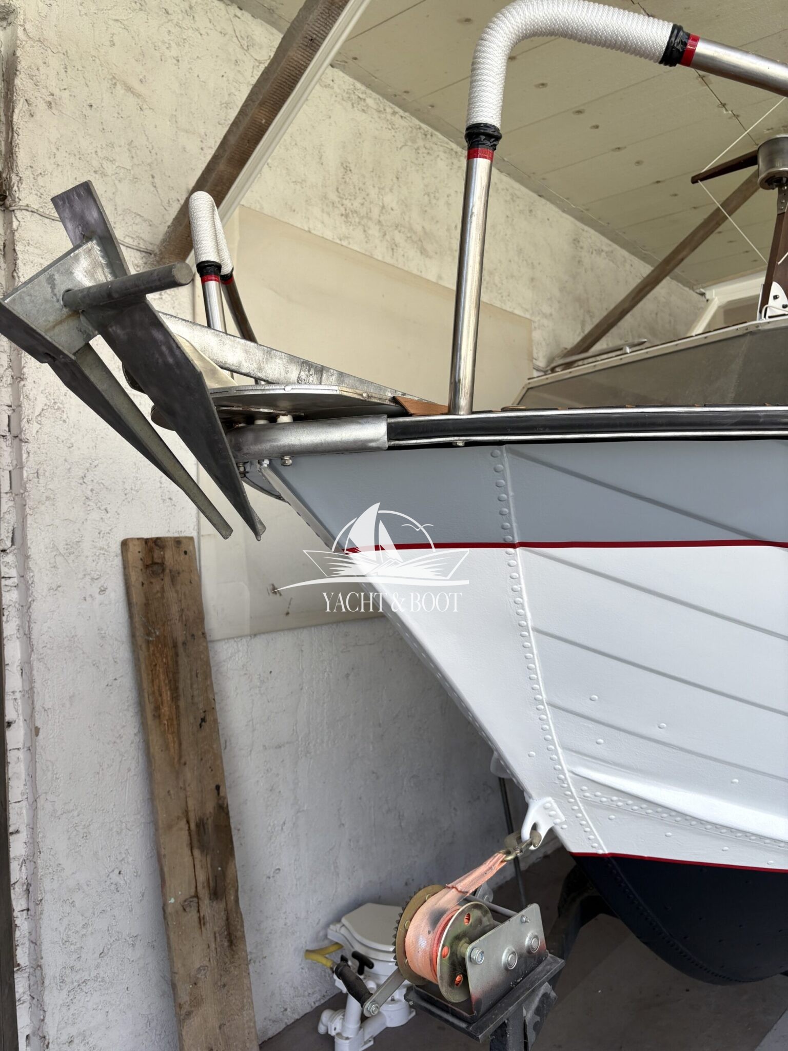 Das Boot wurde außen wie innen mit viel Liebe zum Detail überarbeitet: frische Lackierung, Antifouling schwarz (seitdem nicht im Wasser), neue Persenning aus eigener Herstellung sowie eine komplett überarbeitete Innenausstattung. Trailer (1,8 t, grüne Kennzeichen) ist inklusive – der TÜV wird bei Verkauf neu gemacht, sodass das Boot sofort einsatzbereit ist.