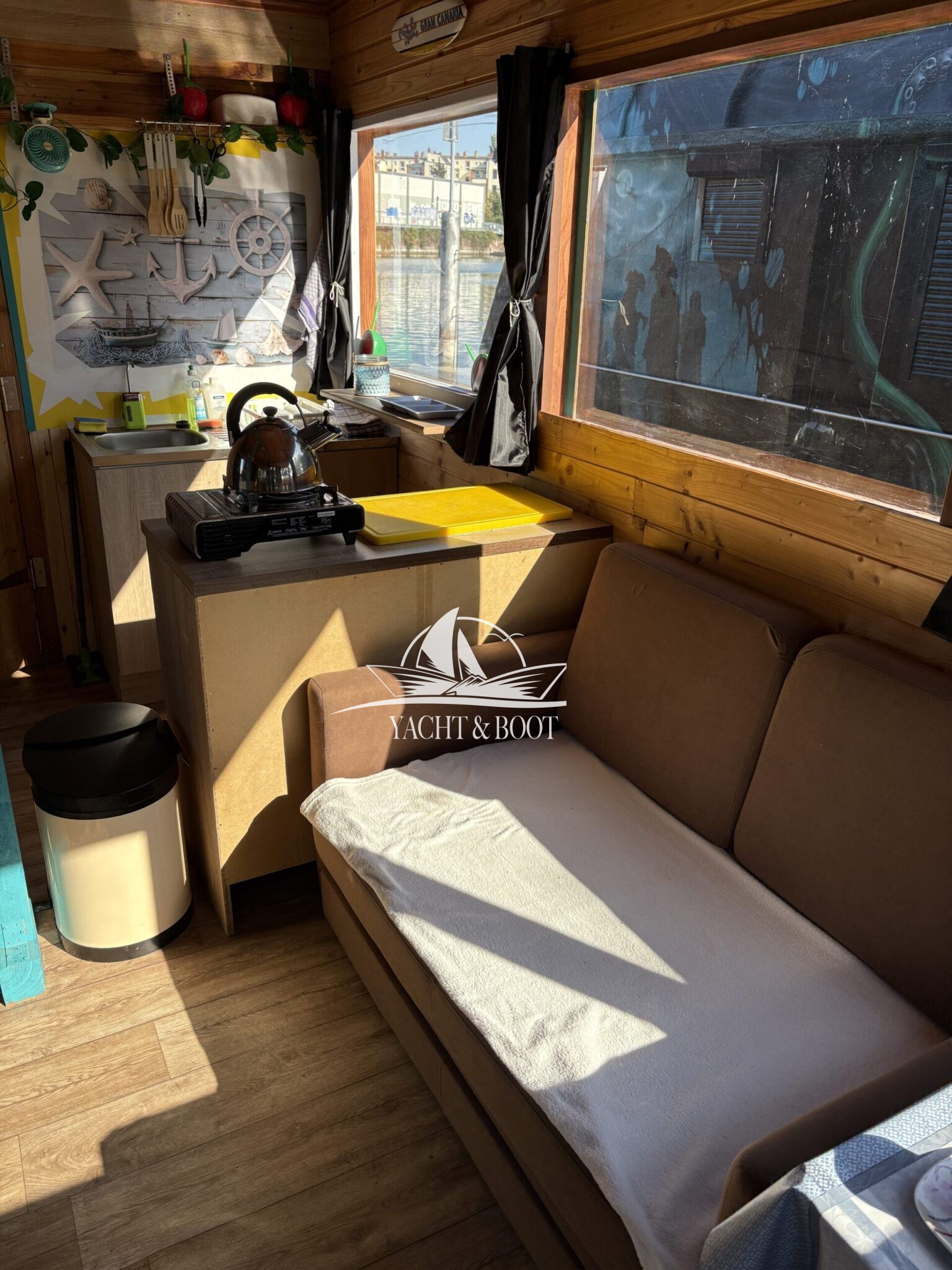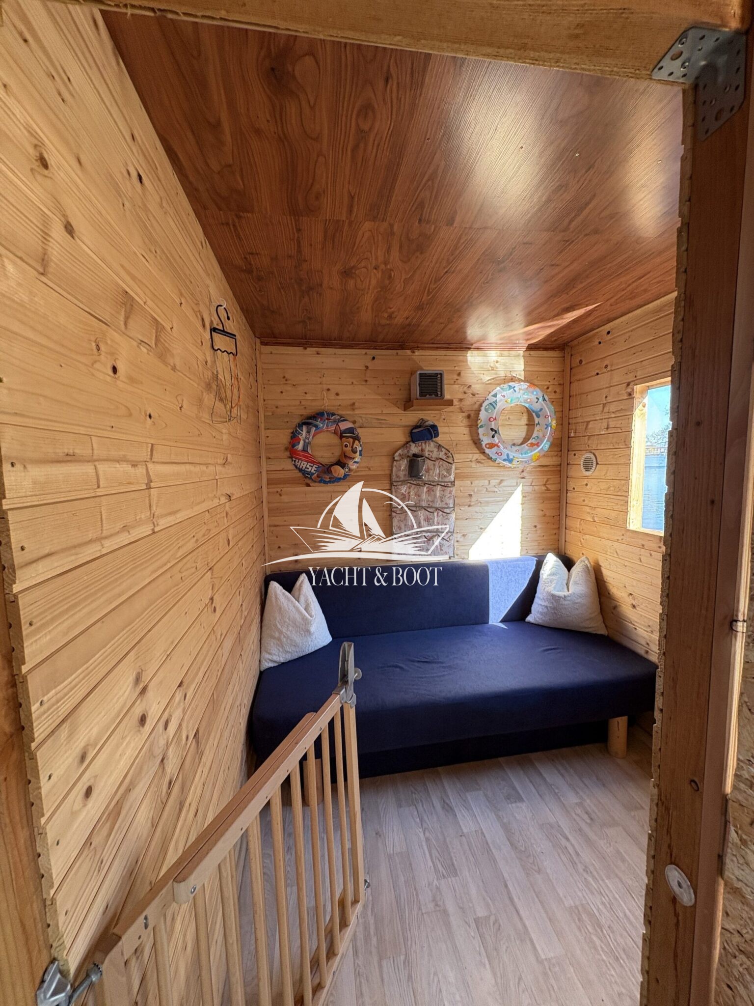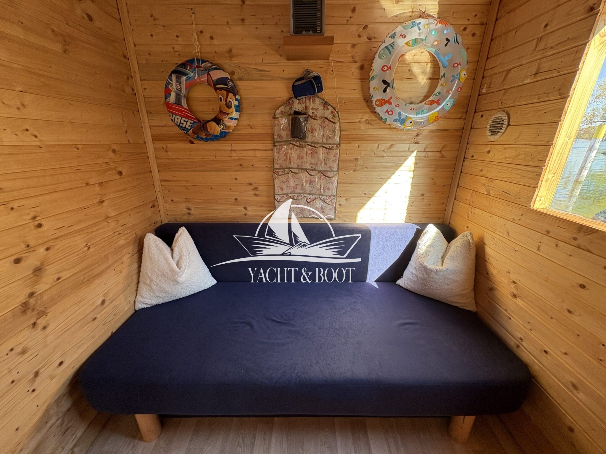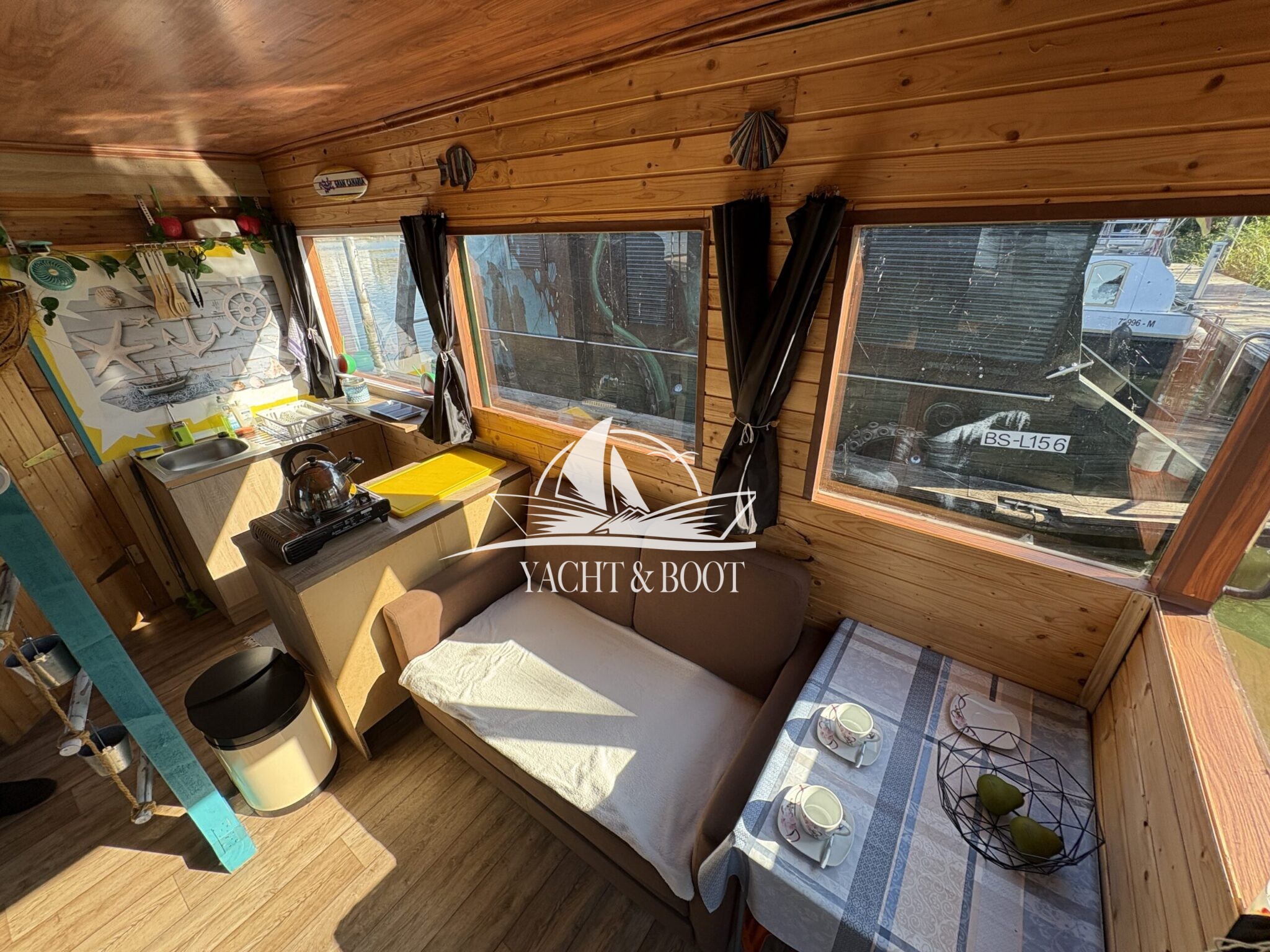 Auf rund 21 m² Innenfläche bietet das Boot eine durchdachte Raumaufteilung: ein offener Wohn- und Küchenbereich mit gemütlicher Schlafcouch, eine funktionale Küchenzeile mit Spüle, 2-flammigem Gaskocher und einer großen Kühl- bzw. Gefriertruhe, dazu ein separates Schlafzimmer mit weiterer Schlafcouch und klimatisierendem Aircon Cube sowie ein praktischer Sanitärbereich mit Waschbecken, Spiegelschrank und Chemietoilette. Über die Eingangstür gelangt man hinaus, und die großzügige Terrasse von 8 m² lädt dazu ein, die Seele baumeln zu lassen, die Abendsonne zu genießen oder den Tag mit einem Kaffee direkt am Wasser zu beginnen.