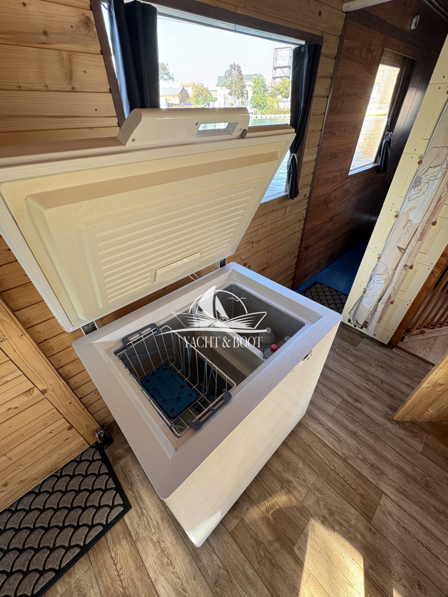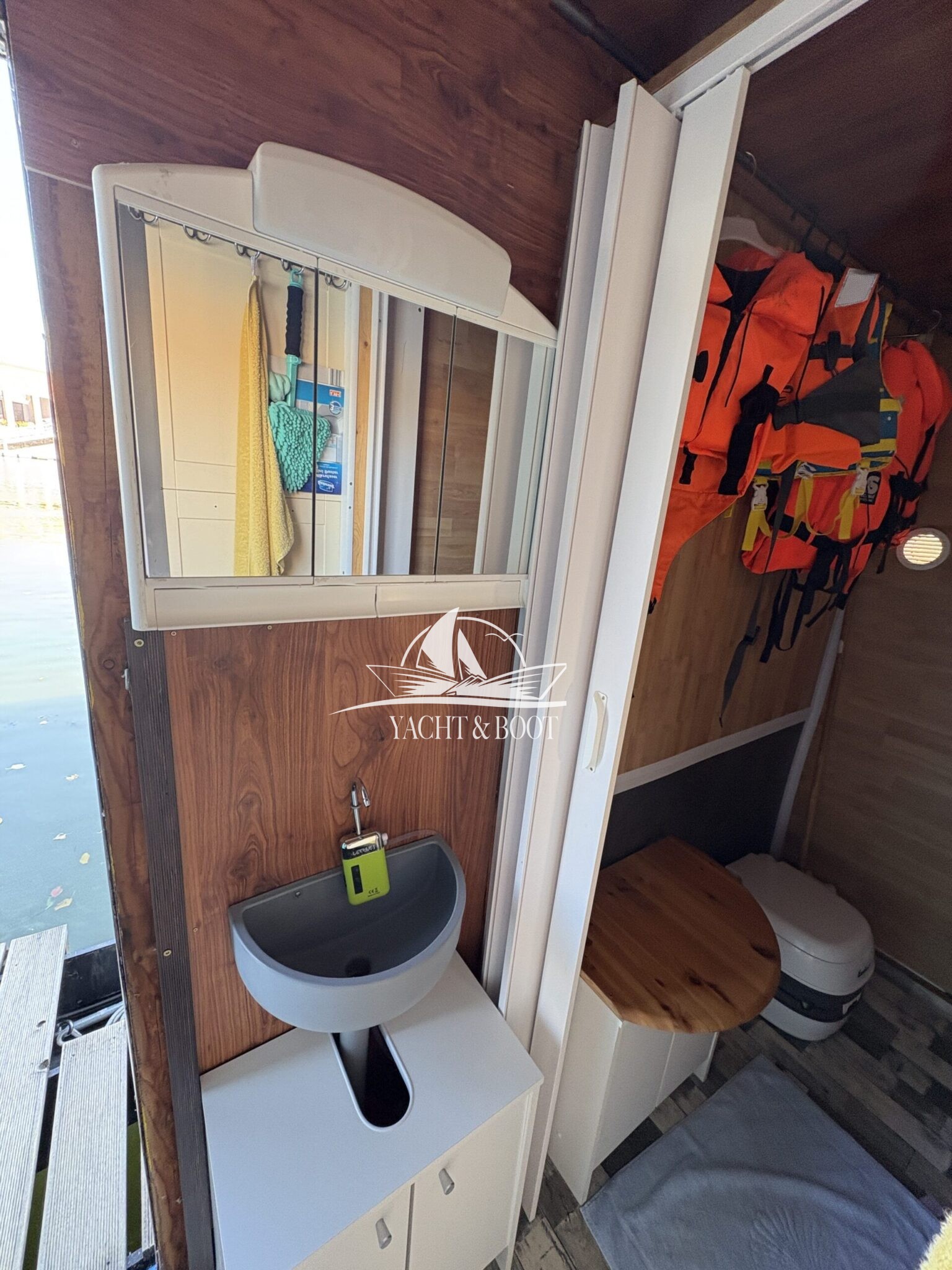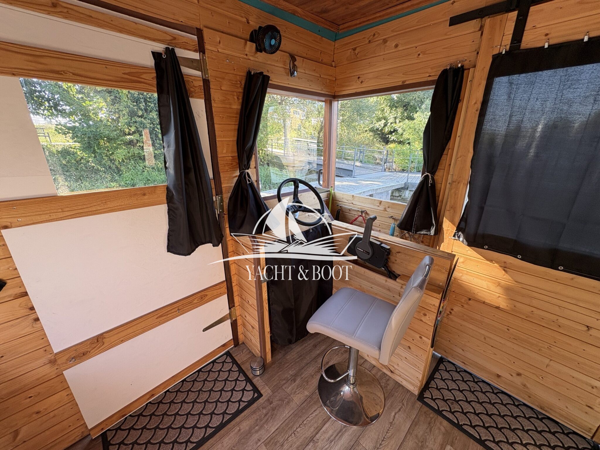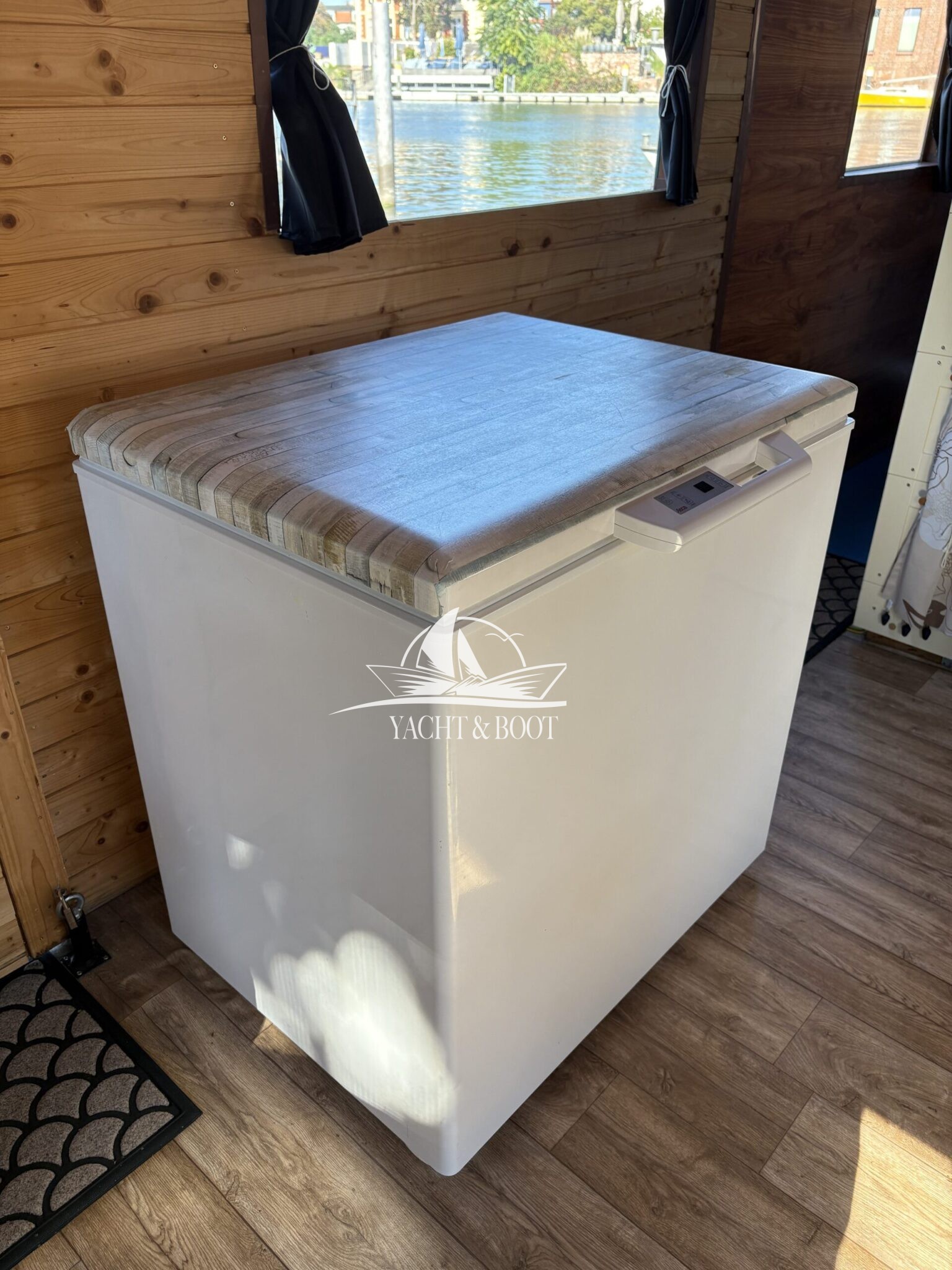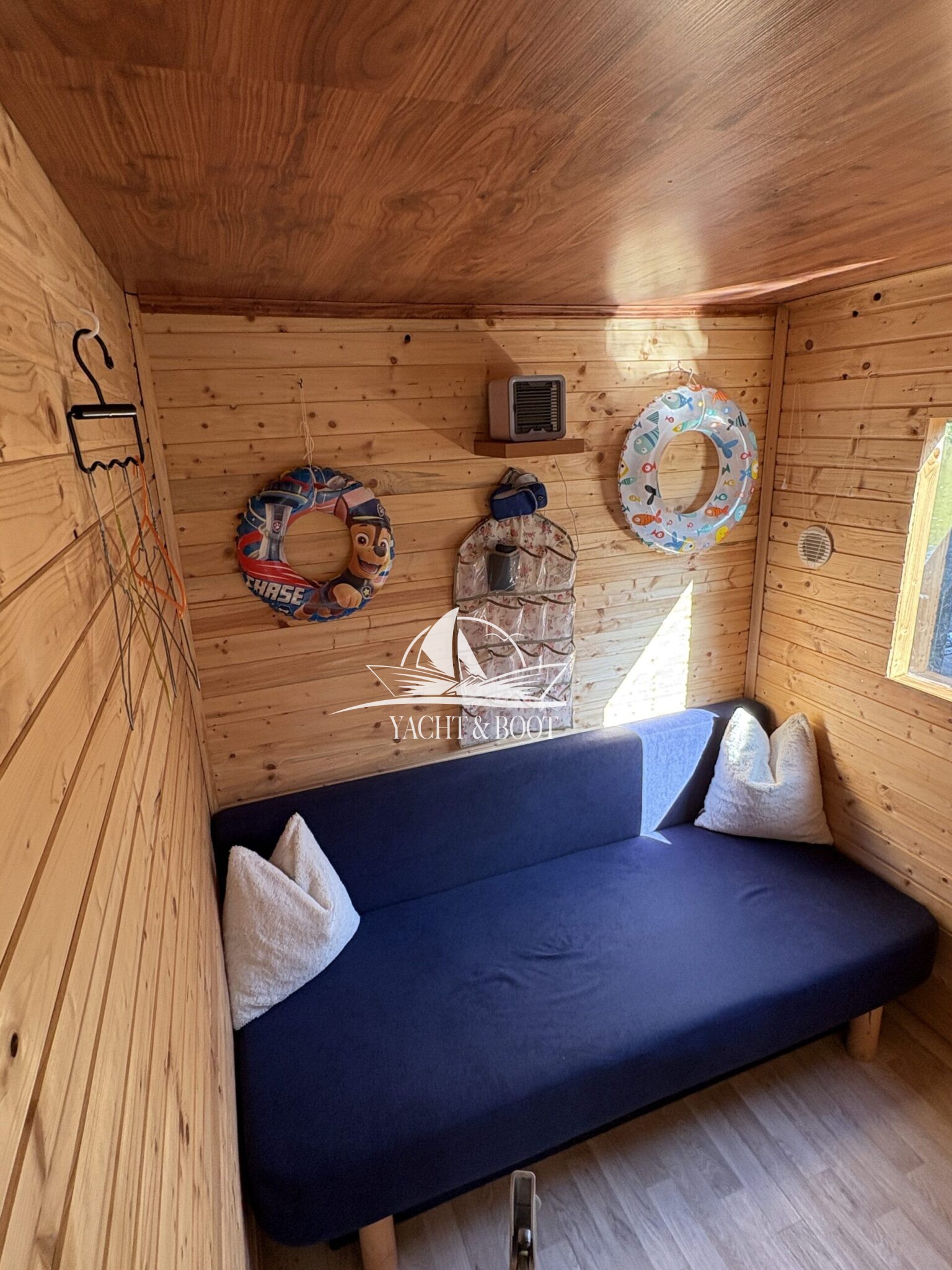 Auf rund 21 m² Innenfläche bietet das Boot eine durchdachte Raumaufteilung: ein offener Wohn- und Küchenbereich mit gemütlicher Schlafcouch, eine funktionale Küchenzeile mit Spüle, 2-flammigem Gaskocher und einer großen Kühl- bzw. Gefriertruhe, dazu ein separates Schlafzimmer mit weiterer Schlafcouch und klimatisierendem Aircon Cube sowie ein praktischer Sanitärbereich mit Waschbecken, Spiegelschrank und Chemietoilette. Über die Eingangstür gelangt man hinaus, und die großzügige Terrasse von 8 m² lädt dazu ein, die Seele baumeln zu lassen, die Abendsonne zu genießen oder den Tag mit einem Kaffee direkt am Wasser zu beginnen.
