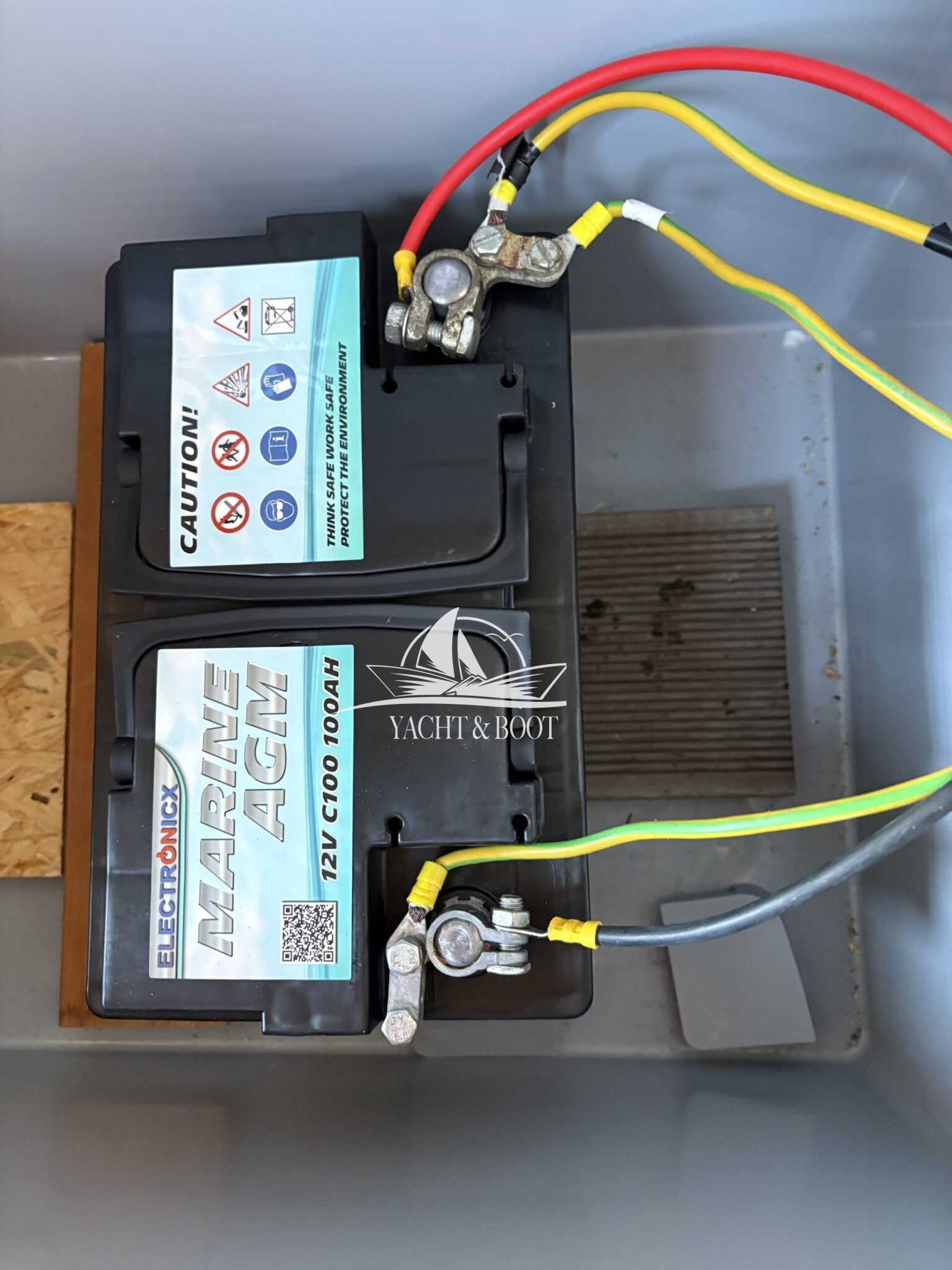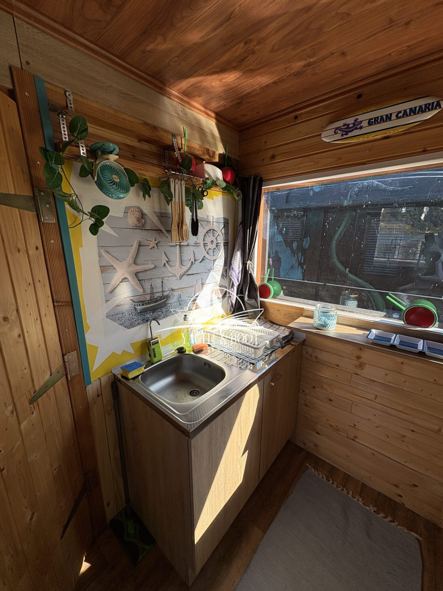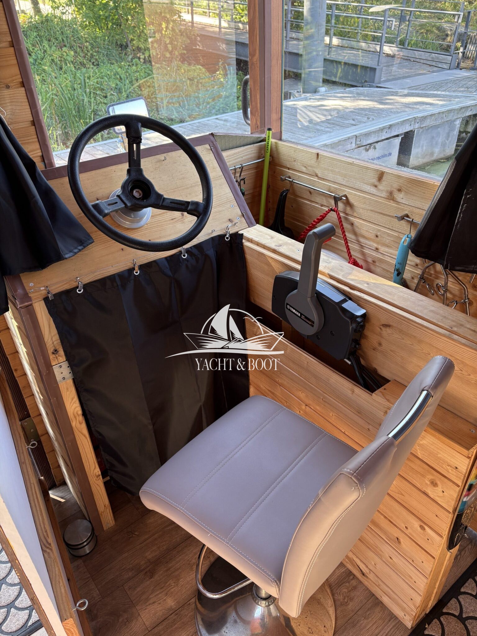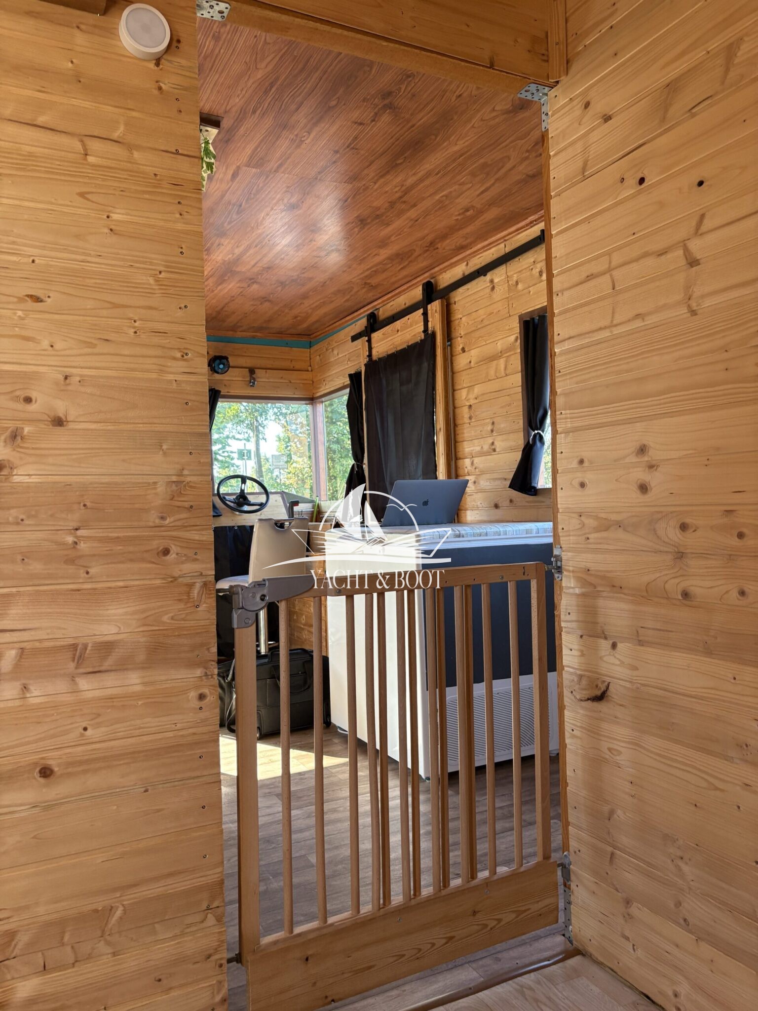 Auf rund 21 m² Innenfläche bietet das Boot eine durchdachte Raumaufteilung: ein offener Wohn- und Küchenbereich mit gemütlicher Schlafcouch, eine funktionale Küchenzeile mit Spüle, 2-flammigem Gaskocher und einer großen Kühl- bzw. Gefriertruhe, dazu ein separates Schlafzimmer mit weiterer Schlafcouch und klimatisierendem Aircon Cube sowie ein praktischer Sanitärbereich mit Waschbecken, Spiegelschrank und Chemietoilette. Über die Eingangstür gelangt man hinaus, und die großzügige Terrasse von 8 m² lädt dazu ein, die Seele baumeln zu lassen, die Abendsonne zu genießen oder den Tag mit einem Kaffee direkt am Wasser zu beginnen.