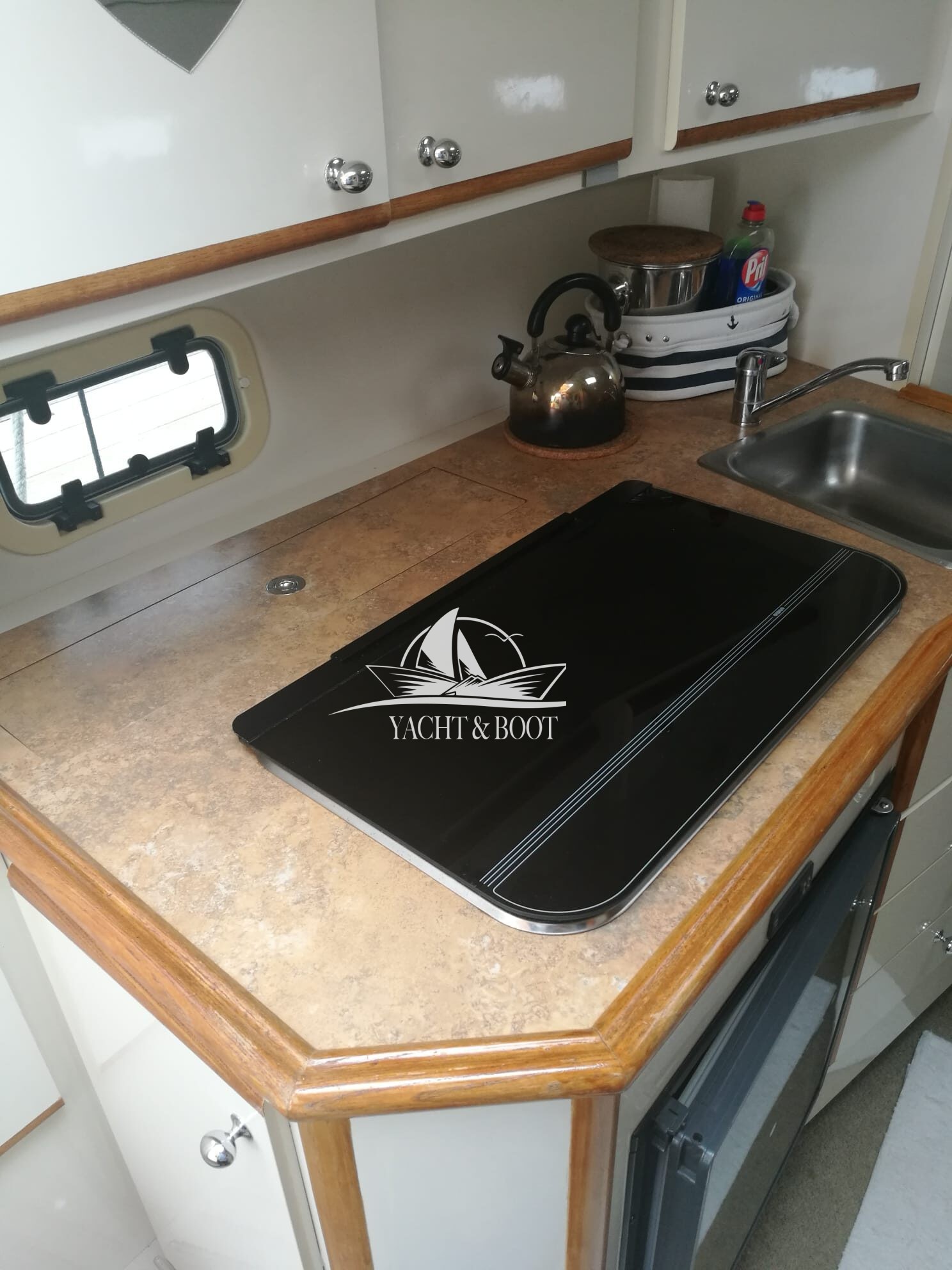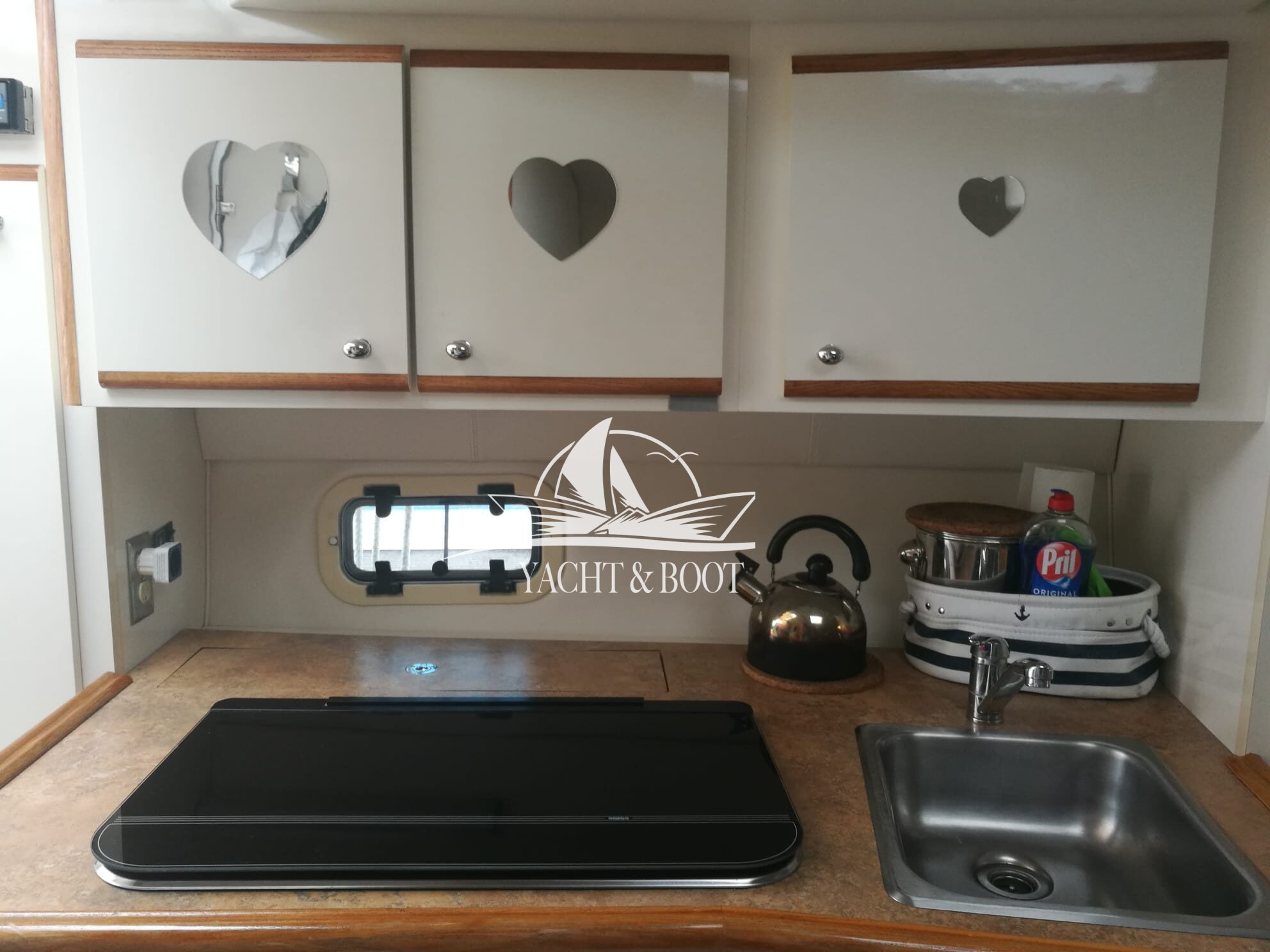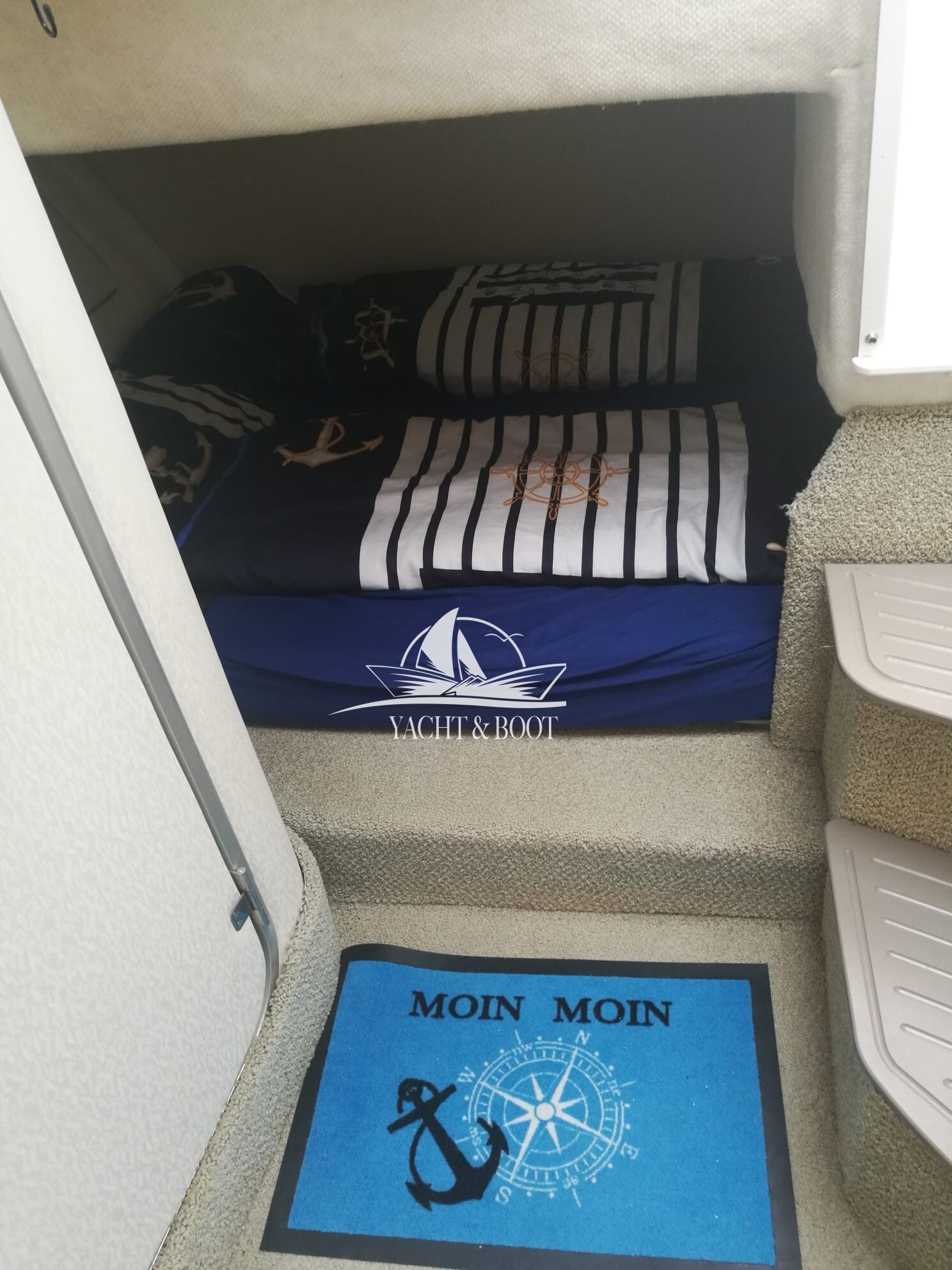 Der Innenraum ist großzügig und hell gestaltet. Mit einer Stehhöhe von rund 1,95 Metern bietet die Kabine ein angenehmes Raumgefühl. Die Pantry ist mit Kühlschrank, Spüle und Kochfeld ausgestattet, während die Nasszelle ein WC mit Fäkalientank, Waschbecken und Dusche umfasst. Es stehen bequeme Schlafplätze für bis zu vier Personen zur Verfügung – eine V-Koje im Bug und eine gemütliche Achterkoje im Heckbereich.