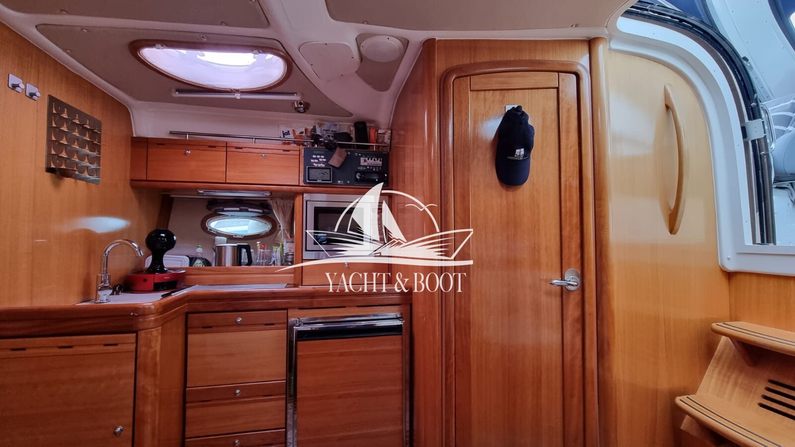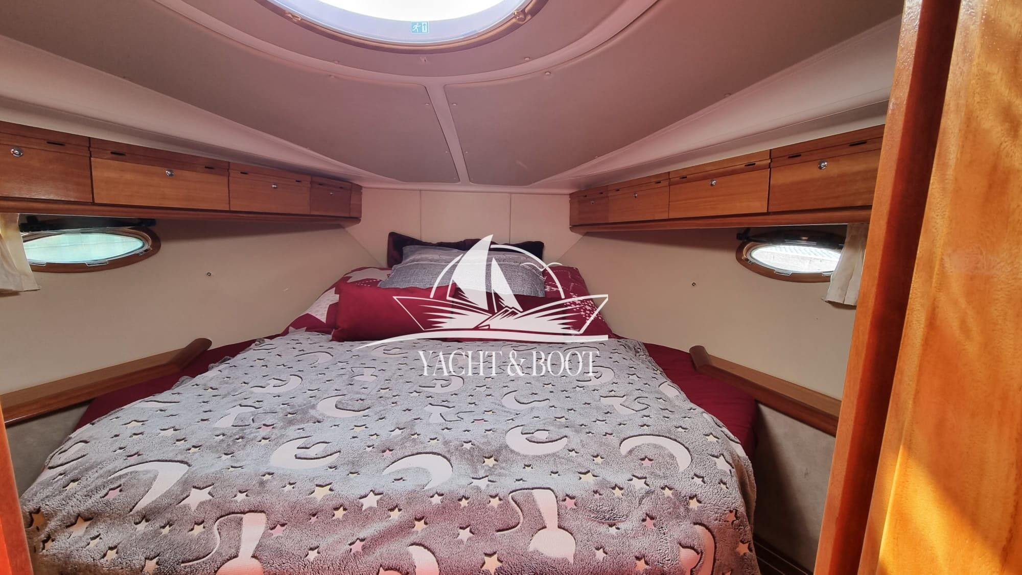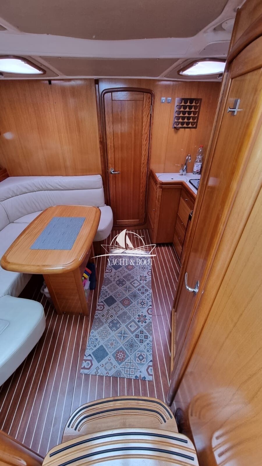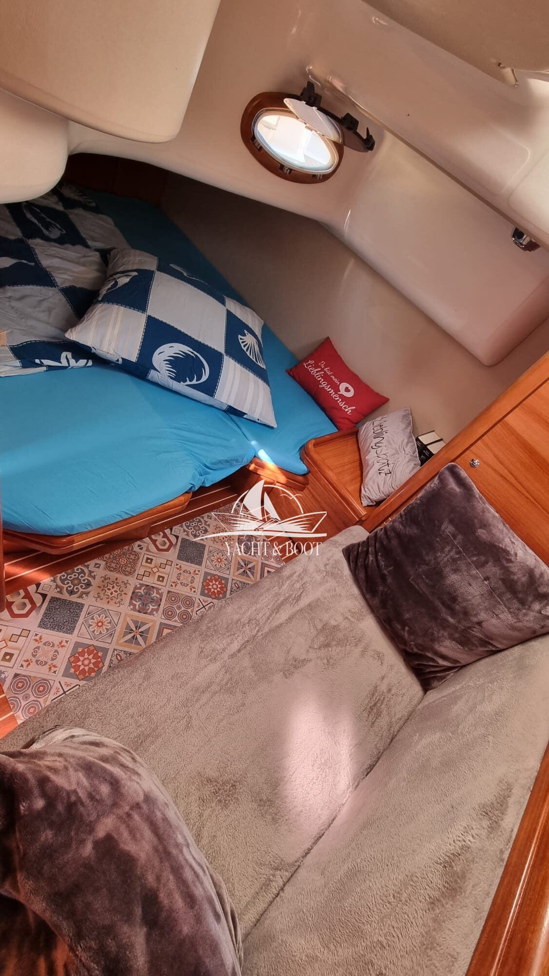 Unter Deck erwartet Sie eine gemütliche, gepflegte Innenausstattung mit zwei Kabinen und insgesamt vier Schlafplätzen. Dank 2 Metern Stehhöhe und einer voll ausgestatteten Pantry mit elektrischem Kühlschrank, Doppelkochfeld, Spüle und Mikrowelle bietet das Boot höchsten Komfort. Das separate Bad verfügt über ein manuelles WC, Waschgelegenheit und einen 70-Liter-Schmutzwassertank.