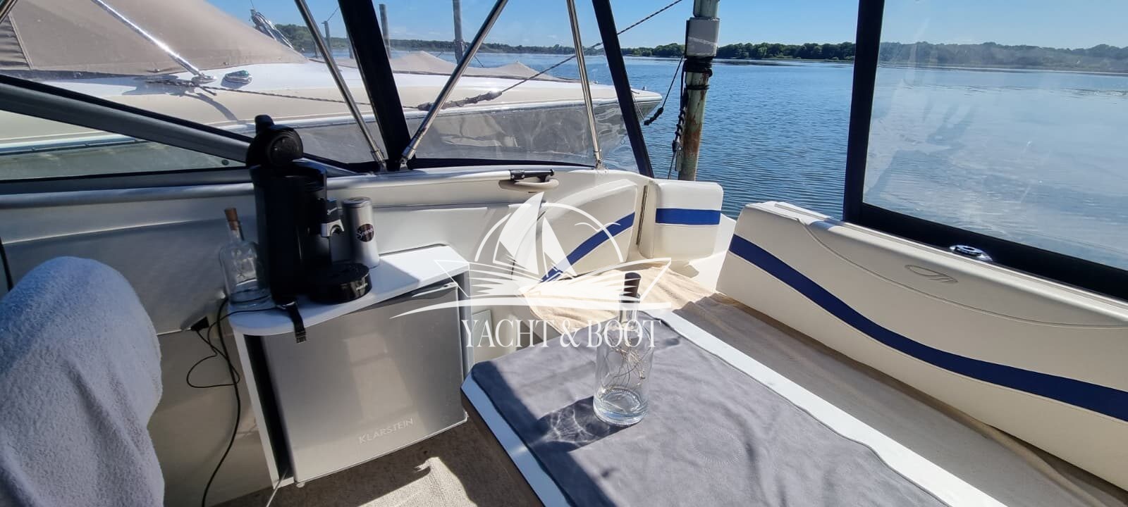 Zur Ausstattung gehören elektrische Trimmklappen, Edelstahlanker, Kartenplotter mit Tiefen-, Geschwindigkeits-, Wassertemperatur- und Grundscanner sowie ein Solarmodul mit 230V-Inverter und Kühlschrank. In der Kajüte befindet sich ein Portapotti.
