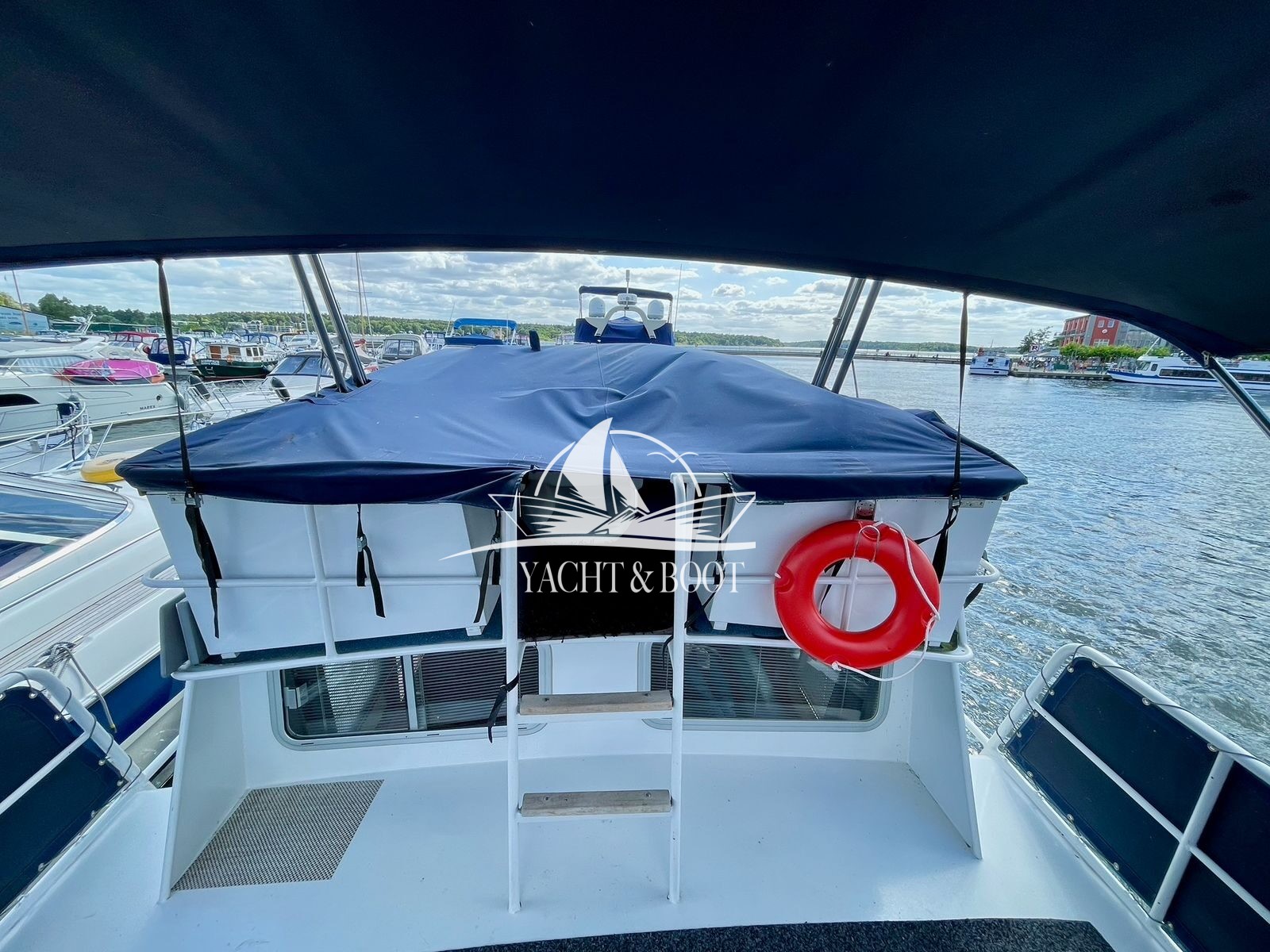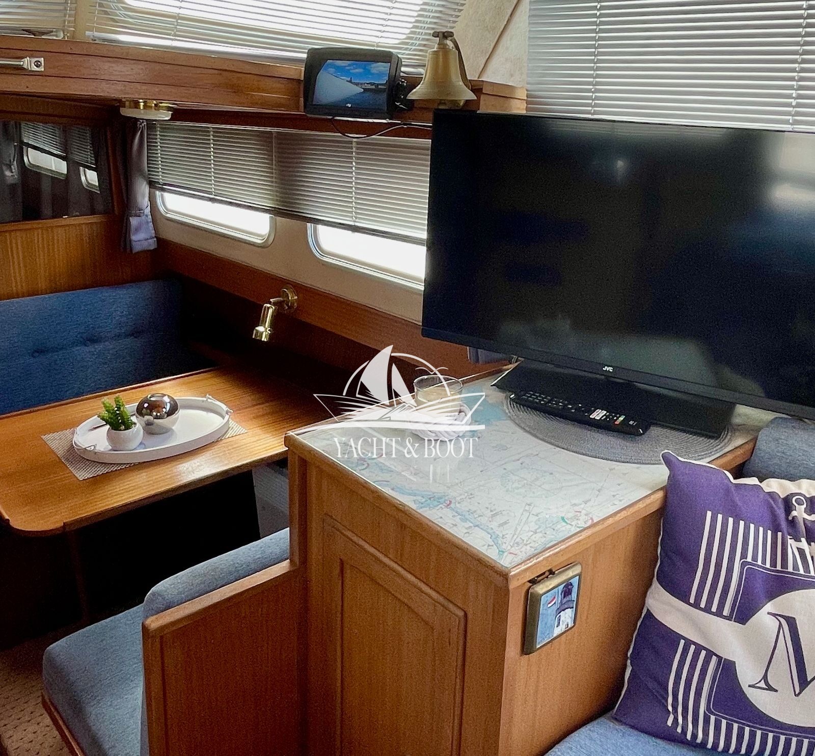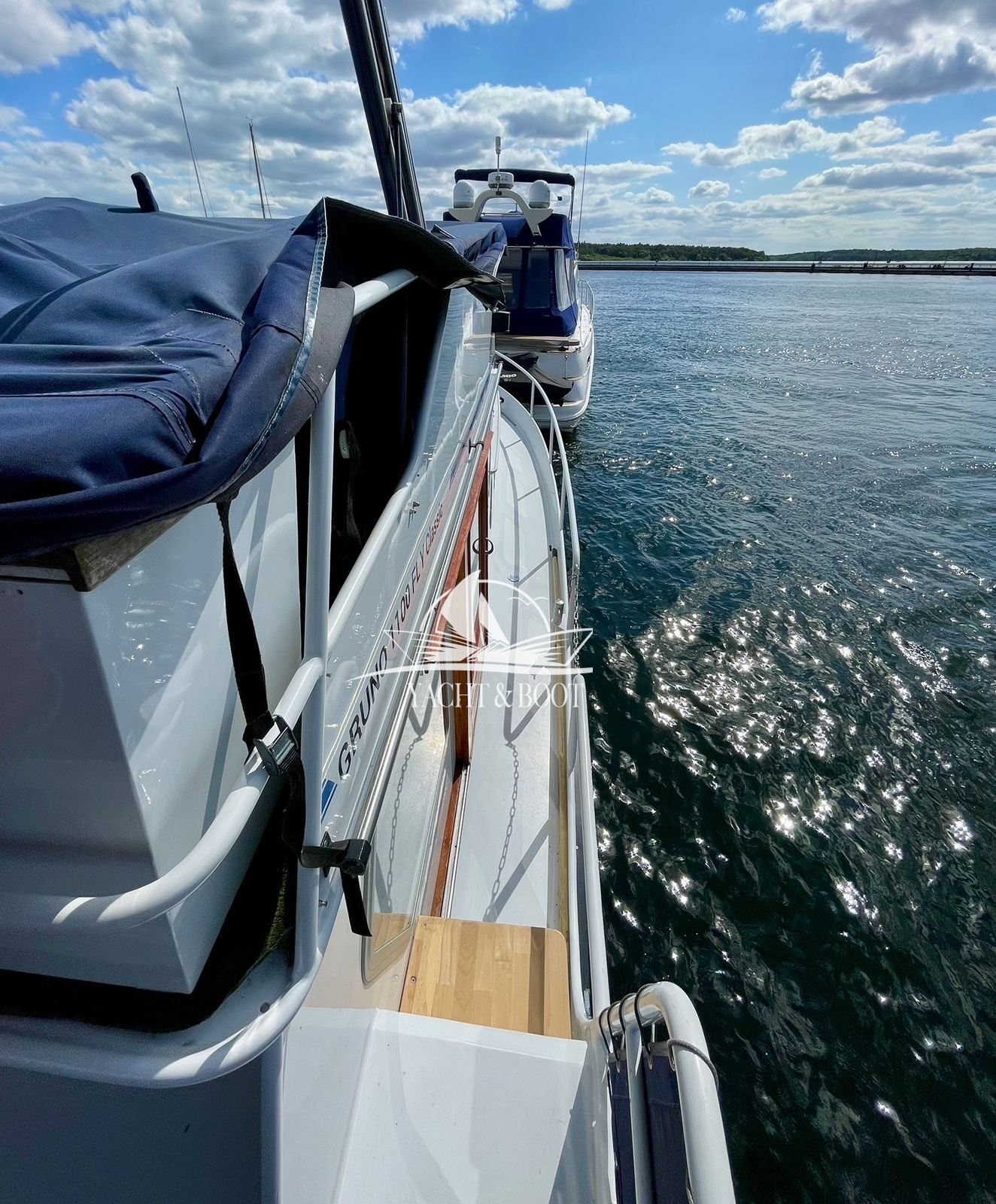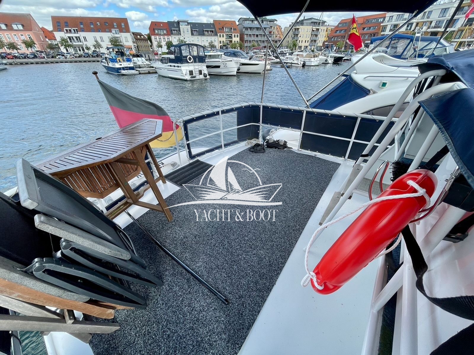 Die Flybridge mit zweitem Steuerstand, Bimini und passender Persenning bietet eine hervorragende Rundumsicht und lädt zu entspannten Fahrten bei jedem Wetter ein. Am Heck erwarten Sie eine Badeplattform, eine neue Badeleiter, Fenderkörbe sowie ein praktischer Cockpittisch – ideal für entspannte Stunden an Deck.