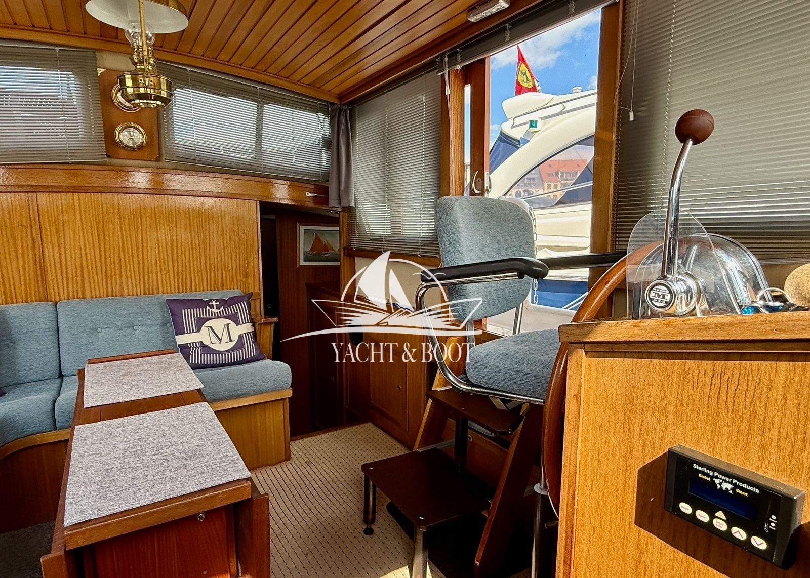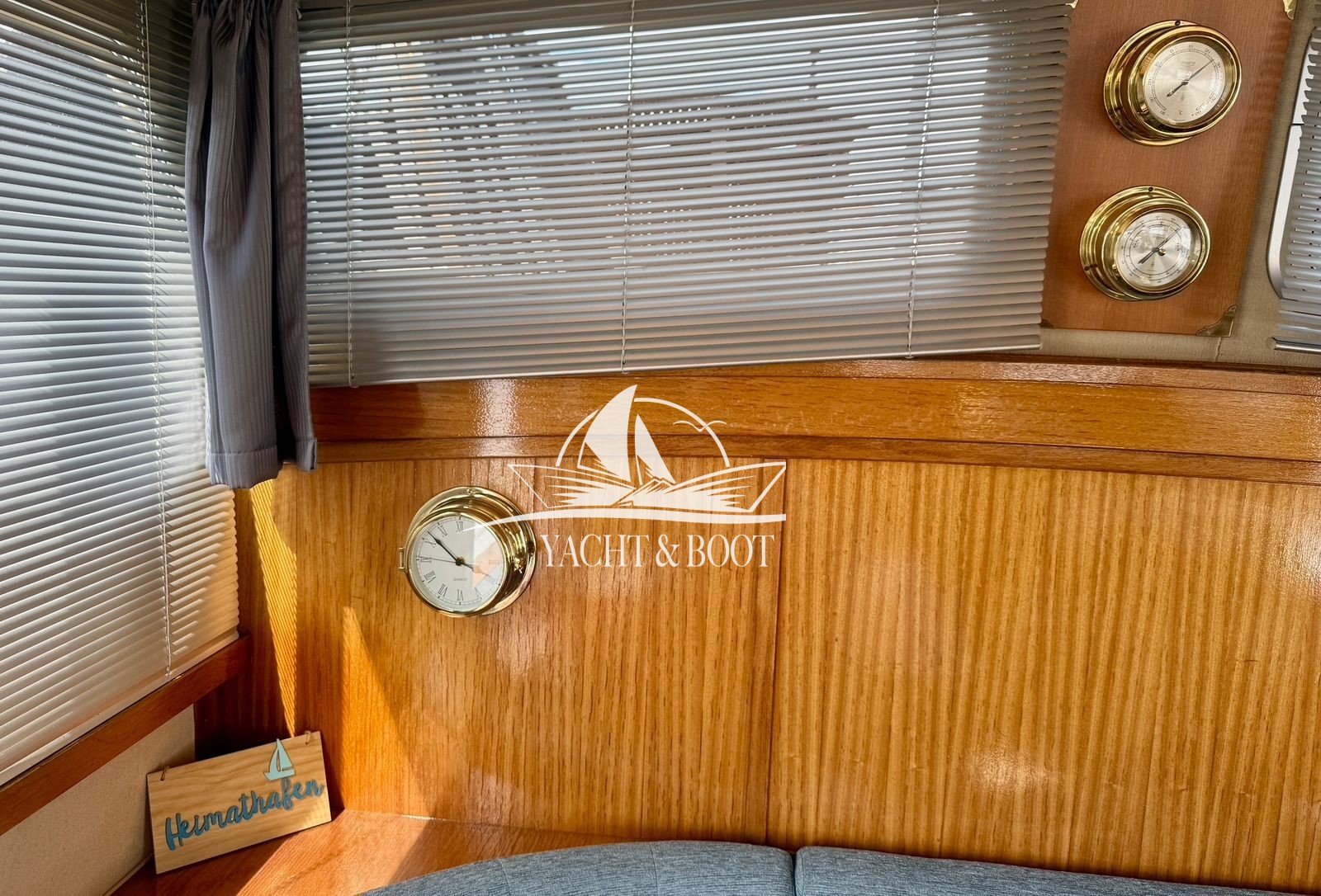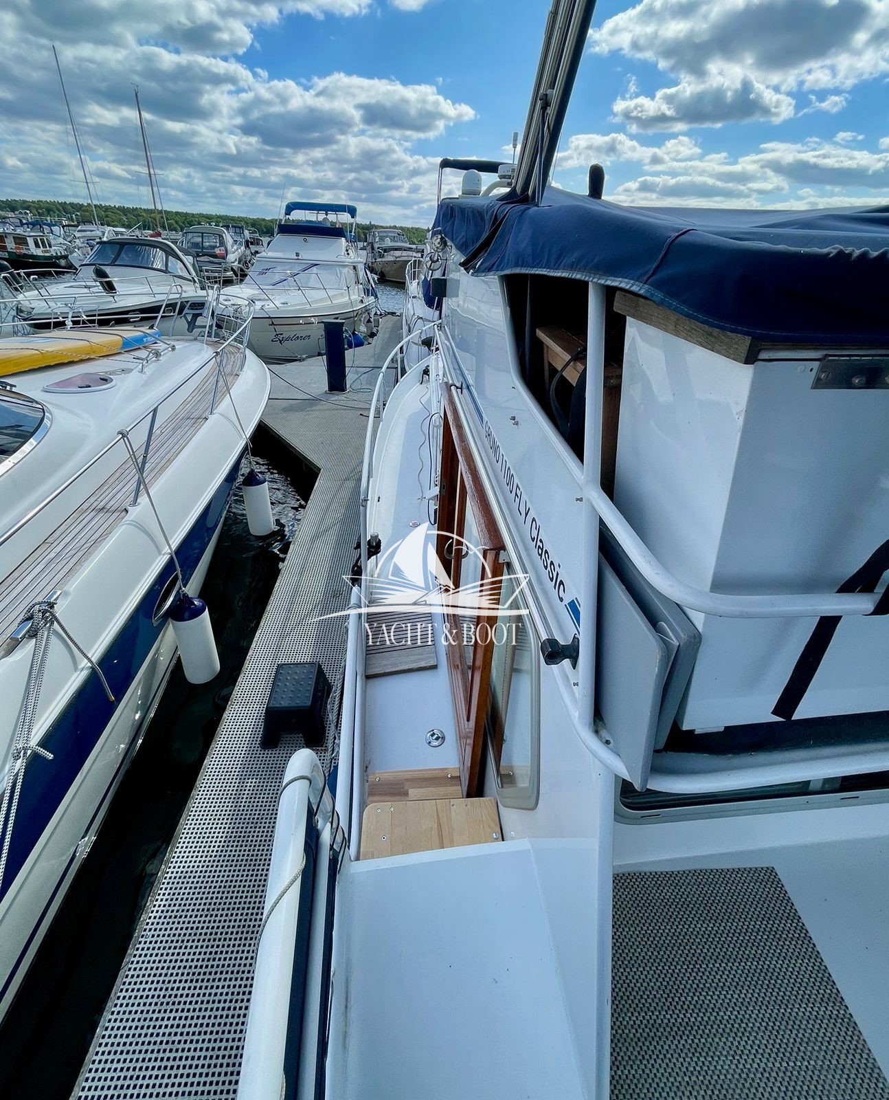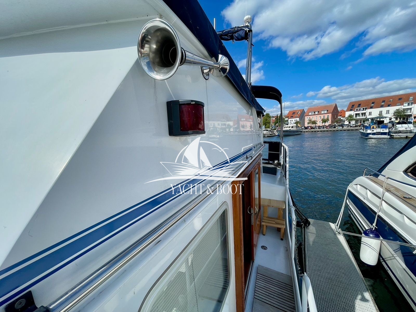 Die Flybridge mit zweitem Steuerstand, Bimini und passender Persenning bietet eine hervorragende Rundumsicht und lädt zu entspannten Fahrten bei jedem Wetter ein. Am Heck erwarten Sie eine Badeplattform, eine neue Badeleiter, Fenderkörbe sowie ein praktischer Cockpittisch – ideal für entspannte Stunden an Deck.