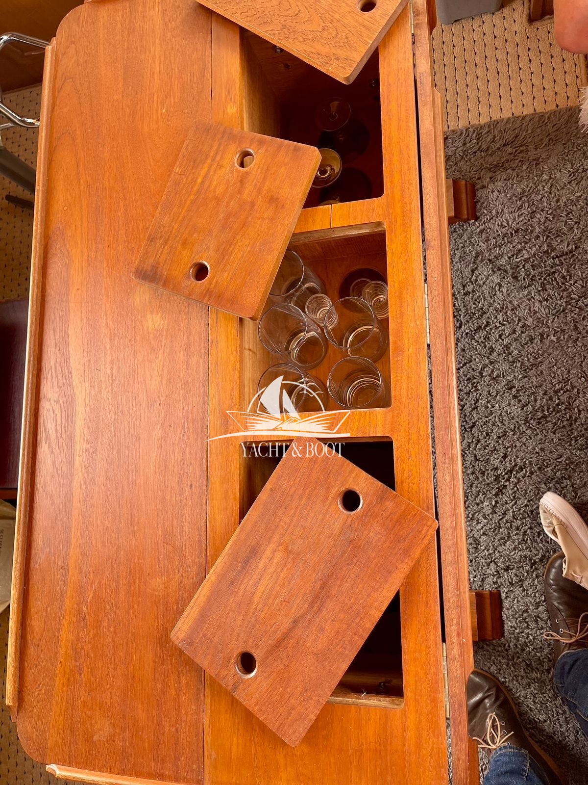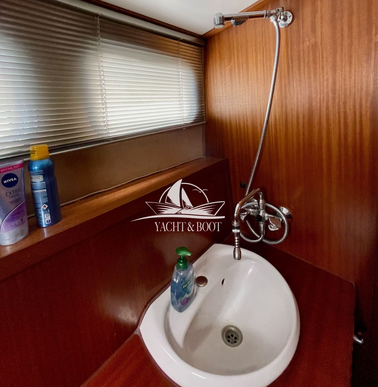 Unter Deck überzeugt die Yacht durch ein großzügiges Raumkonzept mit 1,95 m Stehhöhe, zwei Kabinen und insgesamt vier Kojen. Ein elektrisches WC mit Dusche, eine zusätzliche Außendusche, der helle Salon mit Innensteuerstand sowie die gut ausgestattete Pantry mit Keramikkochfeld, Kühlschrank und Spülbecken bieten besten Komfort auch auf längeren Reisen. Die installierte Dieselheizung ist funktionsbereit, benötigt jedoch eine Wartung.