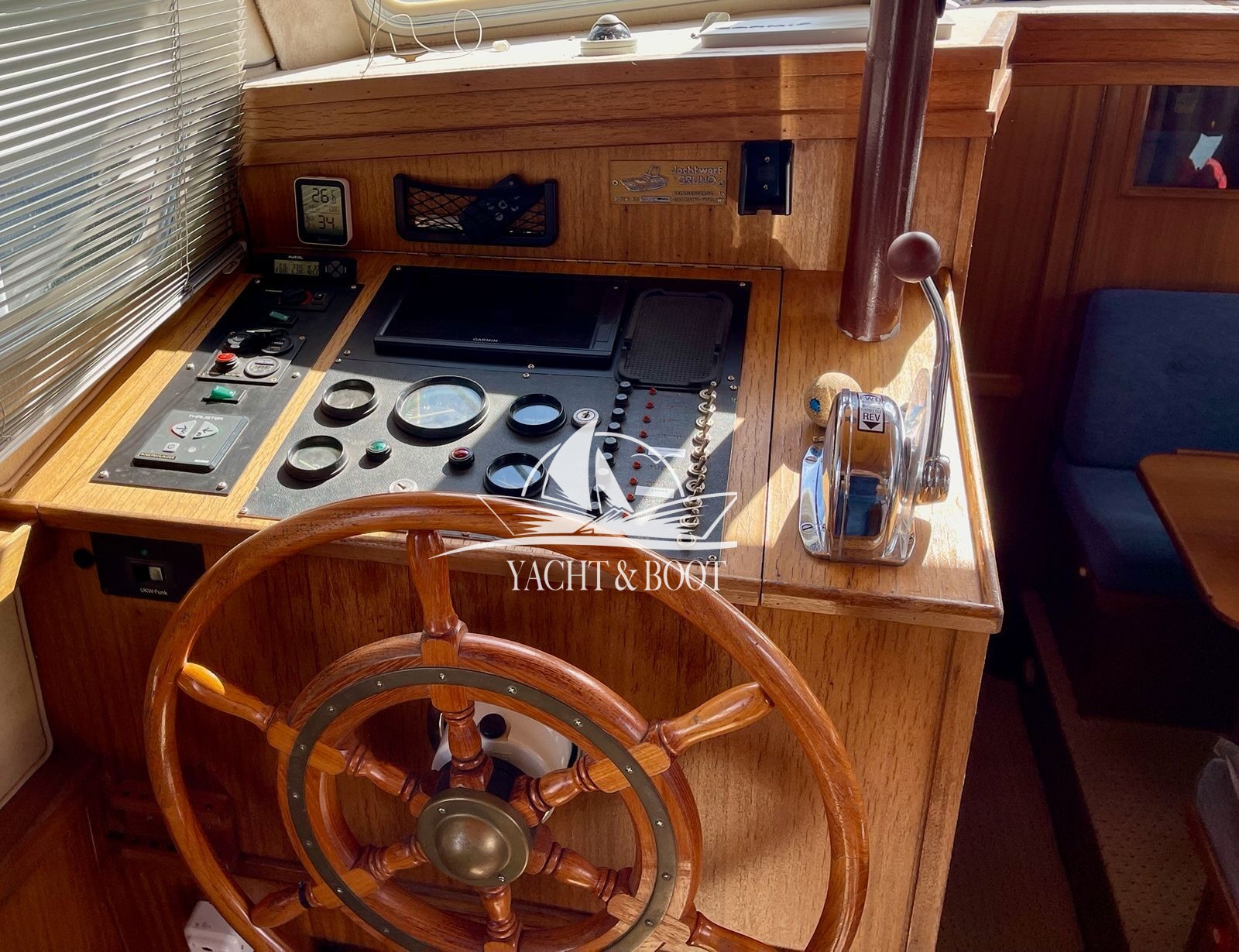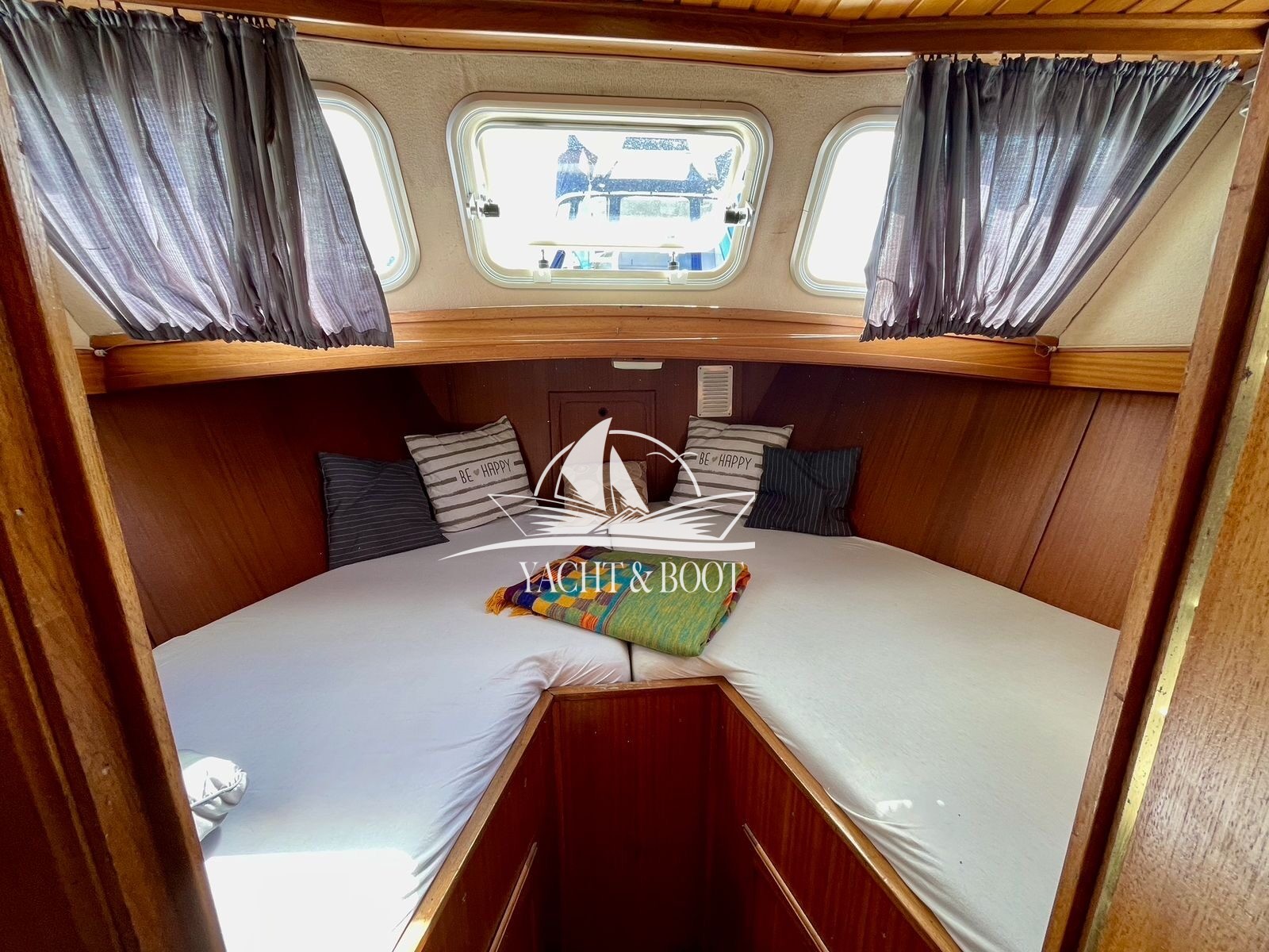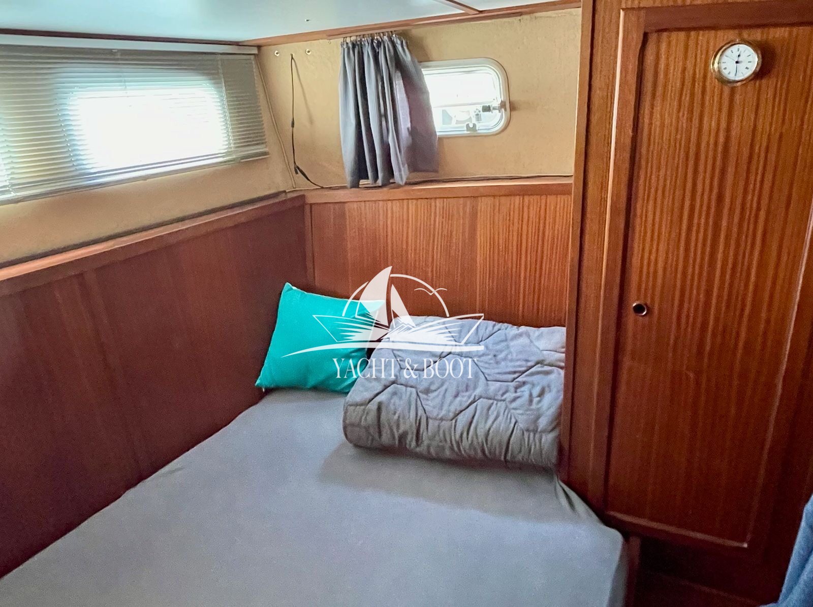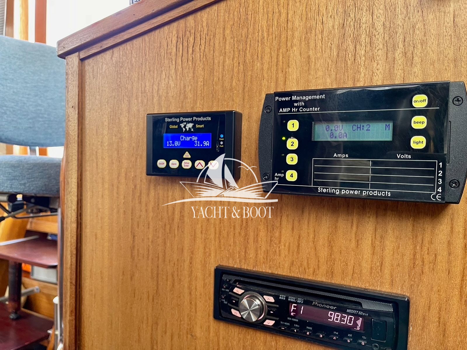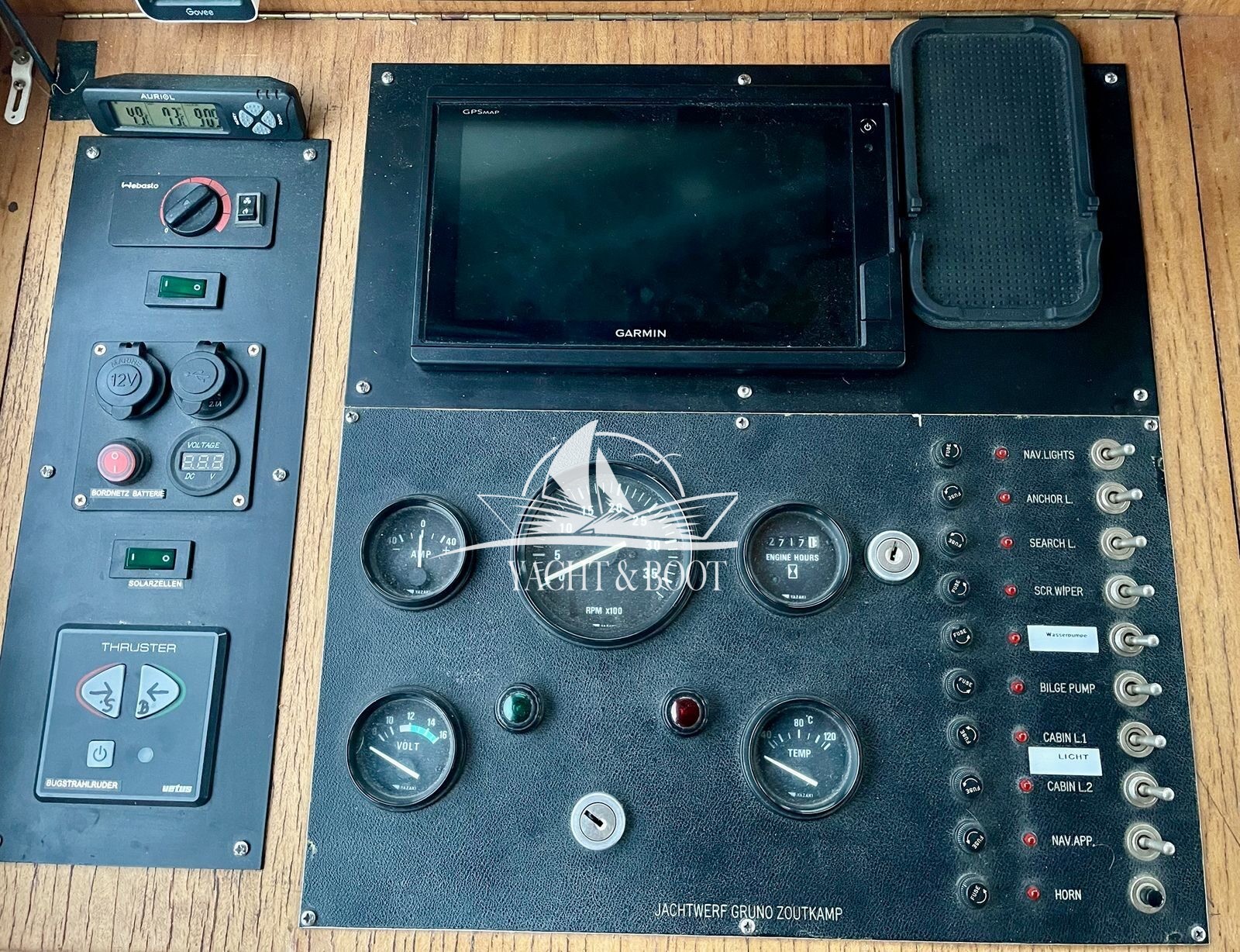 Der solide weiß lackierte Stahlrumpf befindet sich in gutem Zustand und bietet dank sicherer Gangborde und stabiler Relings ein hervorragendes Gefühl an Bord. Angetrieben wird die Yacht von einem zuverlässigen 105-PS-Ford-Dieselmotor, der rund 2700 Betriebsstunden aufweist und 2025 zuletzt gewartet wurde. Mit ihrem ruhigen Laufverhalten, der hydraulischen Steuerung, dem Einhebelmotorsteuerungssystem, dem Bugstrahlruder sowie dem klassischen Wellenantrieb lässt sich die Gruno jederzeit souverän manövrieren. Die Reisegeschwindigkeit liegt bei ca. 8 kn, die maximale Geschwindigkeit bei rund 10 kn.