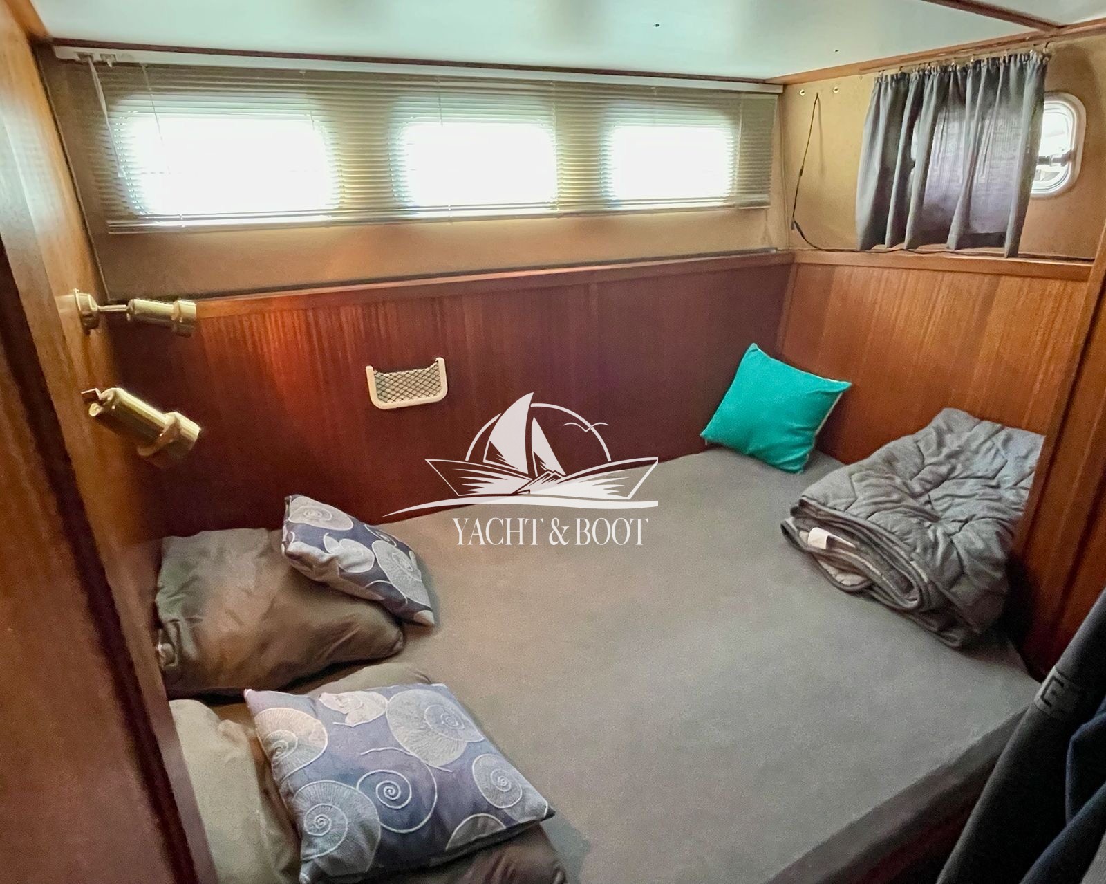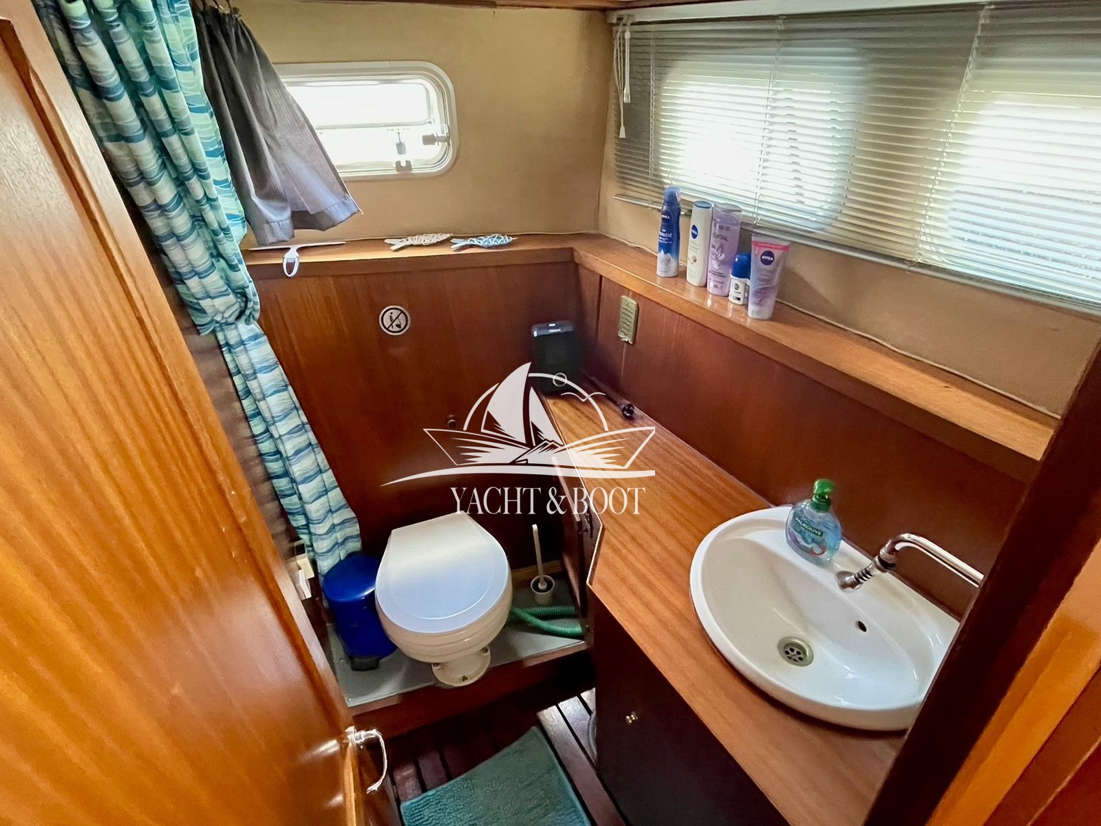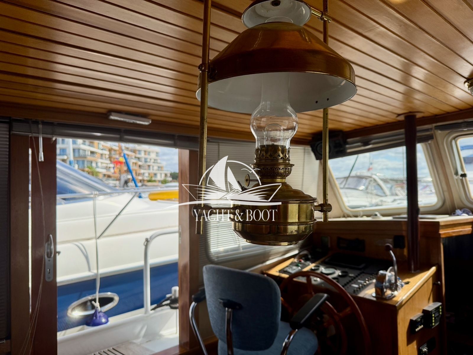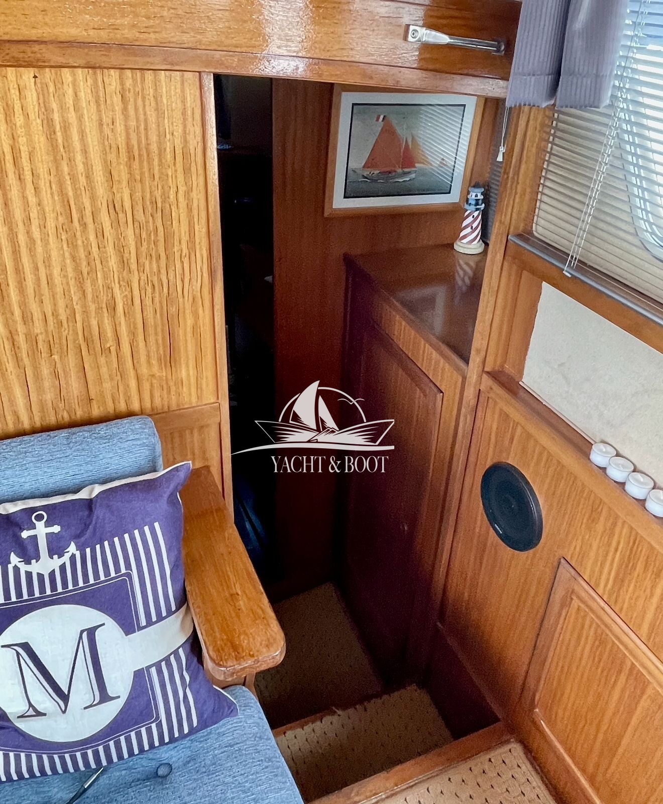 Der solide weiß lackierte Stahlrumpf befindet sich in gutem Zustand und bietet dank sicherer Gangborde und stabiler Relings ein hervorragendes Gefühl an Bord. Angetrieben wird die Yacht von einem zuverlässigen 105-PS-Ford-Dieselmotor, der rund 2700 Betriebsstunden aufweist und 2025 zuletzt gewartet wurde. Mit ihrem ruhigen Laufverhalten, der hydraulischen Steuerung, dem Einhebelmotorsteuerungssystem, dem Bugstrahlruder sowie dem klassischen Wellenantrieb lässt sich die Gruno jederzeit souverän manövrieren. Die Reisegeschwindigkeit liegt bei ca. 8 kn, die maximale Geschwindigkeit bei rund 10 kn.