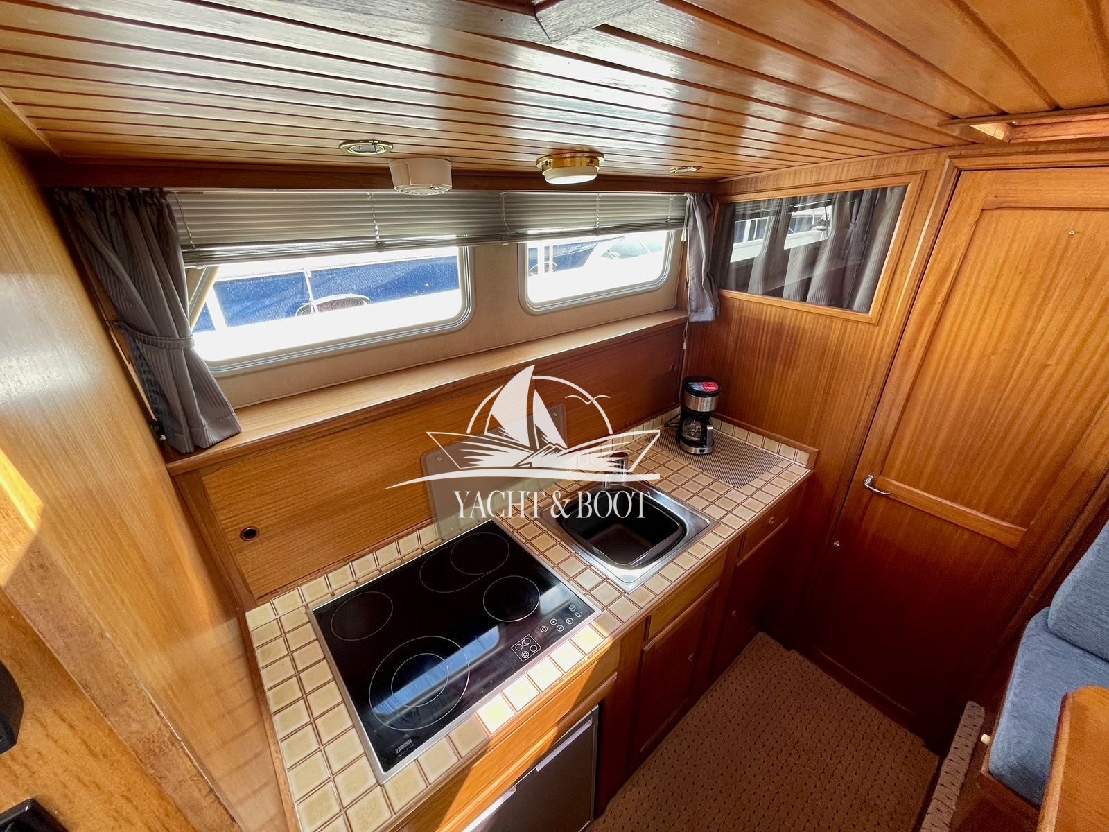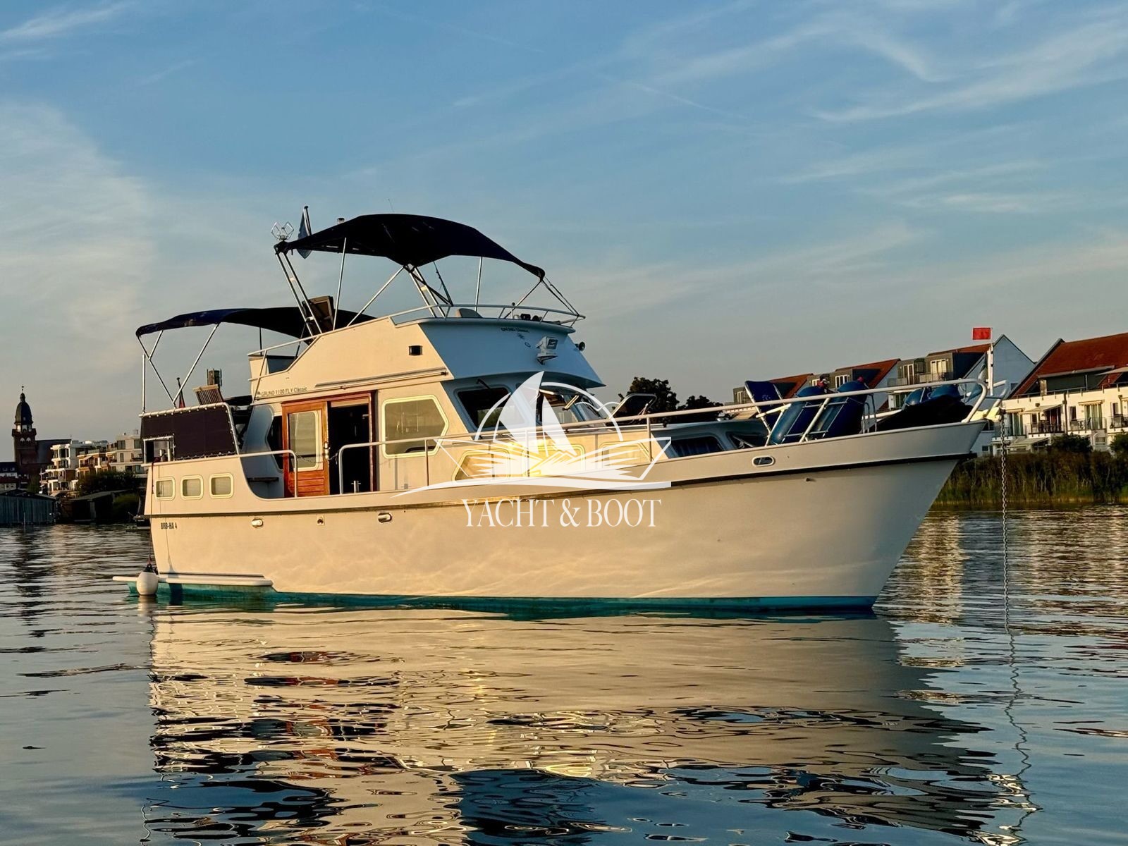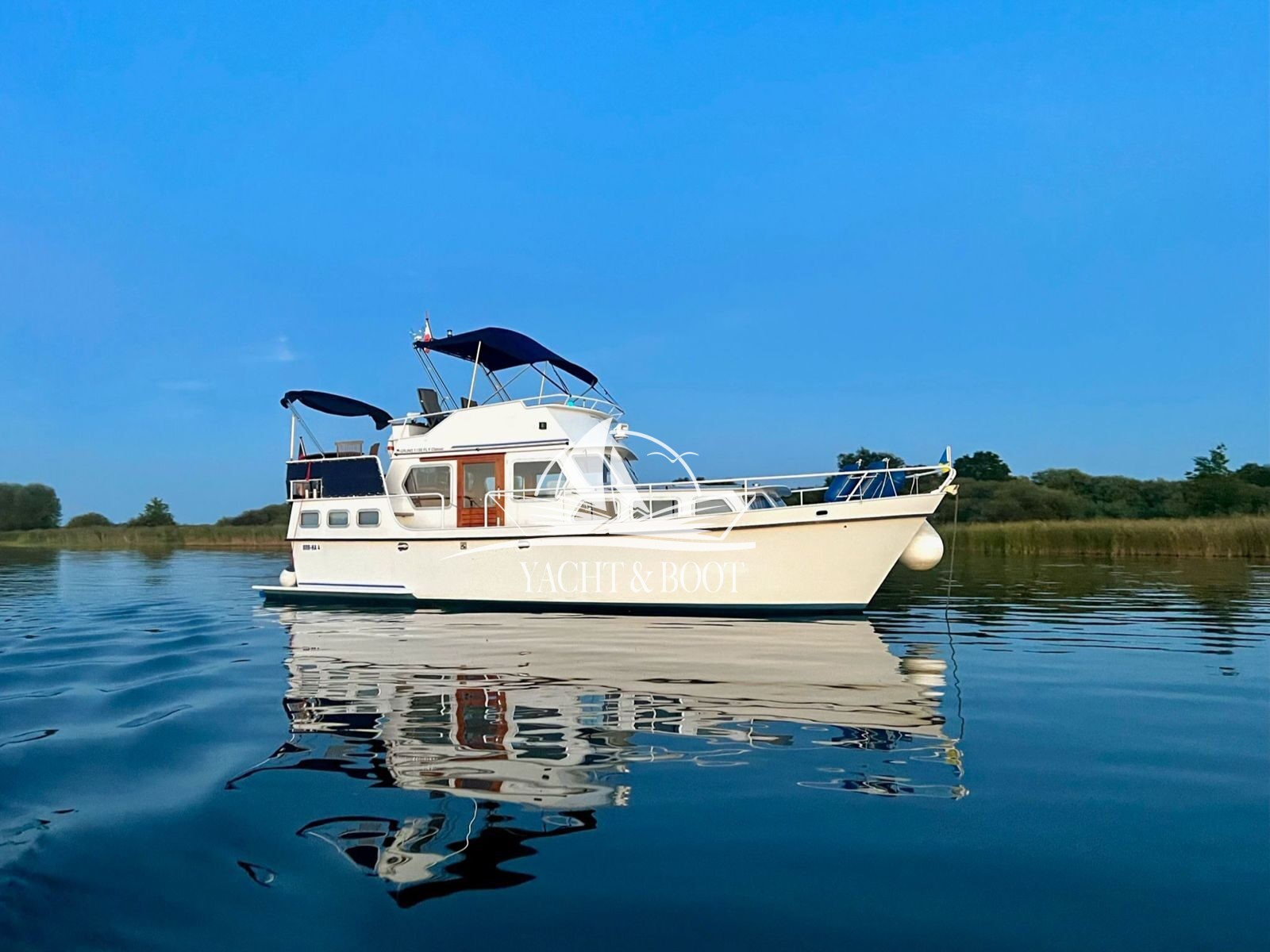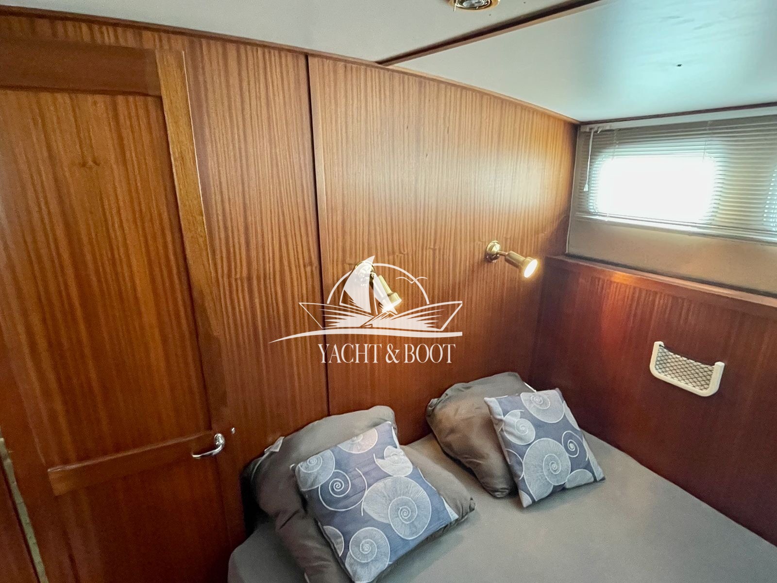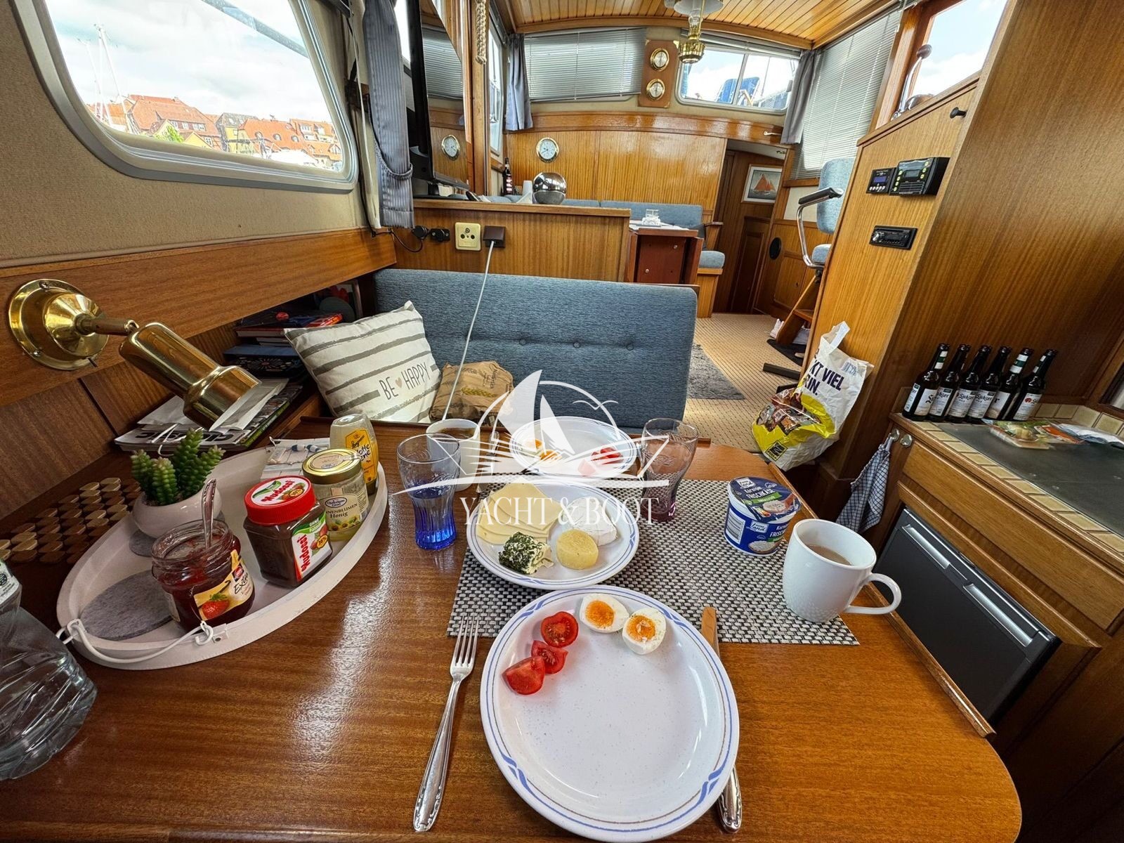 Der solide weiß lackierte Stahlrumpf befindet sich in gutem Zustand und bietet dank sicherer Gangborde und stabiler Relings ein hervorragendes Gefühl an Bord. Angetrieben wird die Yacht von einem zuverlässigen 105-PS-Ford-Dieselmotor, der rund 2700 Betriebsstunden aufweist und 2025 zuletzt gewartet wurde. Mit ihrem ruhigen Laufverhalten, der hydraulischen Steuerung, dem Einhebelmotorsteuerungssystem, dem Bugstrahlruder sowie dem klassischen Wellenantrieb lässt sich die Gruno jederzeit souverän manövrieren. Die Reisegeschwindigkeit liegt bei ca. 8 kn, die maximale Geschwindigkeit bei rund 10 kn.