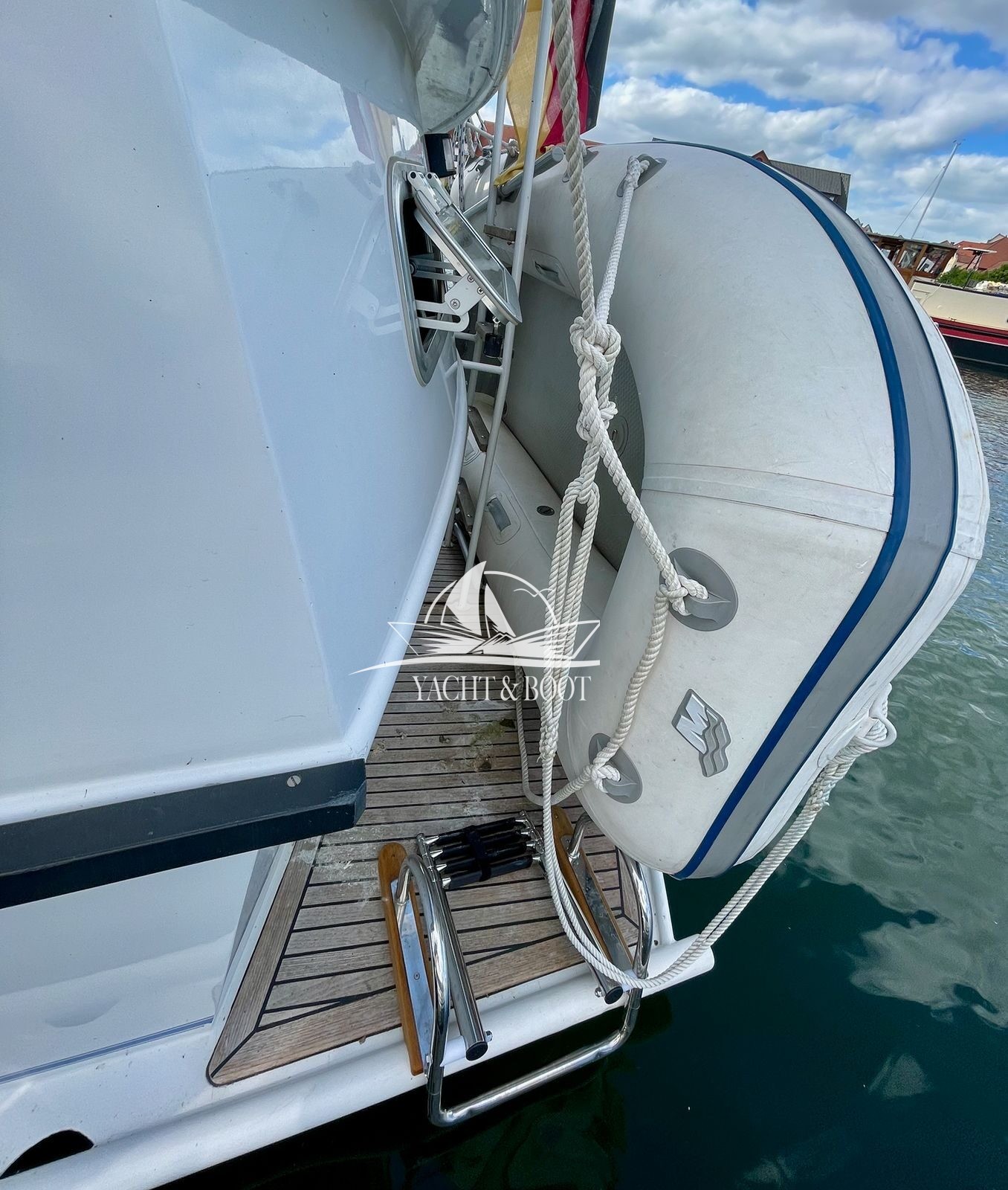 Zum Lieferumfang gehören ein Schlauchboot (ohne Motor), sechs Fender, Festmacherleinen, Bootshaken, Paddel, Klappmöbel für das Achterdeck, ein Pflugscharanker mit Kette sowie diverse Abdeckungen, darunter die Flybridge-Persenning und Innenjalousien.