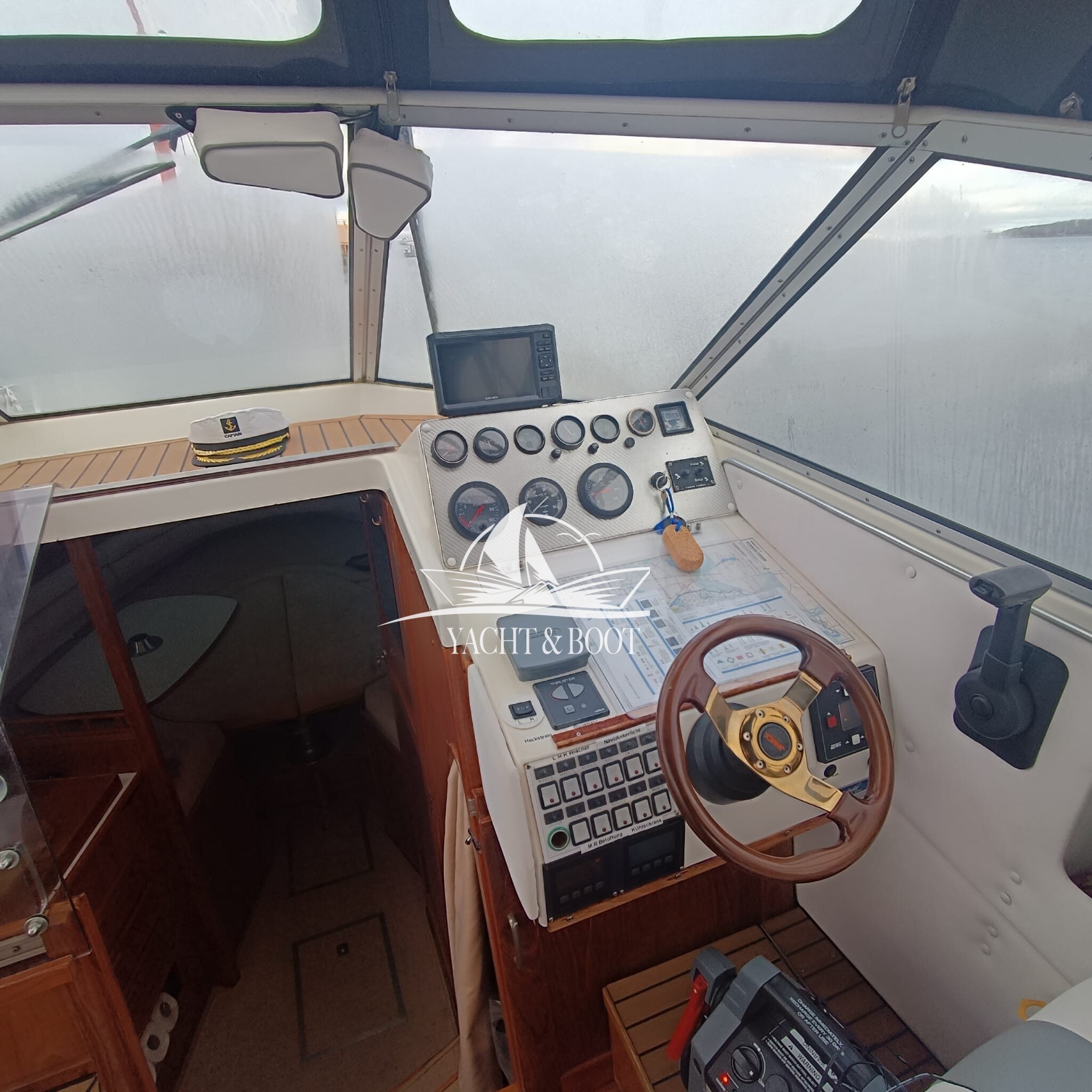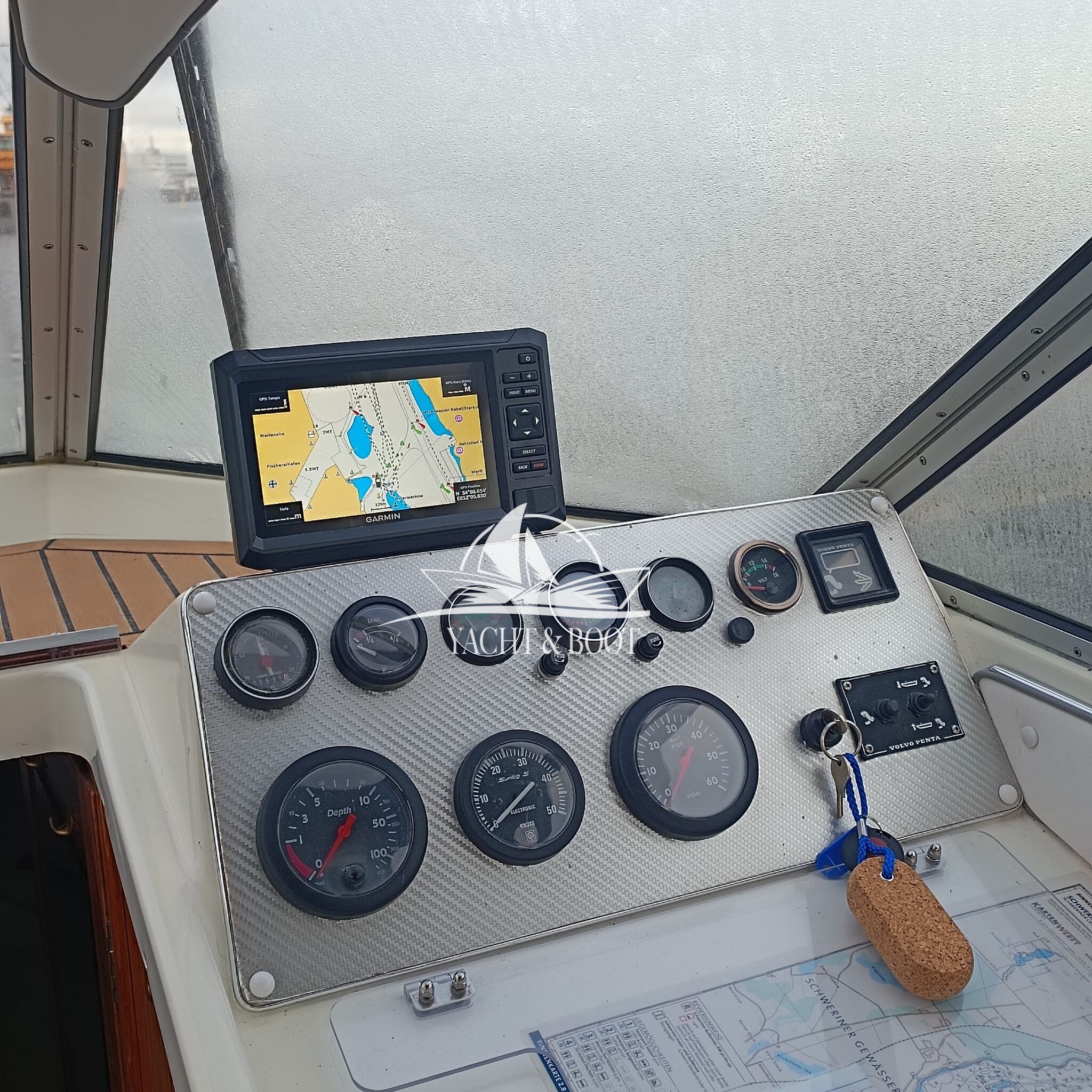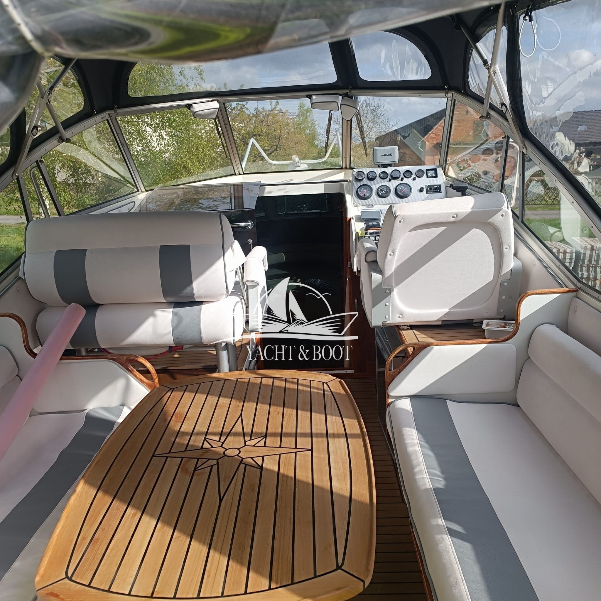 Angetrieben wird sie von einem zuverlässigen Volvo-Penta-Benzinmotor mit kraftvollen 260 PS, der das Boot mühelos ins Gleiten bringt und zugleich ruhige, souveräne Manöver ermöglicht. Der Z-Antrieb sorgt für hohe Wendigkeit und präzise Steuerbarkeit – ideal für Hafenmanöver oder enge Passagen.