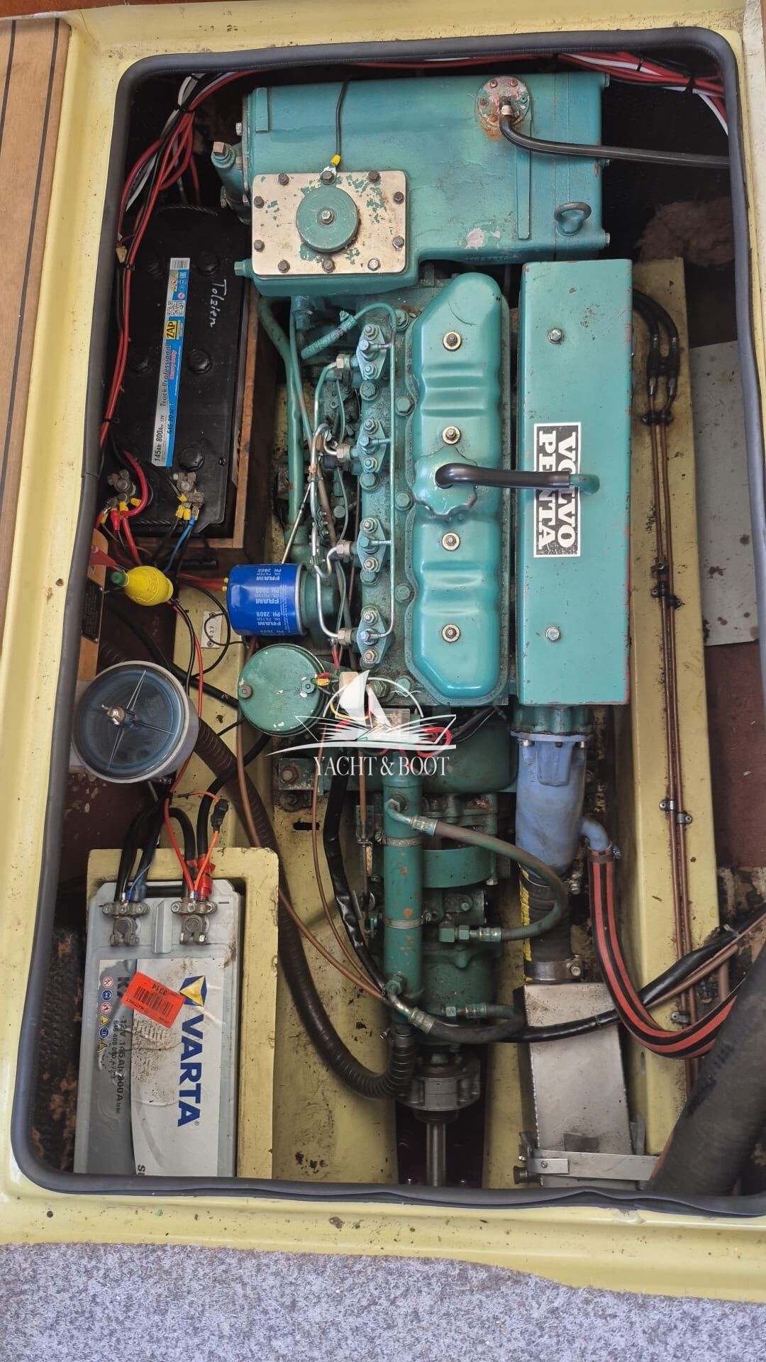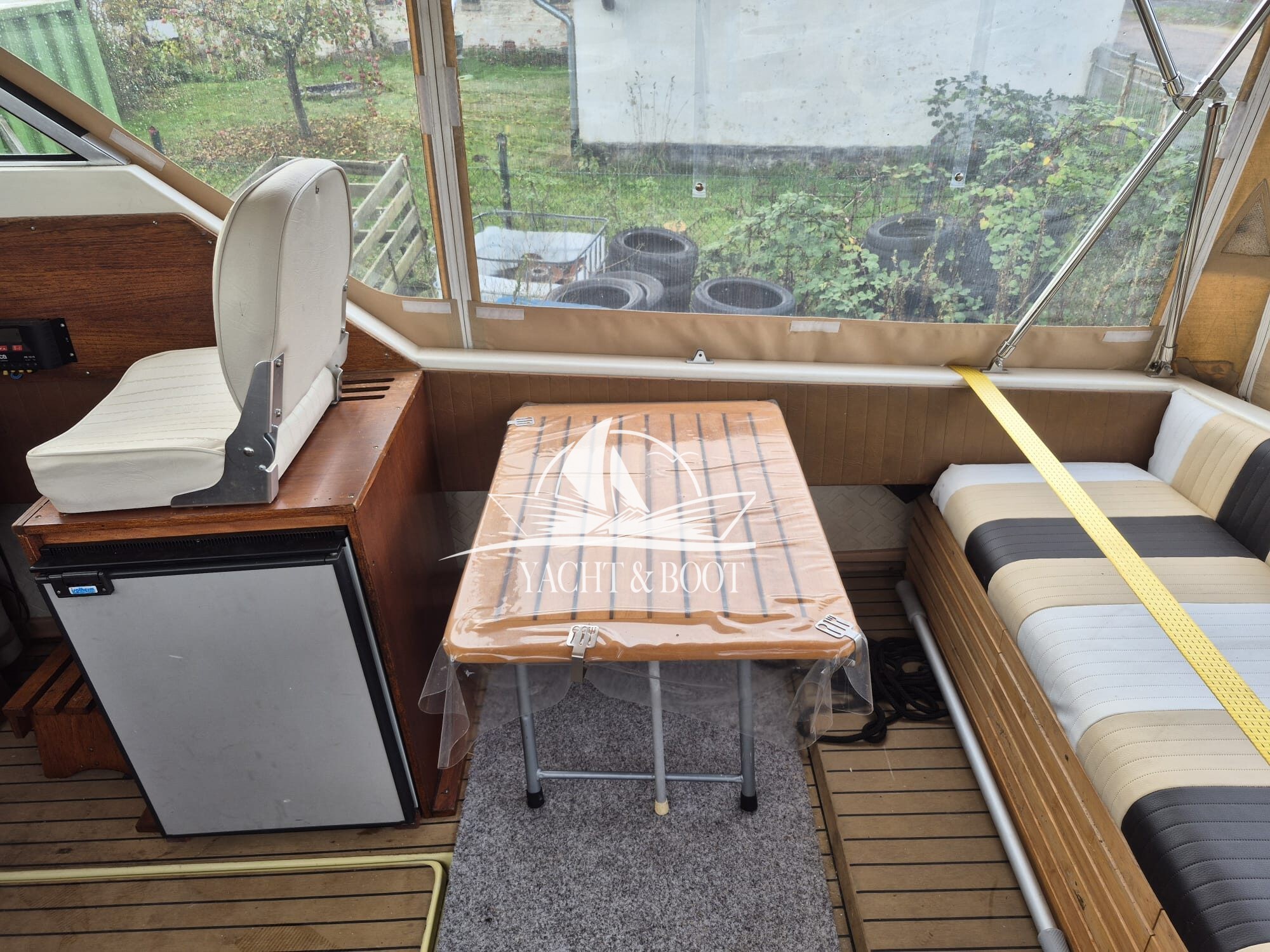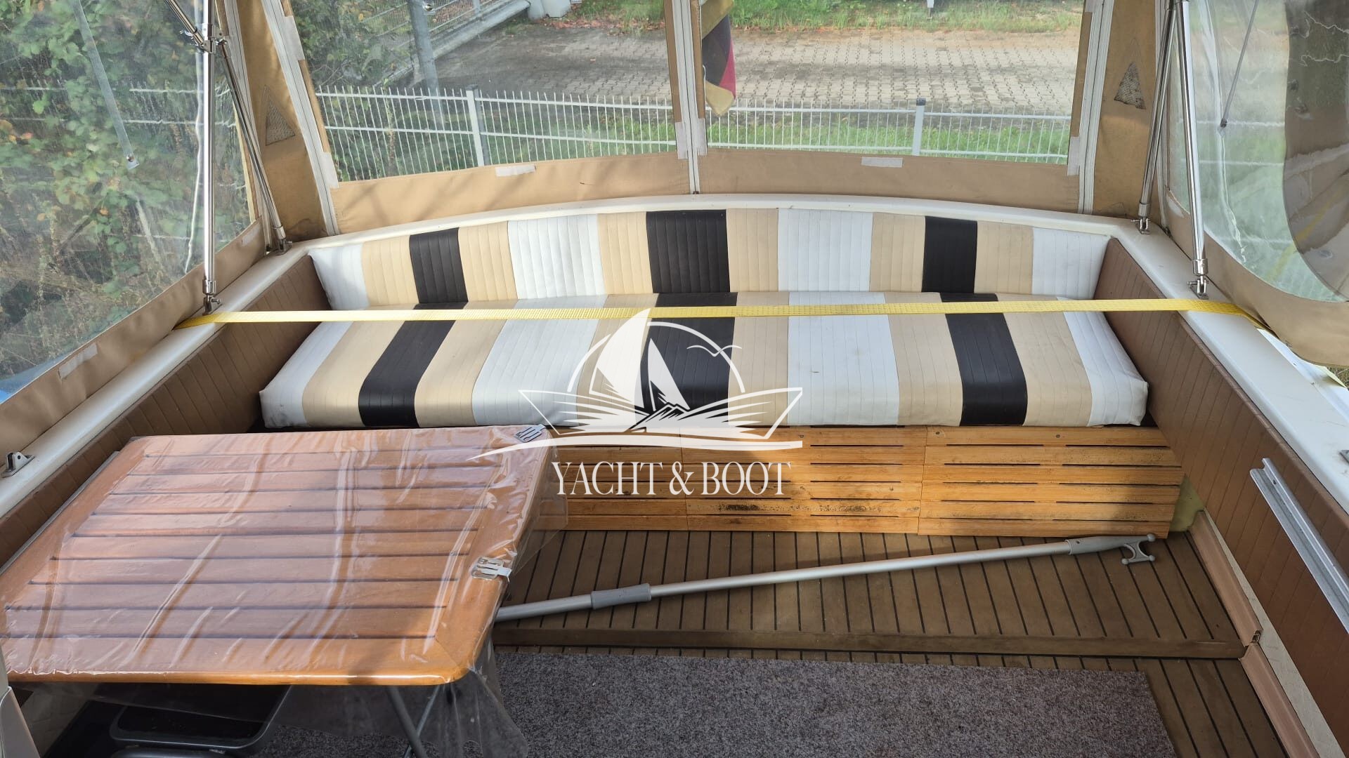 Das Boot befindet sich in einem befriedigenden, funktionalen Zustand mit altersentsprechenden Spuren. Die Persenning ist dicht, weist jedoch Stockflecken auf, und insgesamt wäre eine gründliche Reinigung empfehlenswert. Es handelt sich um ein ehrliches Gebrauchtboot mit solider Grundlage und realistischem Potenzial zur eigenen Aufwertung.