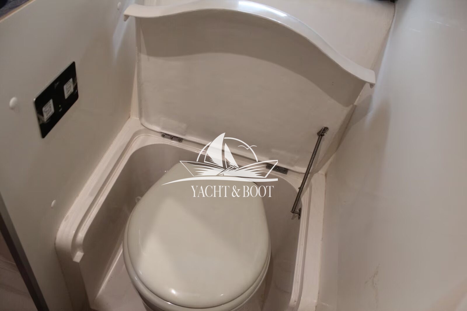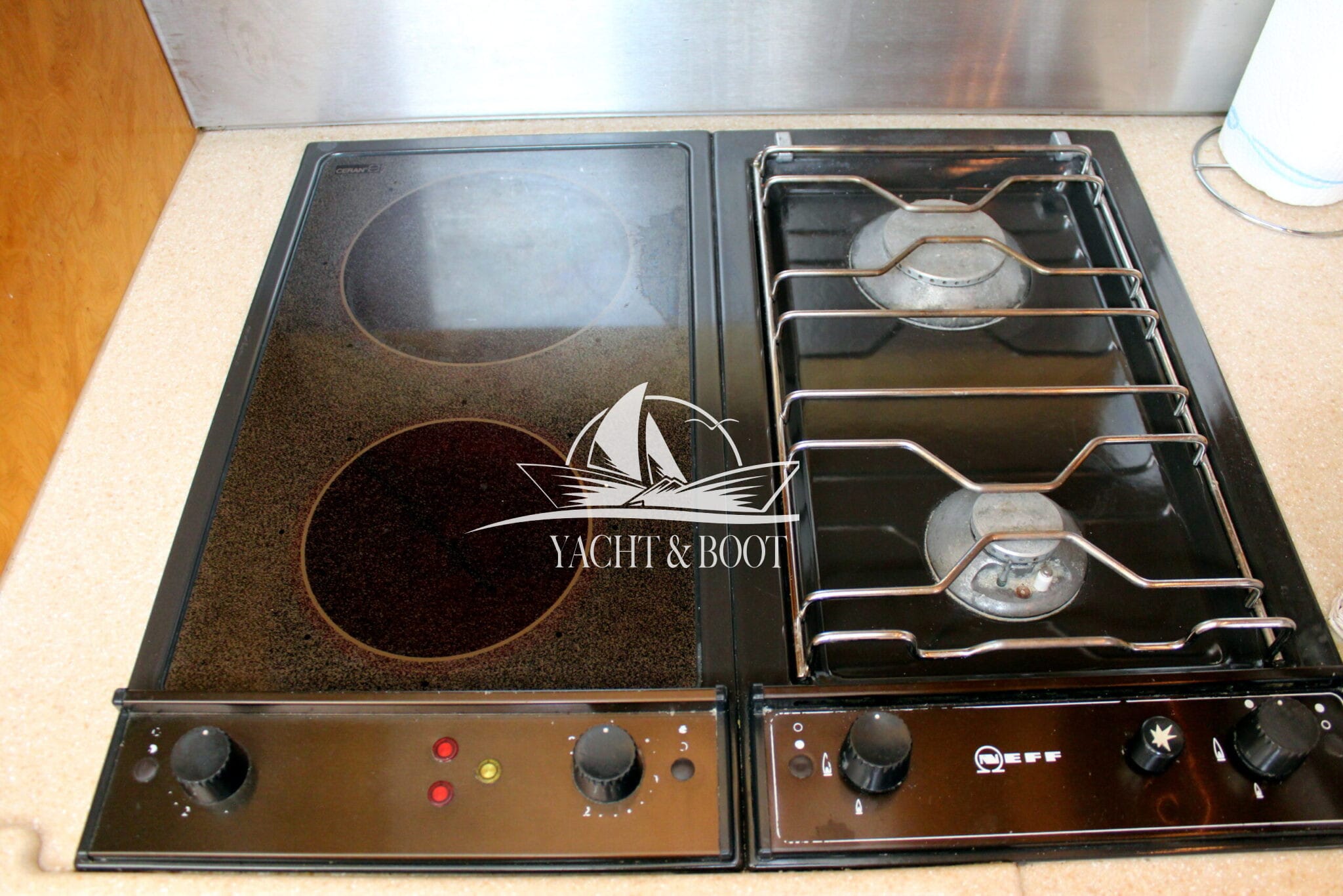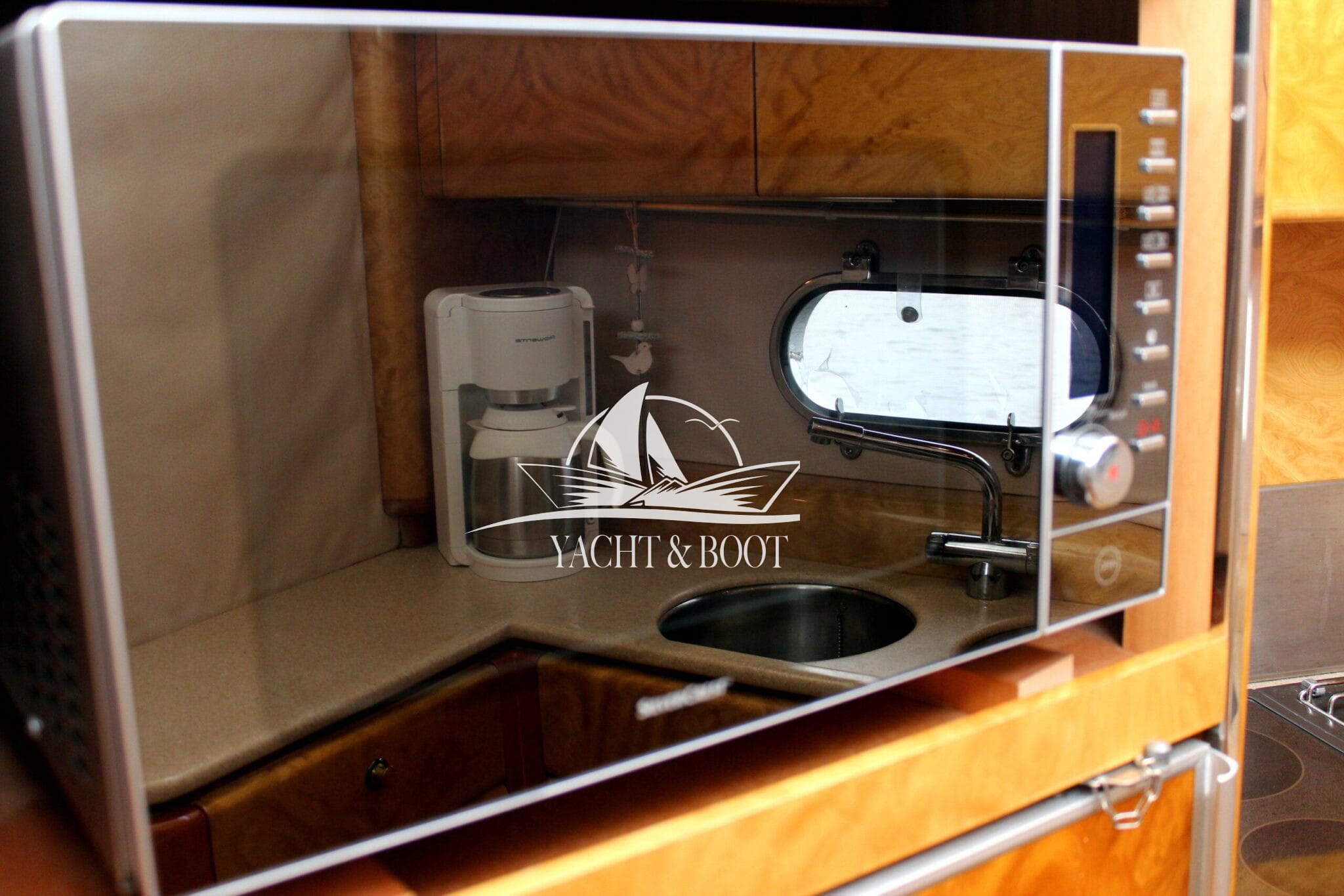 Salon und Cockpit liegen auf einer Ebene – verbunden durch eine große Edelstahlschiebetür. Die Flybridge mit Rundsitzgruppe, Fahrbank, Sonnenliege & Bimini bietet reichlich Platz zum Genießen. Pantry mit Mikrowellen-/Ofenkombi, Herd (Gas & elektrisch), großer Kühl-/Gefrierkombi, Edelstahlspüle und Stauraum.