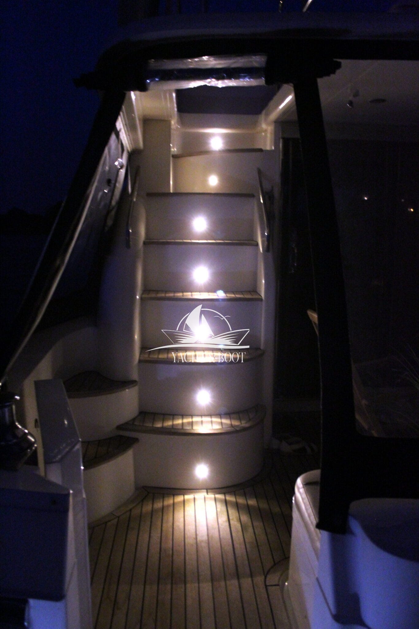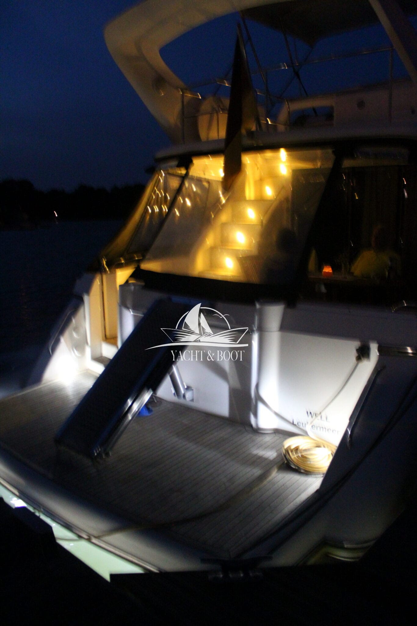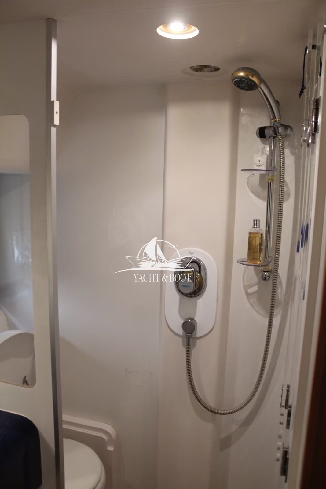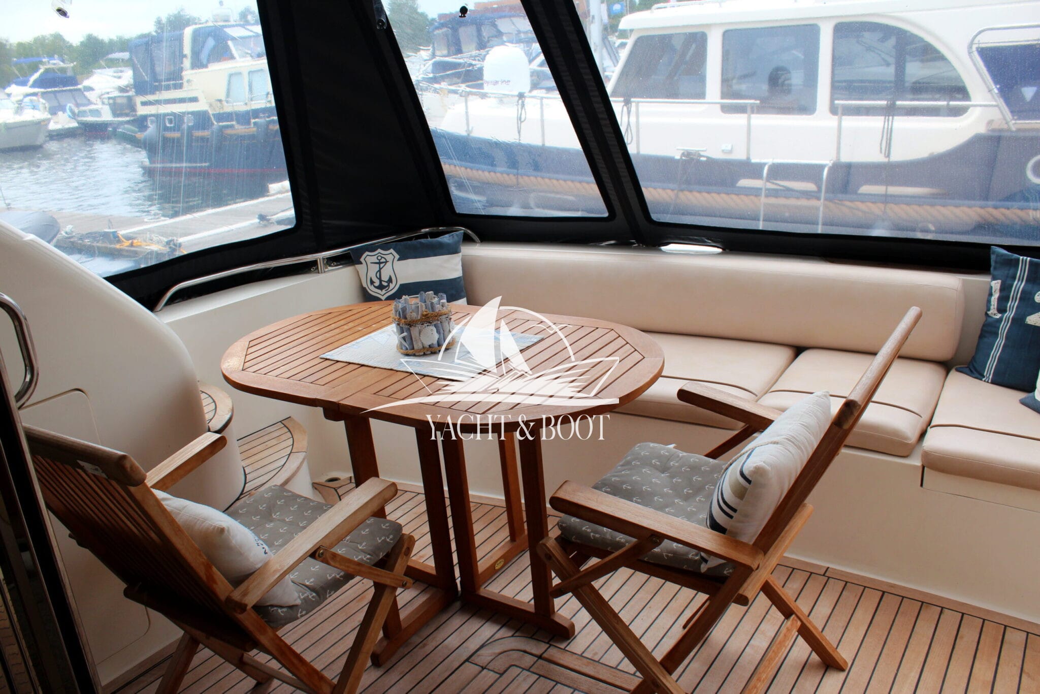 Salon und Cockpit liegen auf einer Ebene – verbunden durch eine große Edelstahlschiebetür. Die Flybridge mit Rundsitzgruppe, Fahrbank, Sonnenliege & Bimini bietet reichlich Platz zum Genießen. Pantry mit Mikrowellen-/Ofenkombi, Herd (Gas & elektrisch), großer Kühl-/Gefrierkombi, Edelstahlspüle und Stauraum.