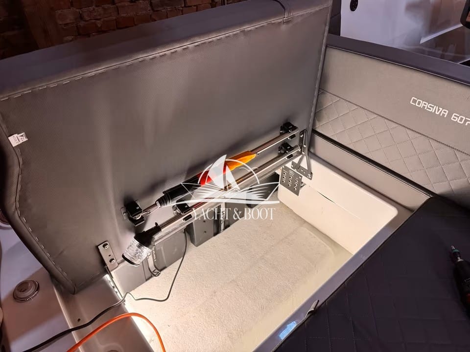 Für maximale Unabhängigkeit außerhalb des Wassers gehört ein neuer Ohlmeier Bootsanhänger mit elektrischer Winde zum Paket. Der Trailer ermöglicht komfortables Slippen, sicheres Auf- und Abladen sowie flexible Transportmobilität zwischen Revieren. Die elektrische Winde reduziert Kraftaufwand und erhöht die Kontrolle beim Trailern erheblich, was besonders bei hochwertigen Daycruisern ein entscheidender Vorteil ist. Damit ist die Corsiva 607 nicht nur ein luxuriöser Cruiser auf dem Wasser, sondern auch ein vollständig mobiles System für spontane Revierwechsel und unkomplizierte Winterlagerung.