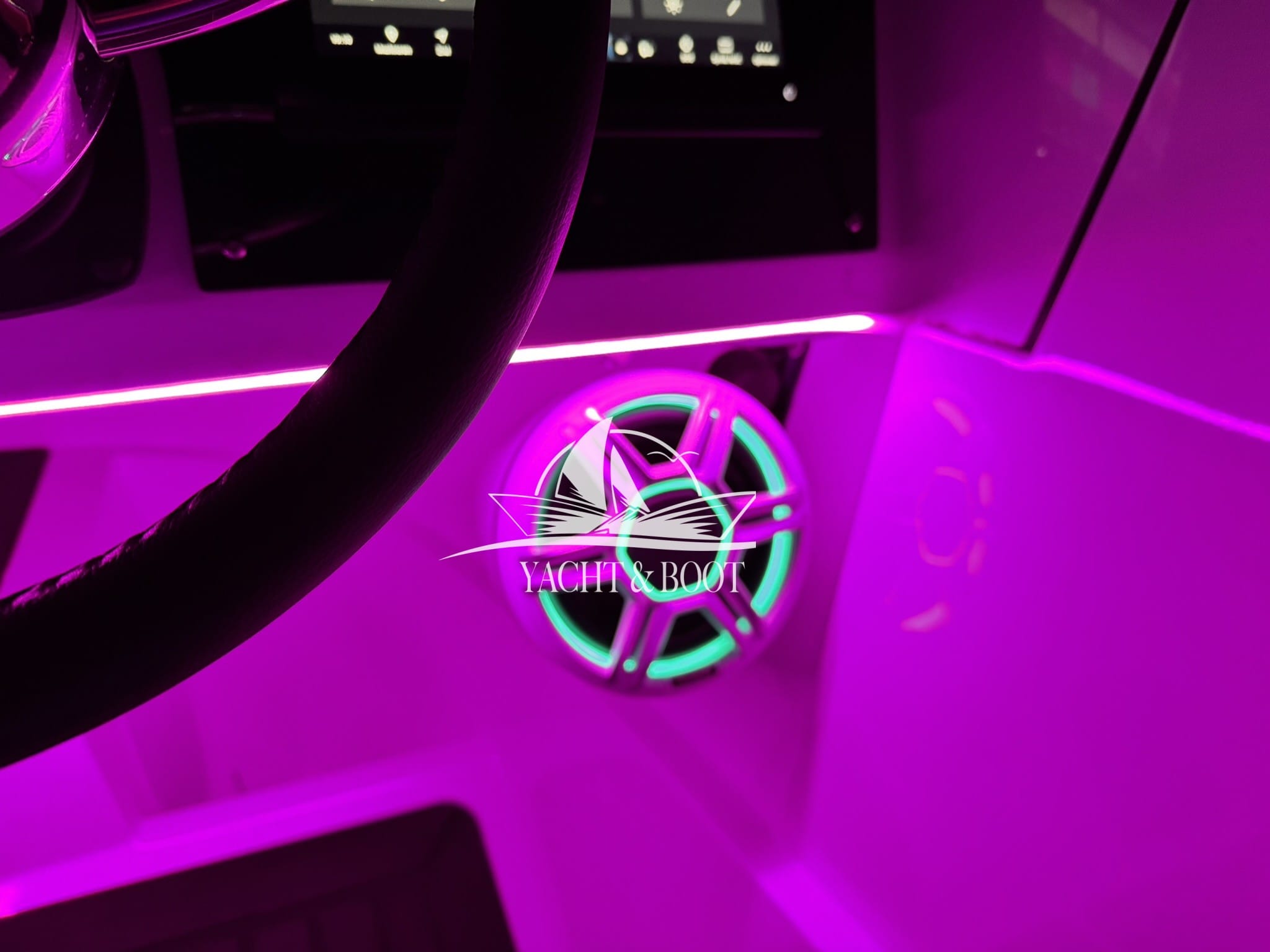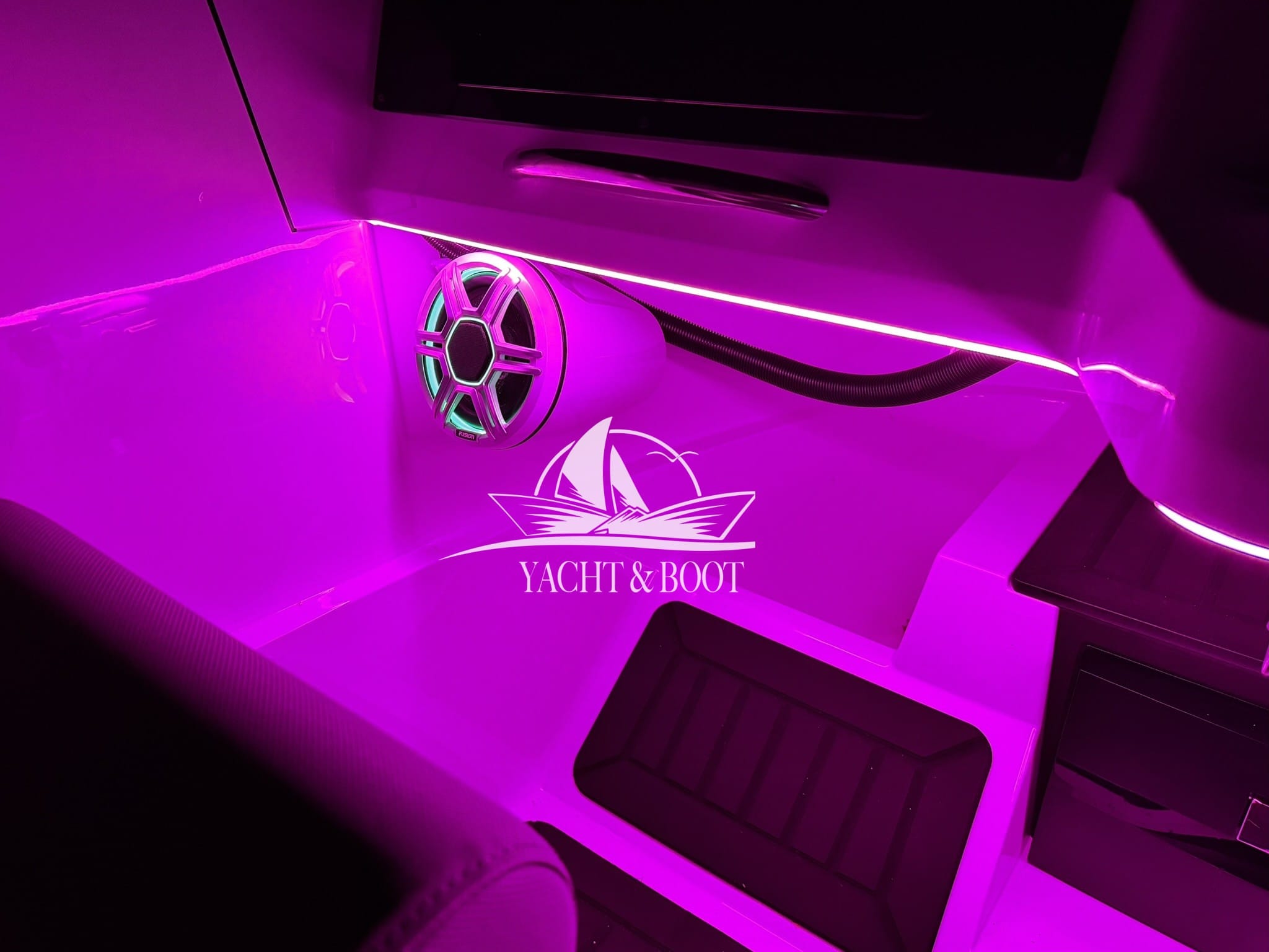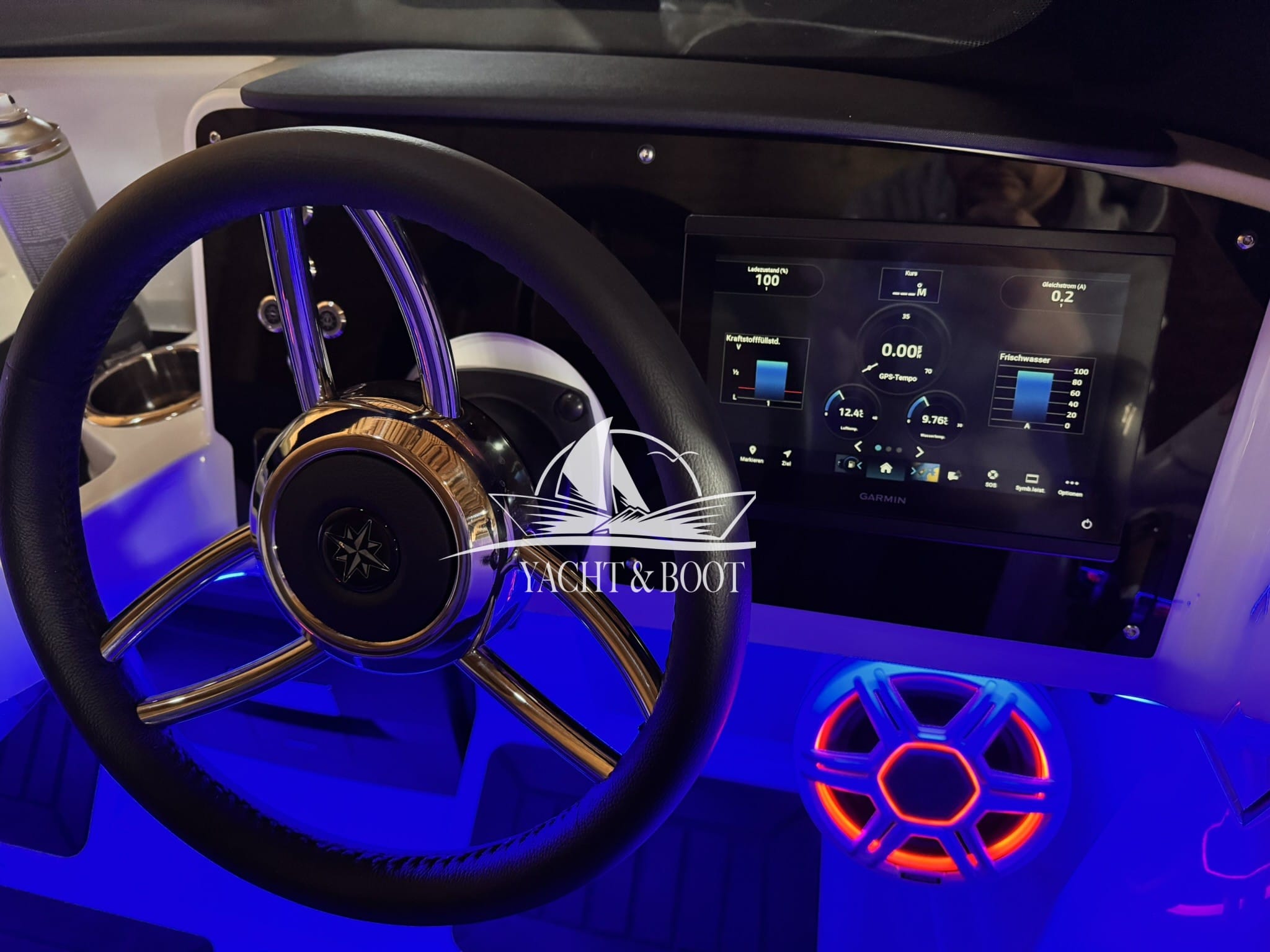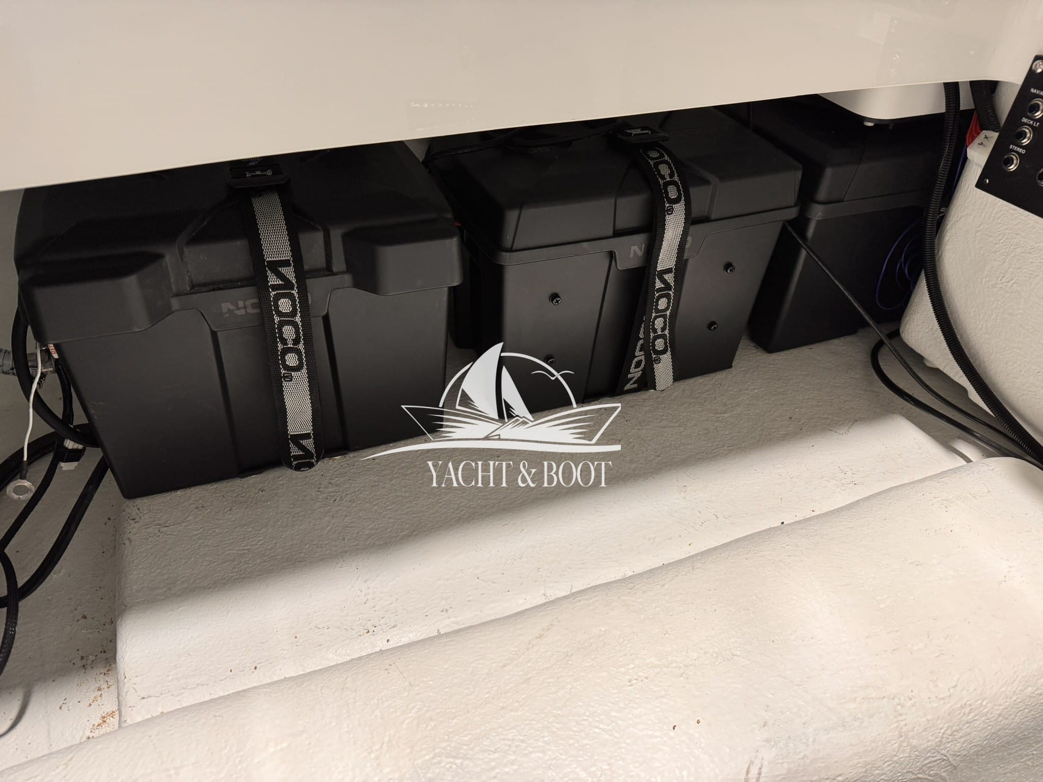 Ein technisches Kernmerkmal ist der Suzuki DF115 BTGL Außenborder mit vollelektronischem Drive-by-Wire-System. Die digitale Gas- und Schaltsteuerung sorgt für extrem präzises, verzögerungsfreies Ansprechverhalten und außergewöhnlich sanfte Manöver. Gerade beim Rangieren im Hafen oder beim langsamen Cruisen zeigt sich der Vorteil gegenüber mechanischen Steuerungen deutlich. Der Motor ist vollständig in das NMEA2000-Netzwerk integriert und kommuniziert direkt mit der Garmin-Systemarchitektur an Bord. Navigation, Motordaten und Bordelektronik arbeiten in einem einheitlichen digitalen System, wie man es aus deutlich größeren Yachten kennt. Diese Integration erhöht Komfort, Sicherheit und Bedienpräzision auf Premium-Niveau.