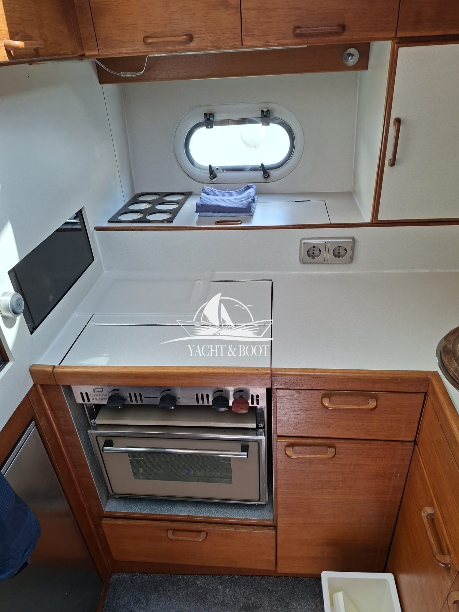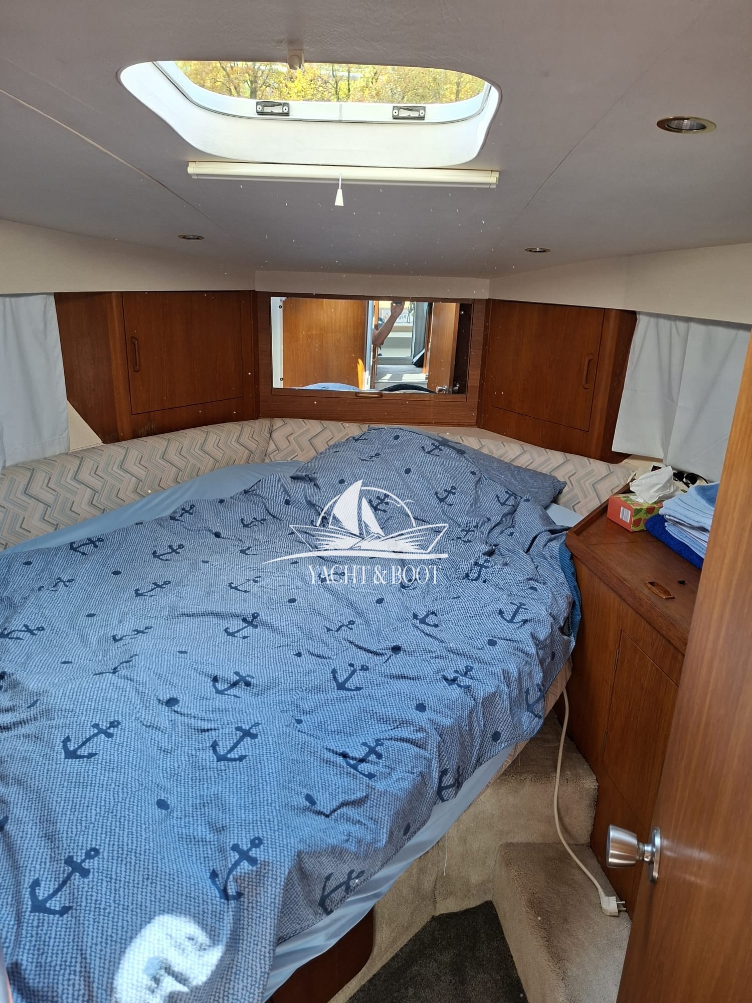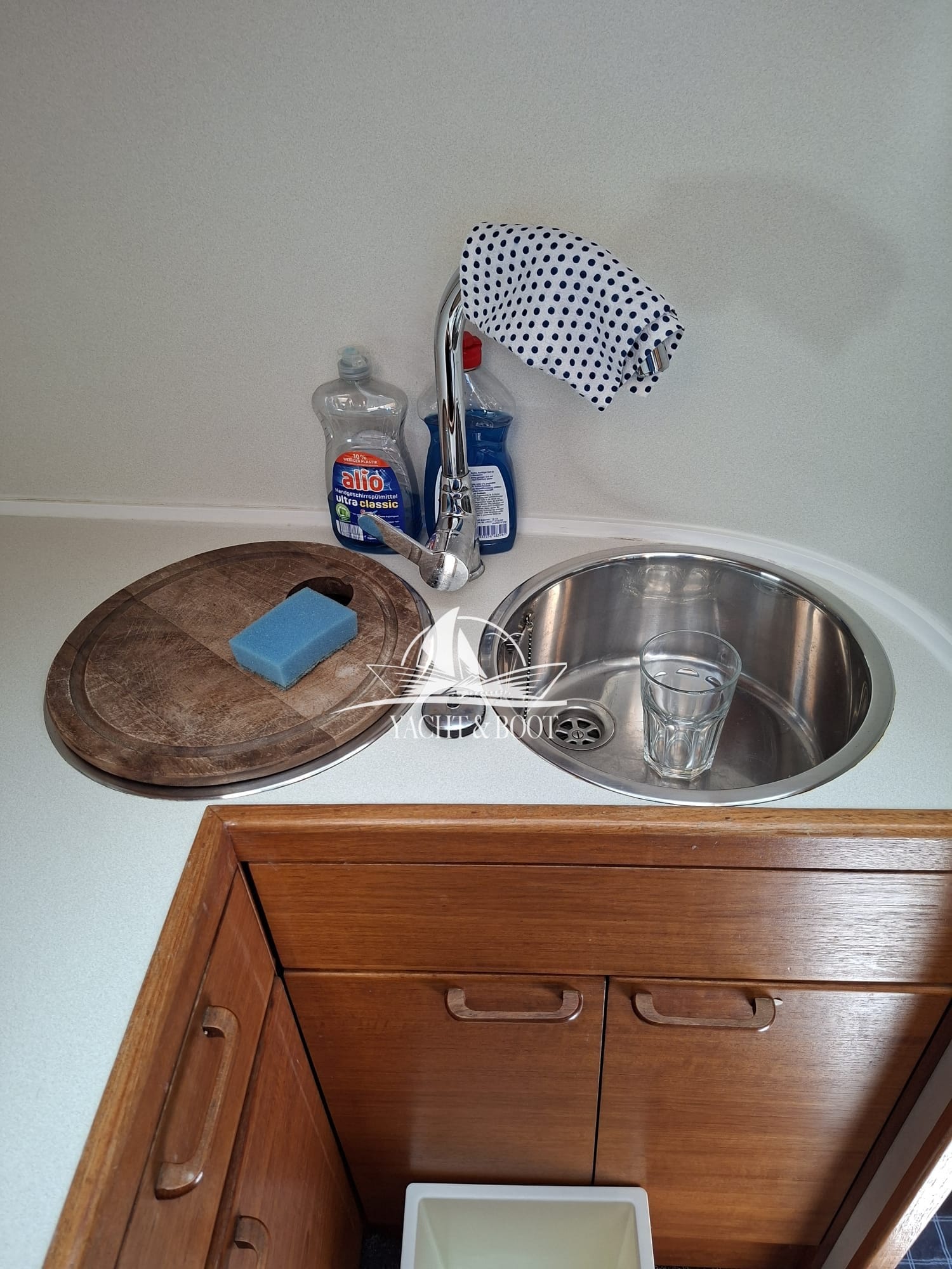 Der Innenraum bietet ein angenehmes Raumgefühl mit rund 2 m Stehhöhe. Insgesamt stehen vier Schlafplätze, eine Pantry mit Kühlschrank, Gas-Kochfeld und Backofen sowie ein Badezimmer mit Dusche und WC zur Verfügung. Eine Dieselheizung ermöglicht die Nutzung des Bootes auch in der Vor- und Nachsaison.