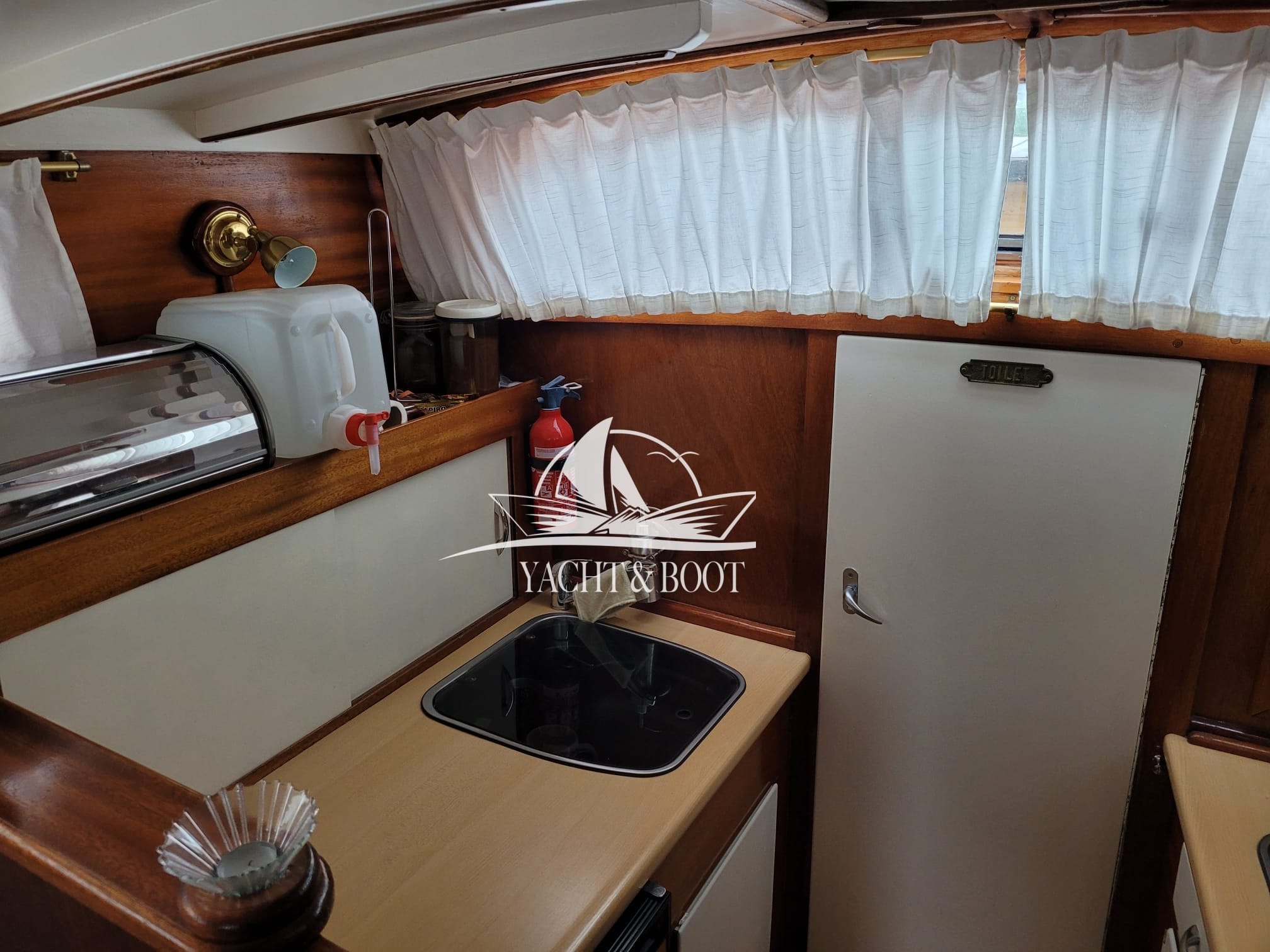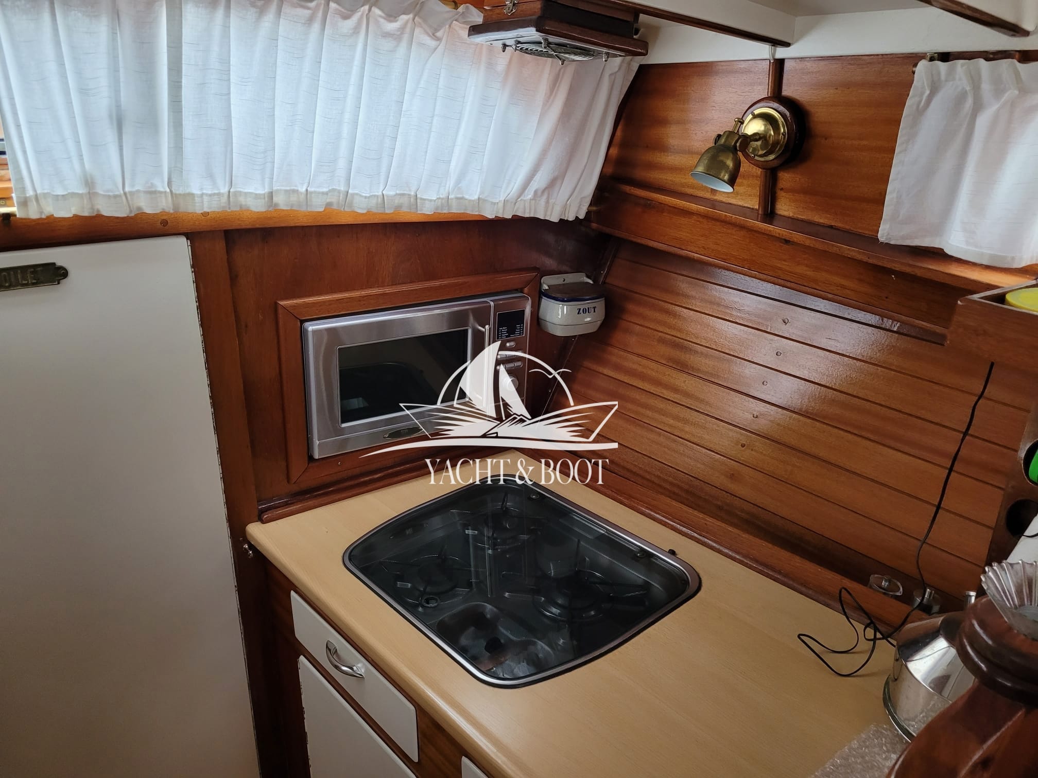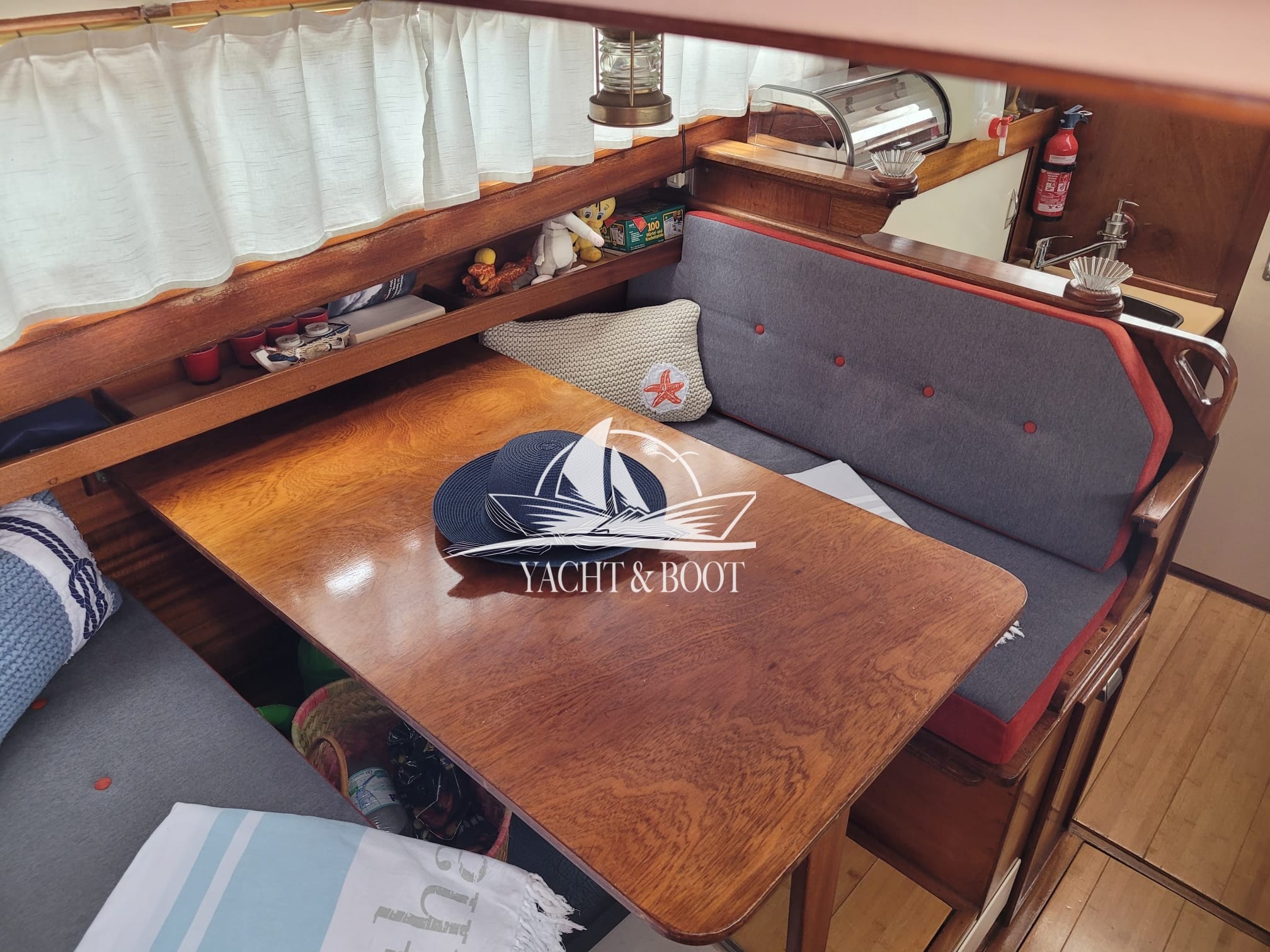 Im Innenbereich bietet das Boot eine praktische Raumaufteilung mit zwei Kabinen und bis zu fünf Schlafplätzen. Die Pantry ist mit Gasherd (3 Flammen), Kühlschrank, Spüle sowie Mikrowelle bei Landstrom ausgestattet. Ergänzt wird die Ausstattung durch ein See-WC, zahlreiche Stauräume und eine gemütliche Salonatmosphäre.