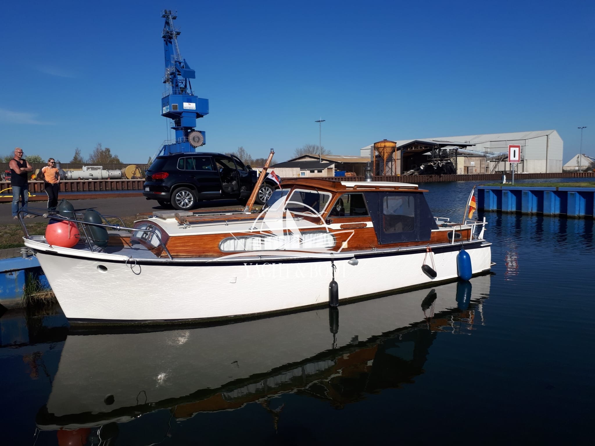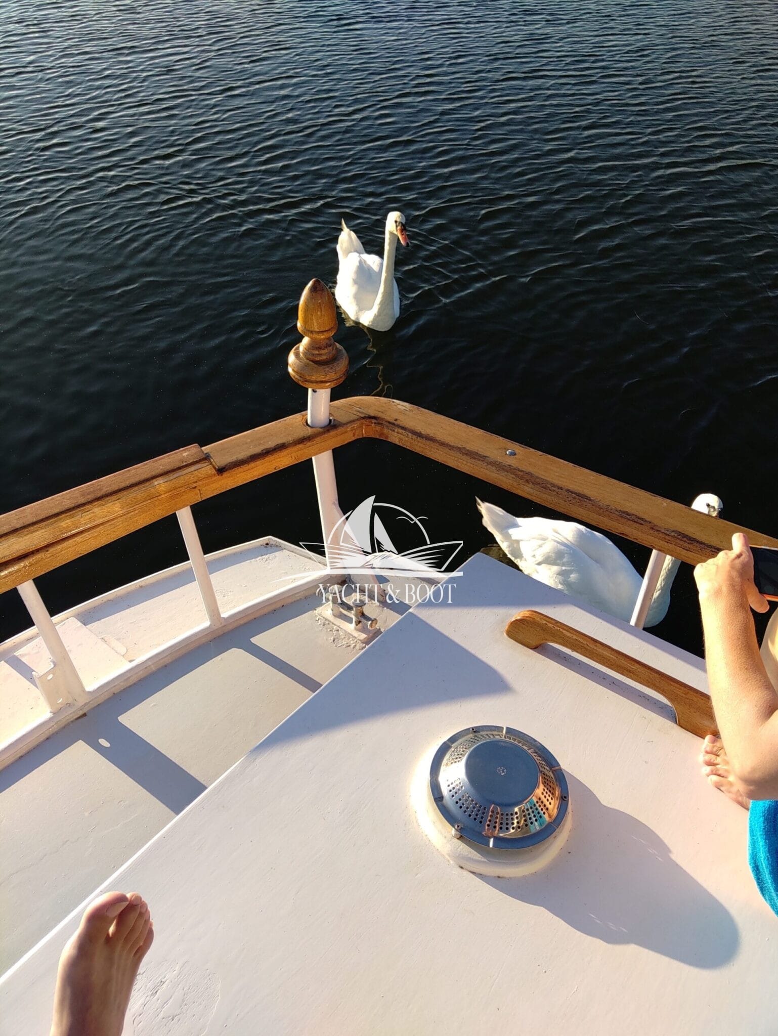 Die Kombination aus weißem Rumpf und edlem Holzaufbau verleiht dem Boot die typische, stilvolle Optik klassischer Motoryachten – ein echter Blickfang in jedem Hafen.