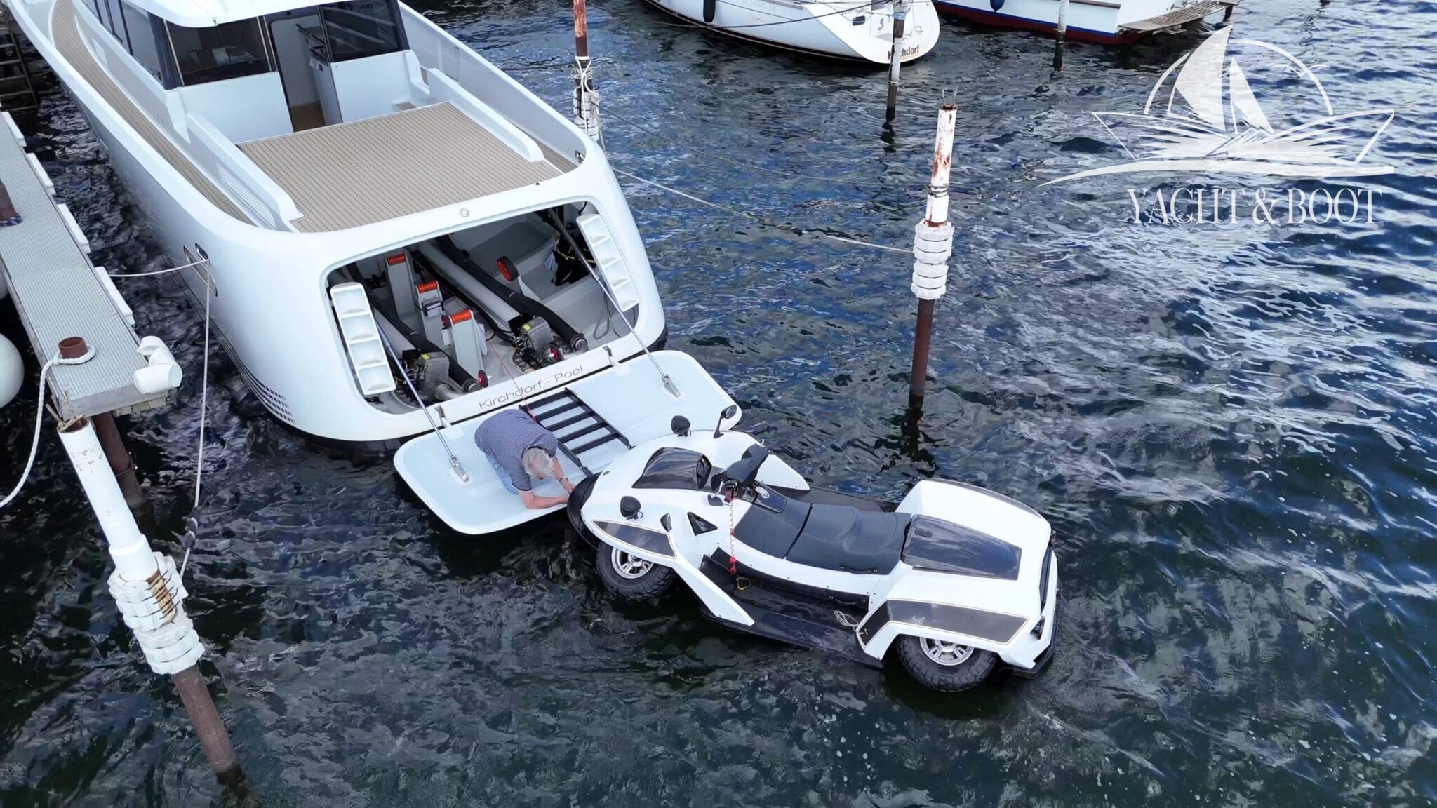 In der Tendergarage steht ein Quadski mit BMW 4 Zylinder Motor, für die Ausfahrt auf Wasser und Land bereit.