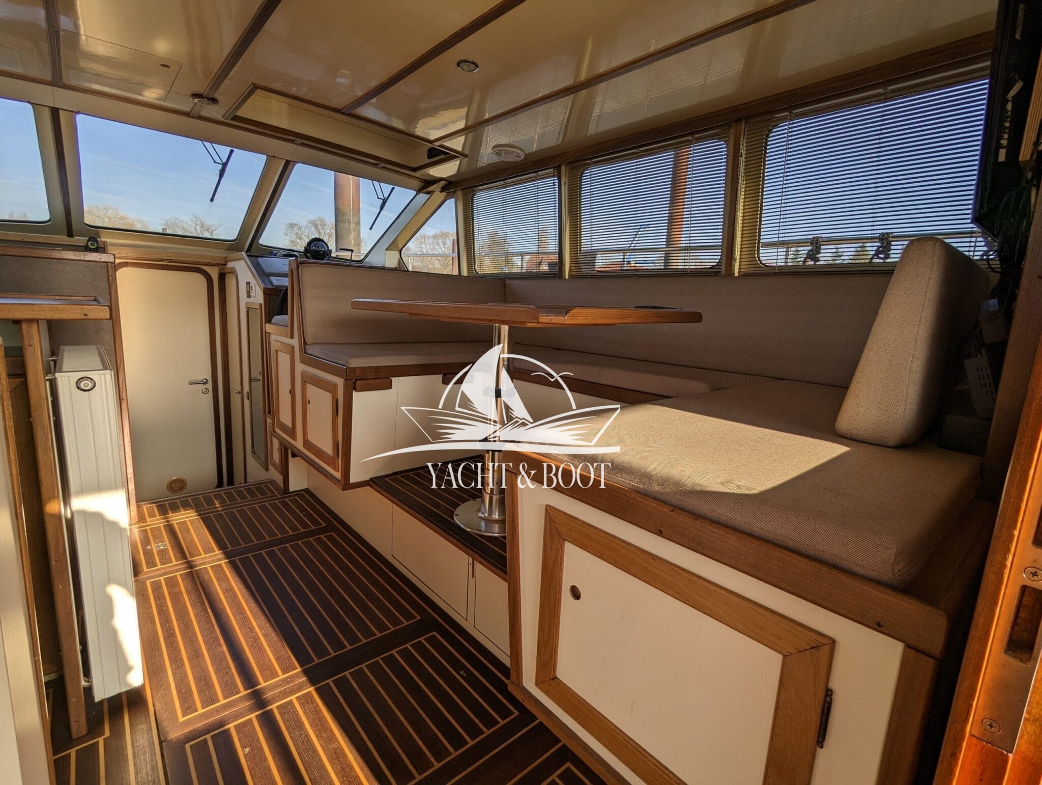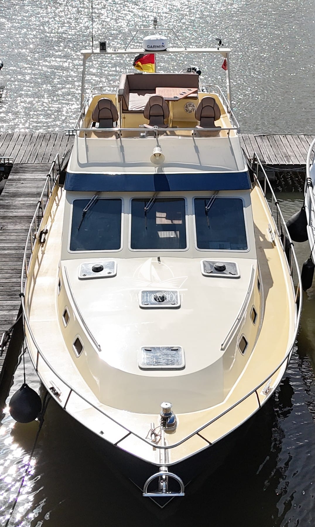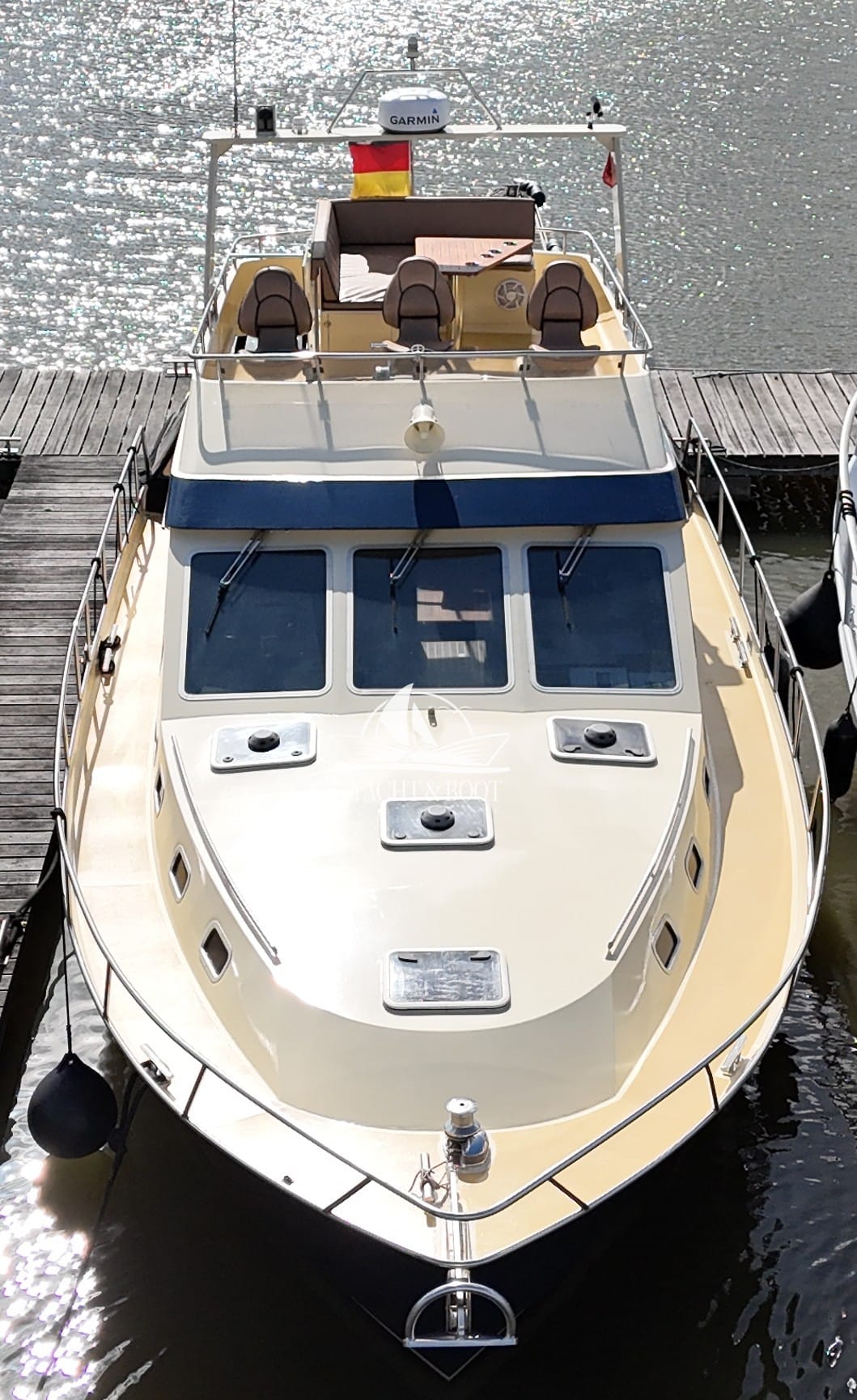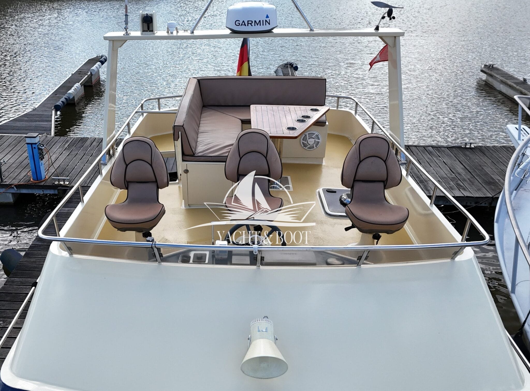 Auch technisch befindet sich diese Flybridge – Motoryacht auf einem modernen und zuverlässigen Stand. Der leistungsstarke Deutz Motor mit 210 PS sorgt für ein souveränes und effizientes Fahrverhalten, während Bug- und Heckstrahlruder das Manövrieren selbst in engen Häfen deutlich erleichtern. Eine wassergeführte Heizung gewährleistet angenehme Temperaturen an Bord bei jeder Witterung, unterstützt durch die hochwertige Isolierung und Doppelverglasung der Motoryacht. Für die autarke Energieversorgung steht ein leistungsfähiger Panda Generator mit 5 kW und reiner Sinuswelle zur Verfügung. Sämtliche Steuer- und Anzeigeelemente sowie die präzise Kobelt-Schaltung sind sowohl am Hauptsteuerstand als auch auf der Flybridge verfügbar.