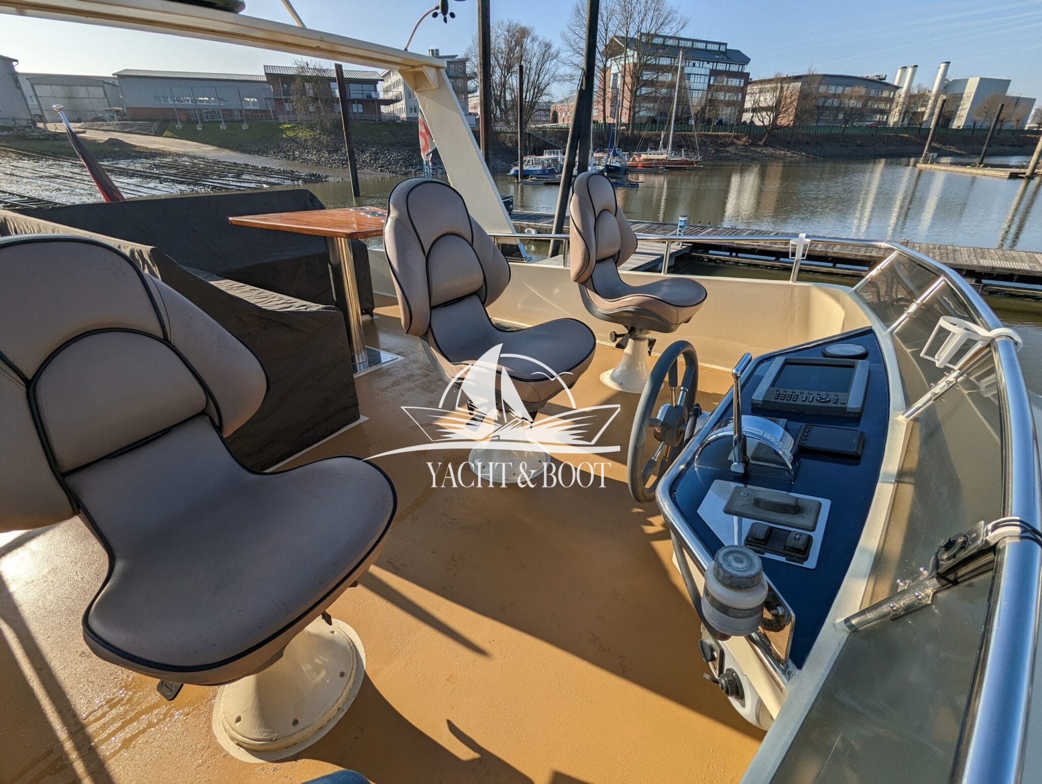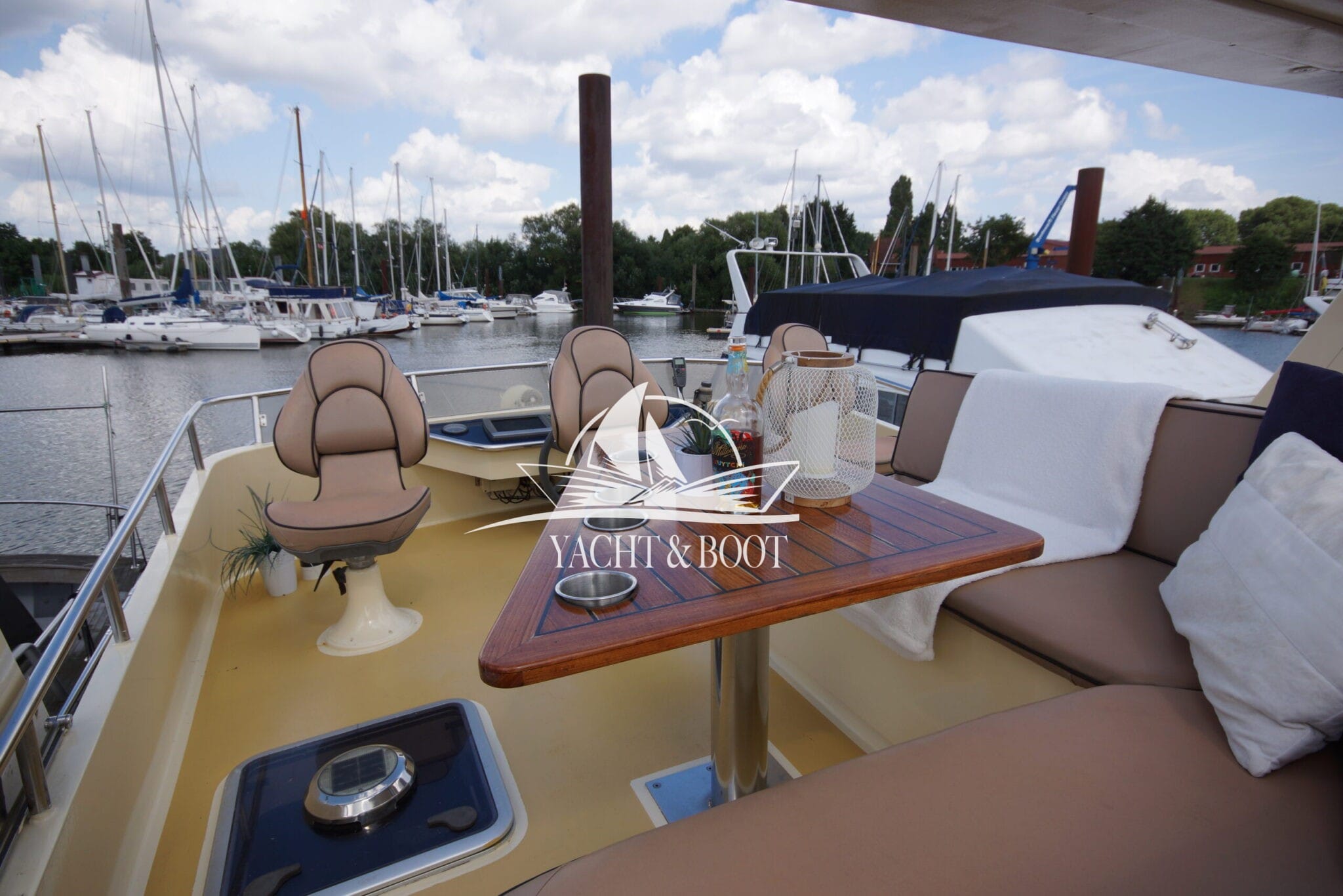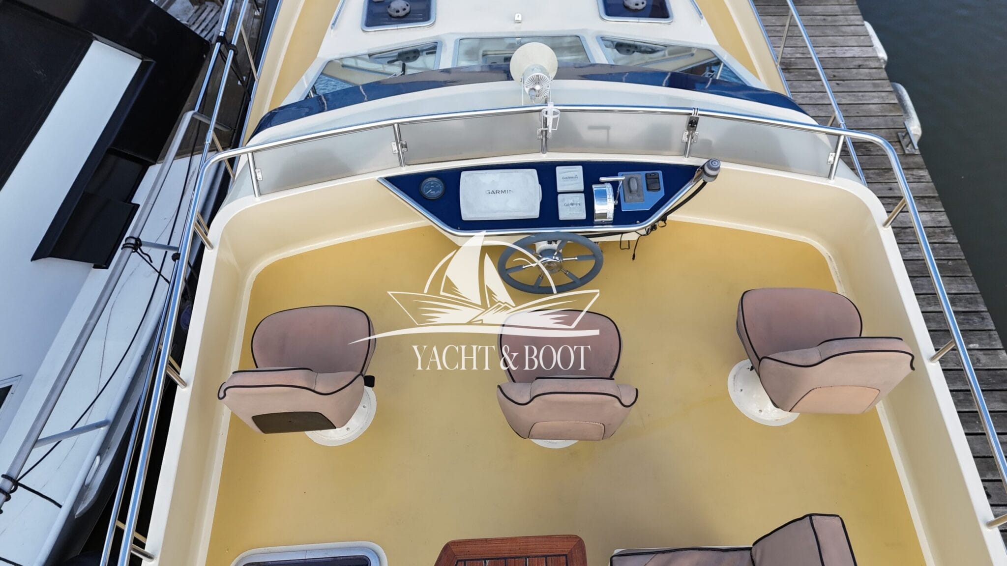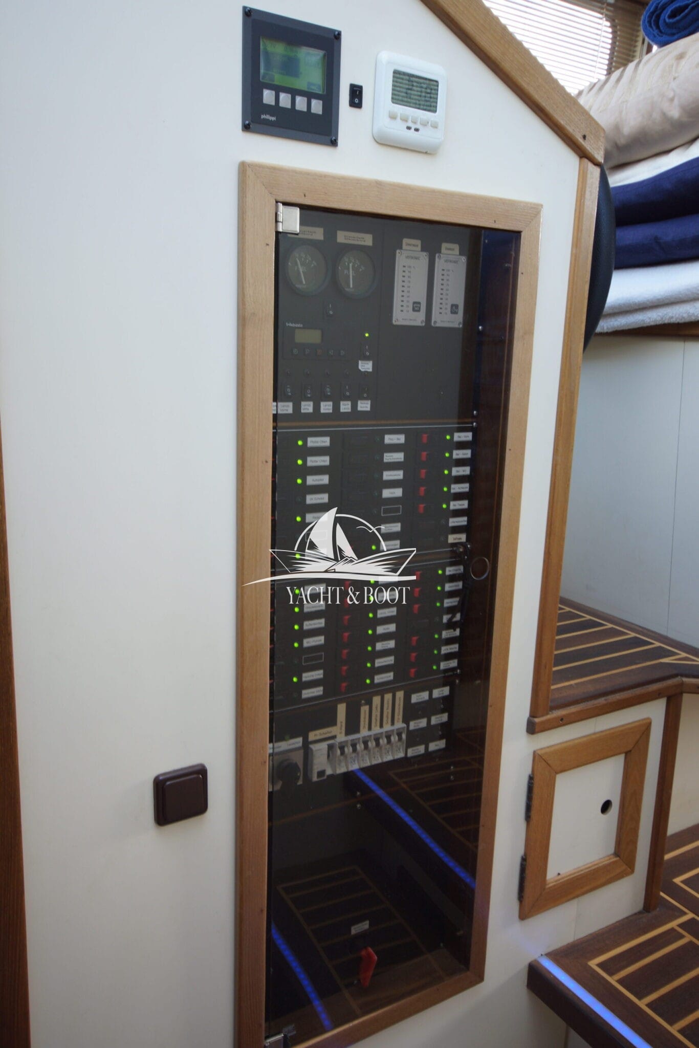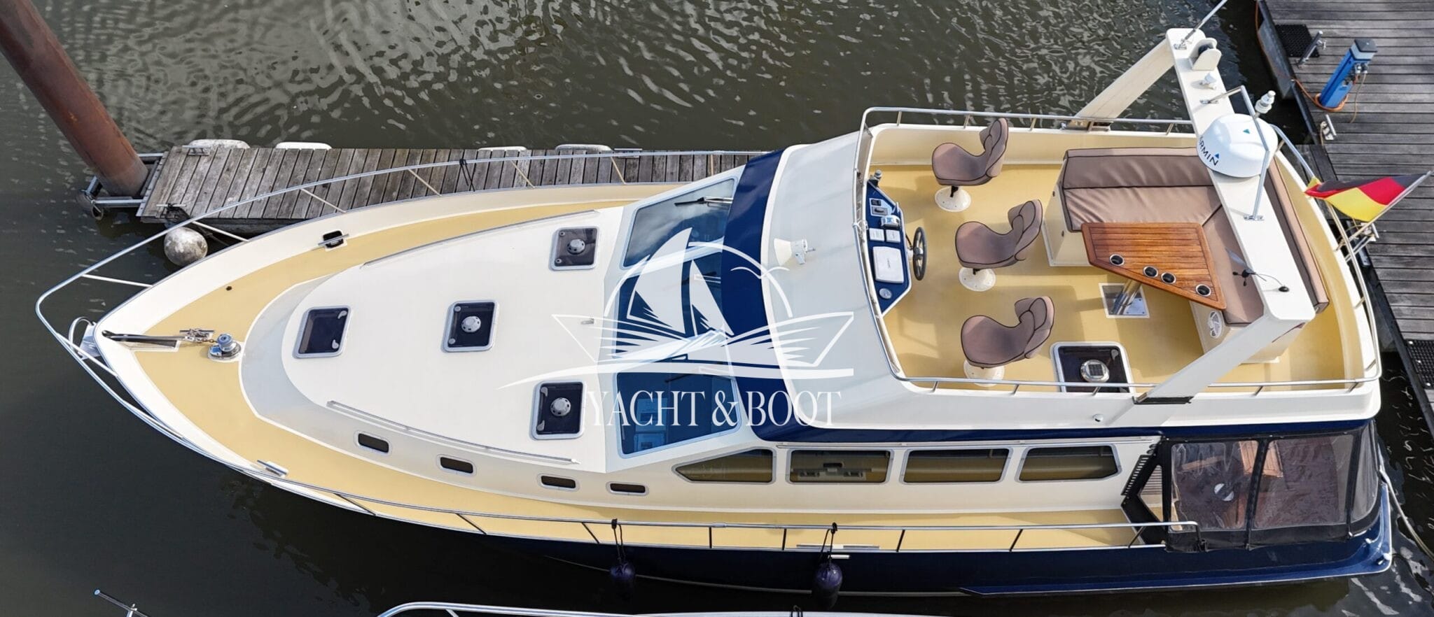 Auch technisch befindet sich diese Flybridge – Motoryacht auf einem modernen und zuverlässigen Stand. Der leistungsstarke Deutz Motor mit 210 PS sorgt für ein souveränes und effizientes Fahrverhalten, während Bug- und Heckstrahlruder das Manövrieren selbst in engen Häfen deutlich erleichtern. Eine wassergeführte Heizung gewährleistet angenehme Temperaturen an Bord bei jeder Witterung, unterstützt durch die hochwertige Isolierung und Doppelverglasung der Motoryacht. Für die autarke Energieversorgung steht ein leistungsfähiger Panda Generator mit 5 kW und reiner Sinuswelle zur Verfügung. Sämtliche Steuer- und Anzeigeelemente sowie die präzise Kobelt-Schaltung sind sowohl am Hauptsteuerstand als auch auf der Flybridge verfügbar.