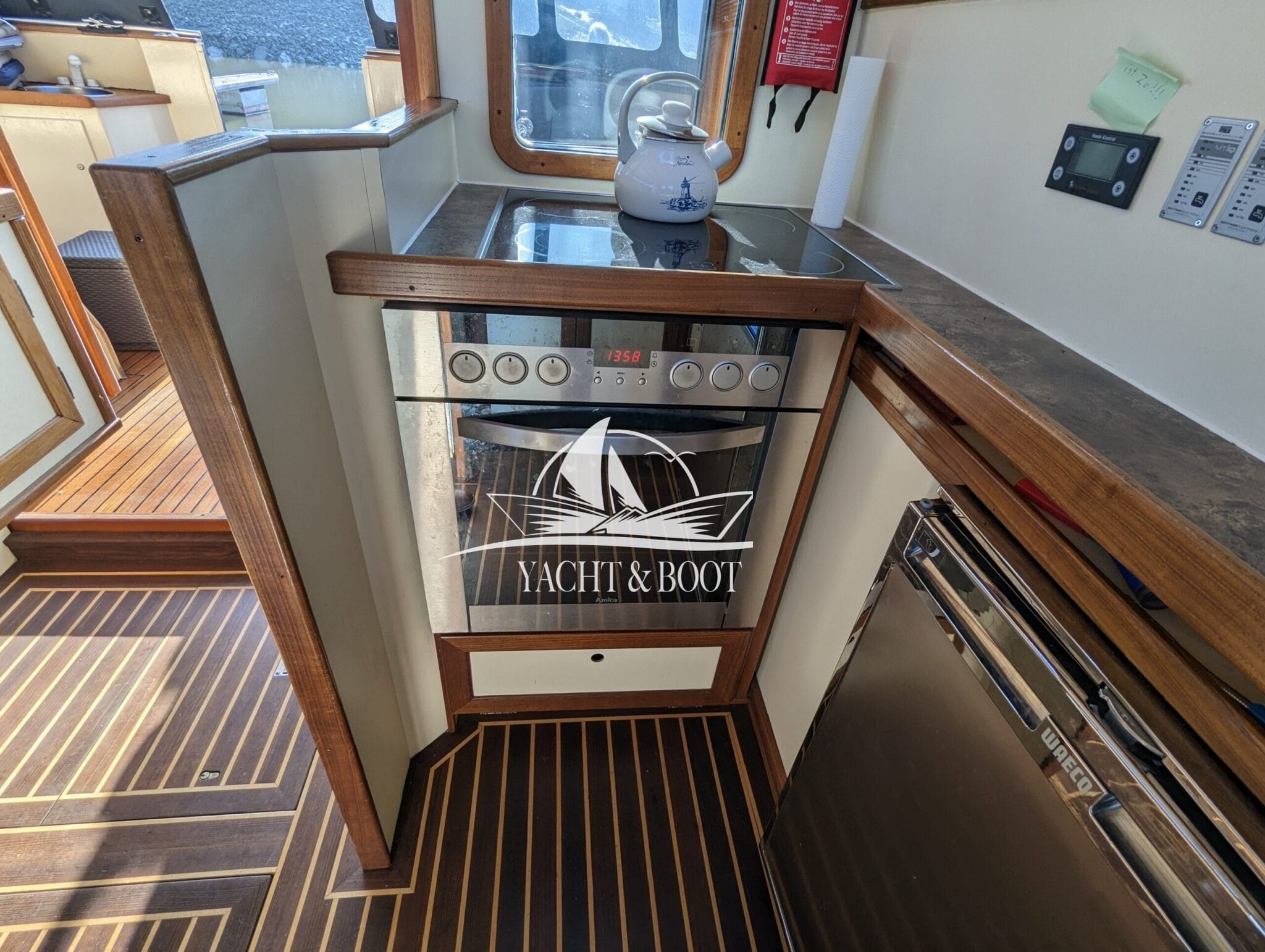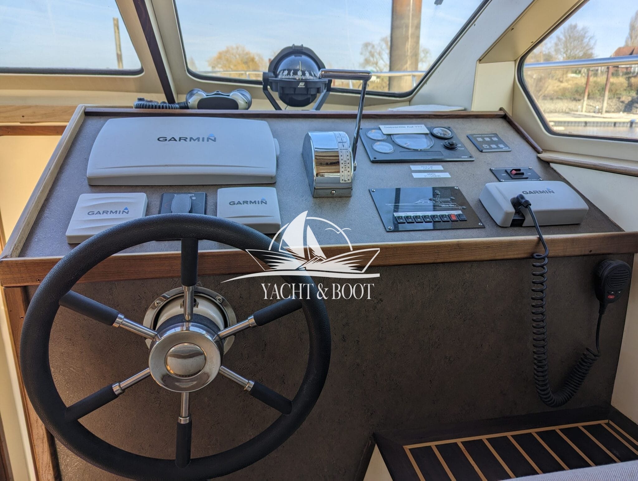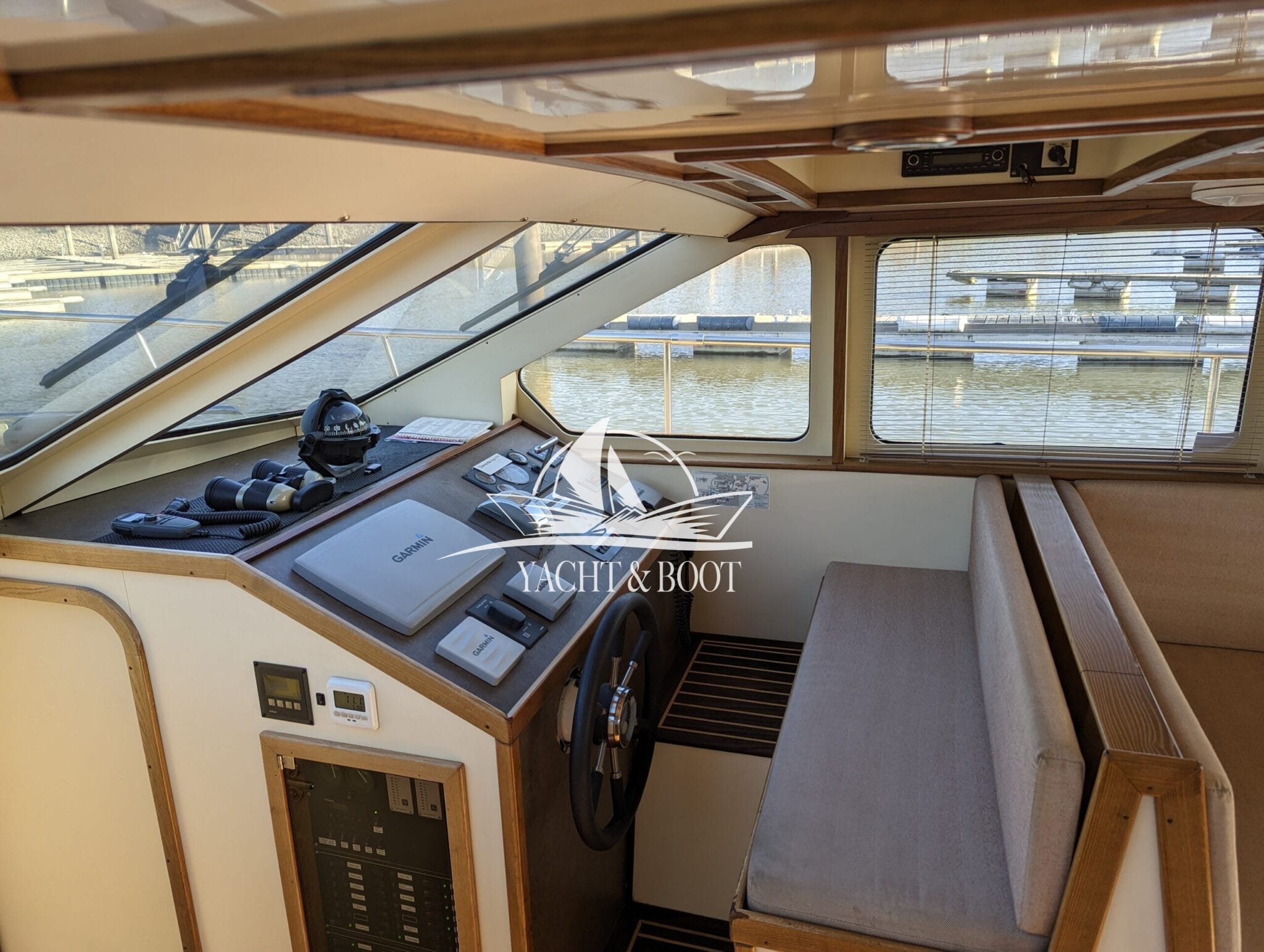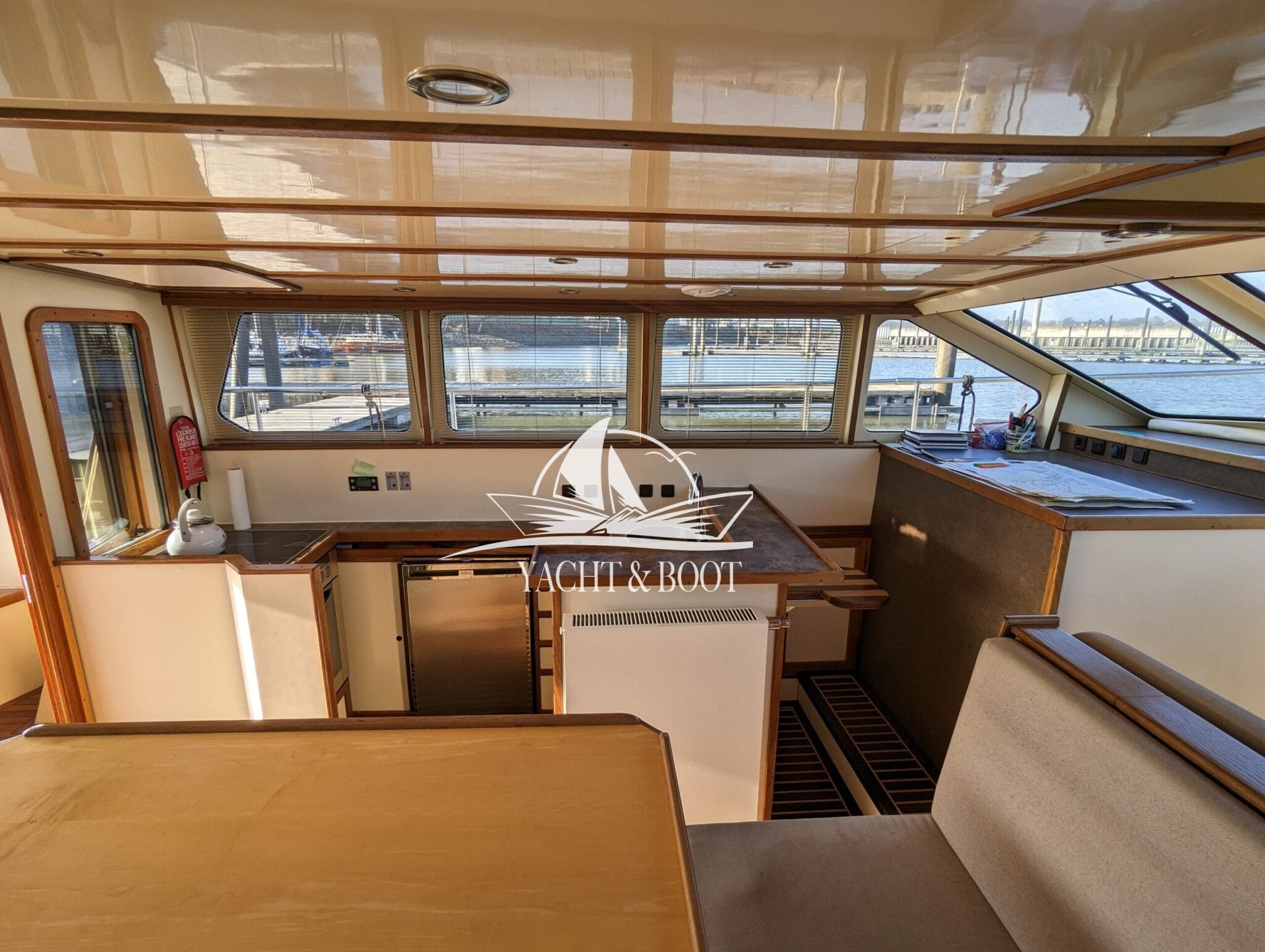 Auch technisch befindet sich diese Flybridge – Motoryacht auf einem modernen und zuverlässigen Stand. Der leistungsstarke Deutz Motor mit 210 PS sorgt für ein souveränes und effizientes Fahrverhalten, während Bug- und Heckstrahlruder das Manövrieren selbst in engen Häfen deutlich erleichtern. Eine wassergeführte Heizung gewährleistet angenehme Temperaturen an Bord bei jeder Witterung, unterstützt durch die hochwertige Isolierung und Doppelverglasung der Motoryacht. Für die autarke Energieversorgung steht ein leistungsfähiger Panda Generator mit 5 kW und reiner Sinuswelle zur Verfügung. Sämtliche Steuer- und Anzeigeelemente sowie die präzise Kobelt-Schaltung sind sowohl am Hauptsteuerstand als auch auf der Flybridge verfügbar.
