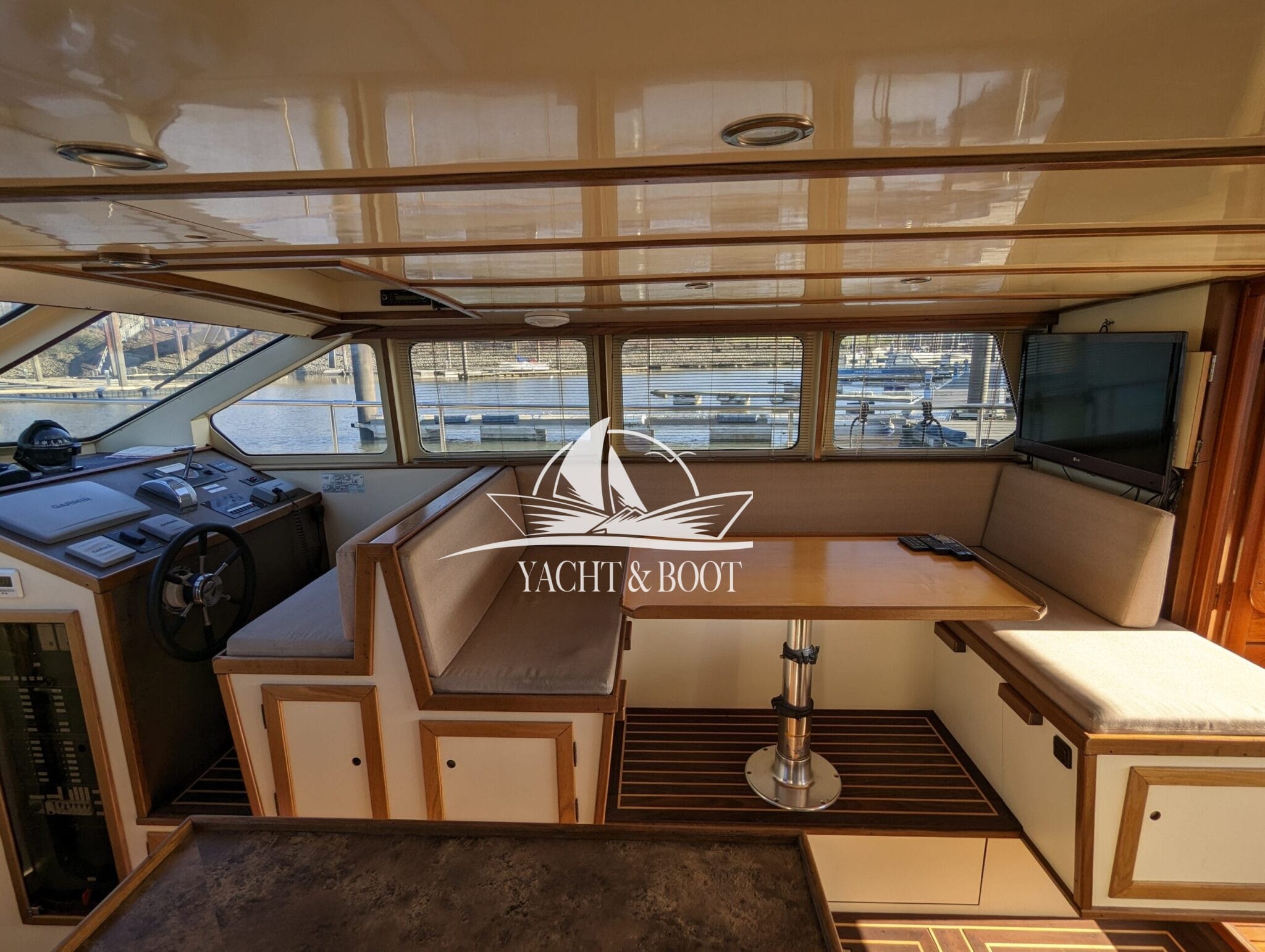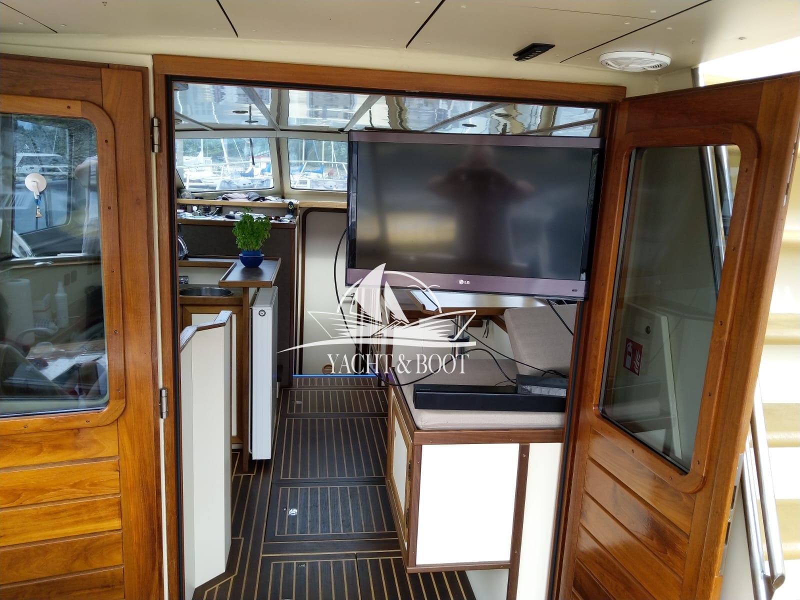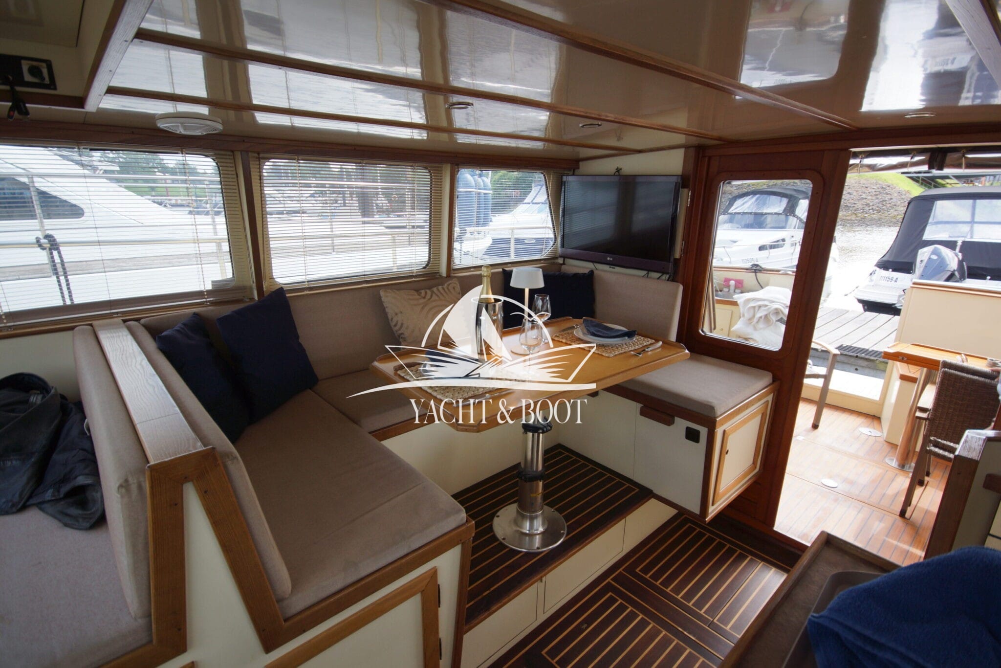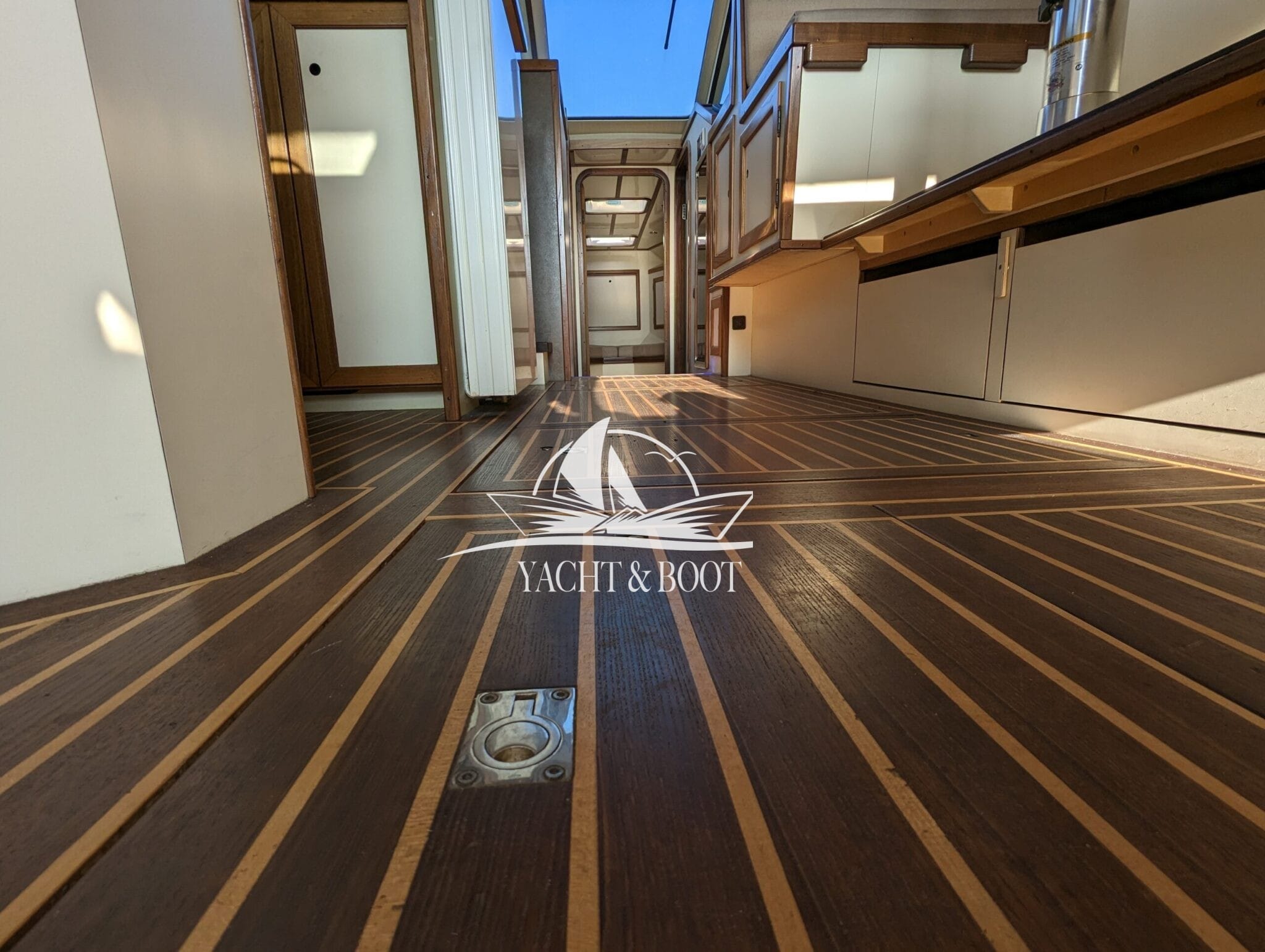 Auf der gesamten Motoryacht mit Flybridge wird die konsequente Verwendung hochwertiger Materialien sichtbar. Teakbeläge auf der Badeplattform und in der Plicht, massive Edelstahlbeschläge, stabile Handläufe sowie eine robuste Reling unterstreichen den hohen Qualitätsanspruch. Hinter den massiven Doppeltüren eröffnet sich ein stilvoll gestalteter Salon, der die Handschrift eines erfahrenen Tischlermeisters trägt. Das Interieur überzeugt durch eine gelungene Kombination aus Ästhetik und Funktionalität und präsentiert sich klar strukturiert, aufgeräumt und durchdacht. Besondere Akzente setzen ein integrierter LED-Sternenhimmel, eine dezente Stufenbeleuchtung sowie intelligente Lösungen wie eine Kranschiene in der Plicht und ein zentral organisierter Technikbereich.