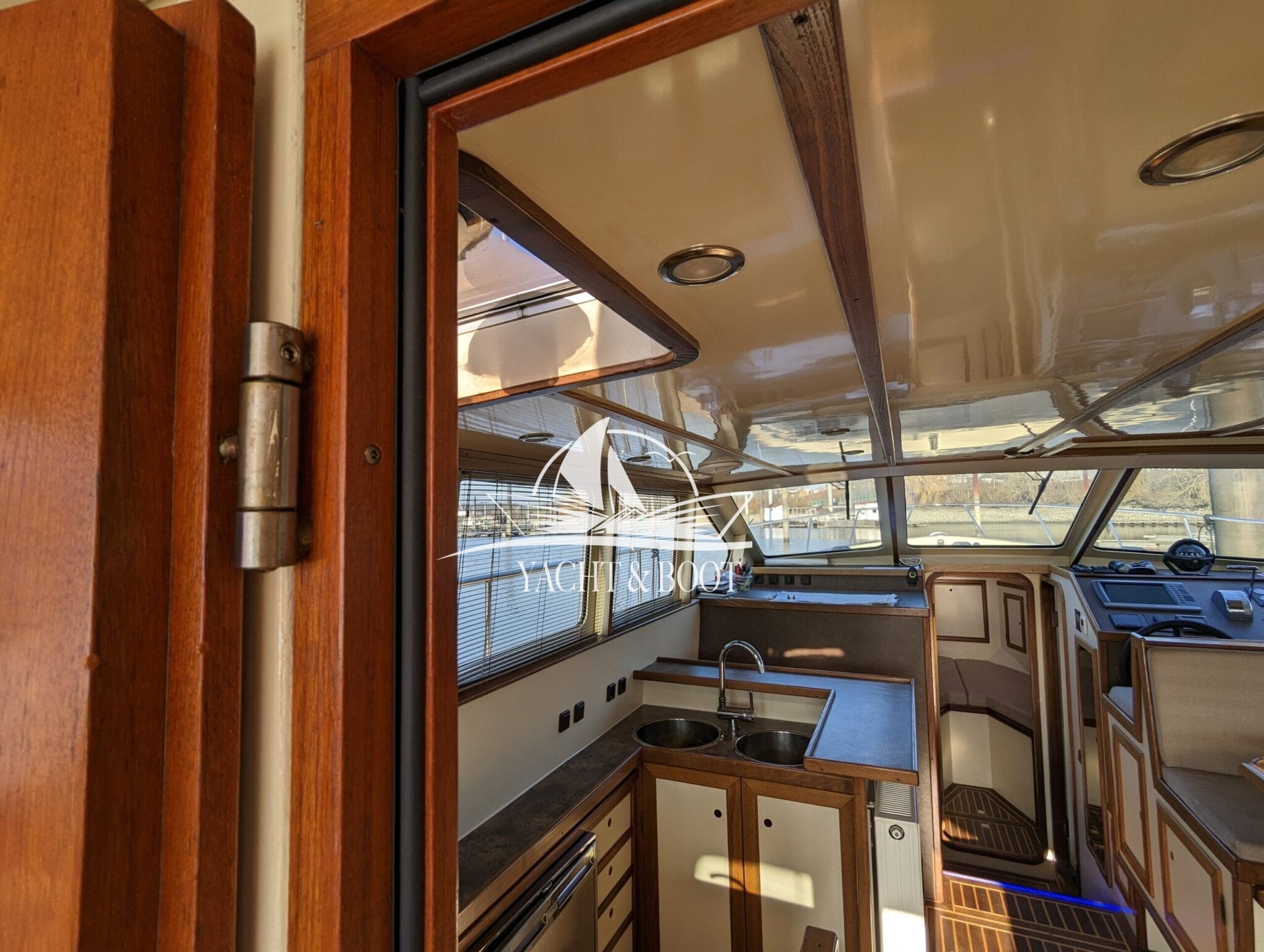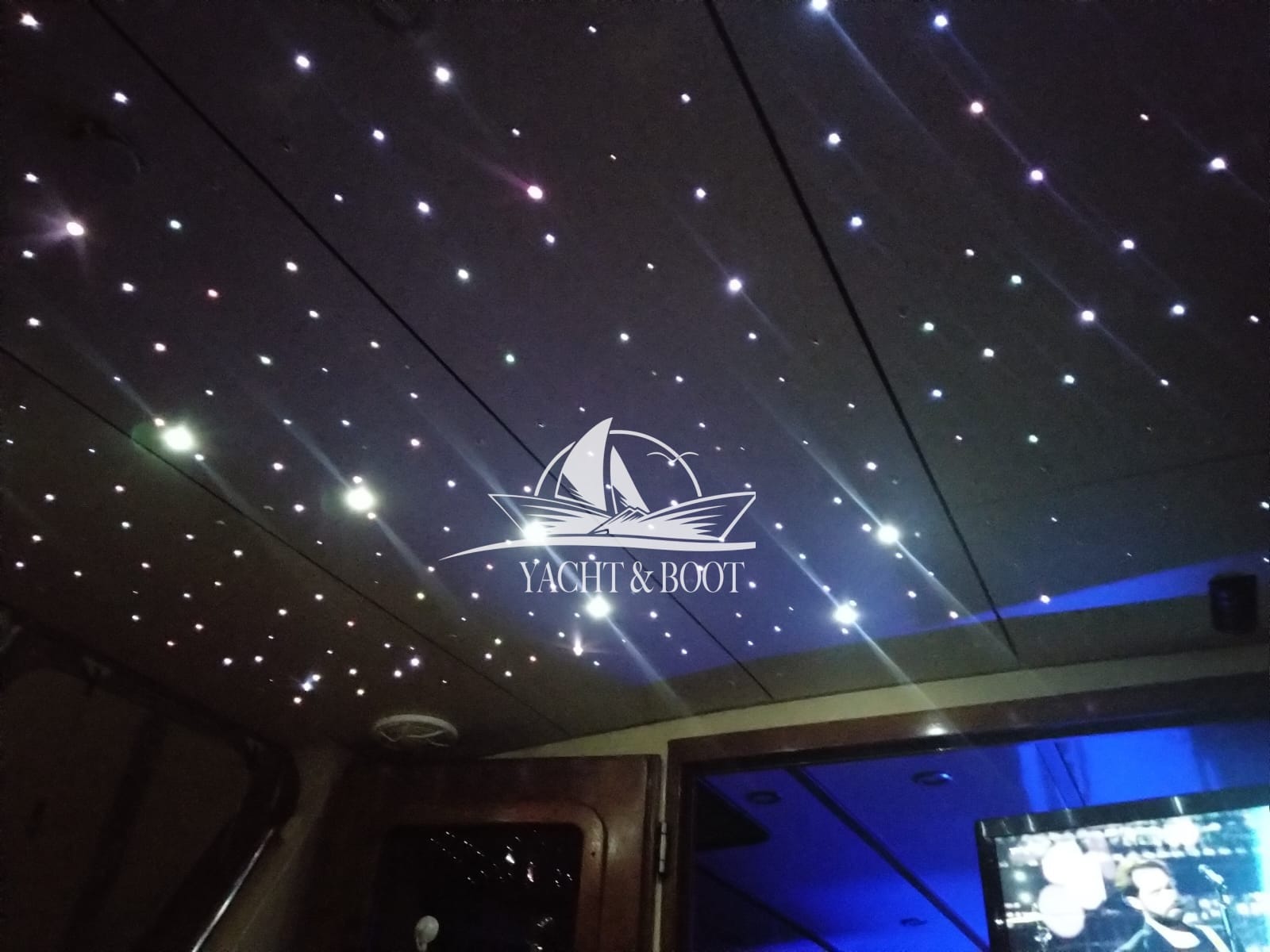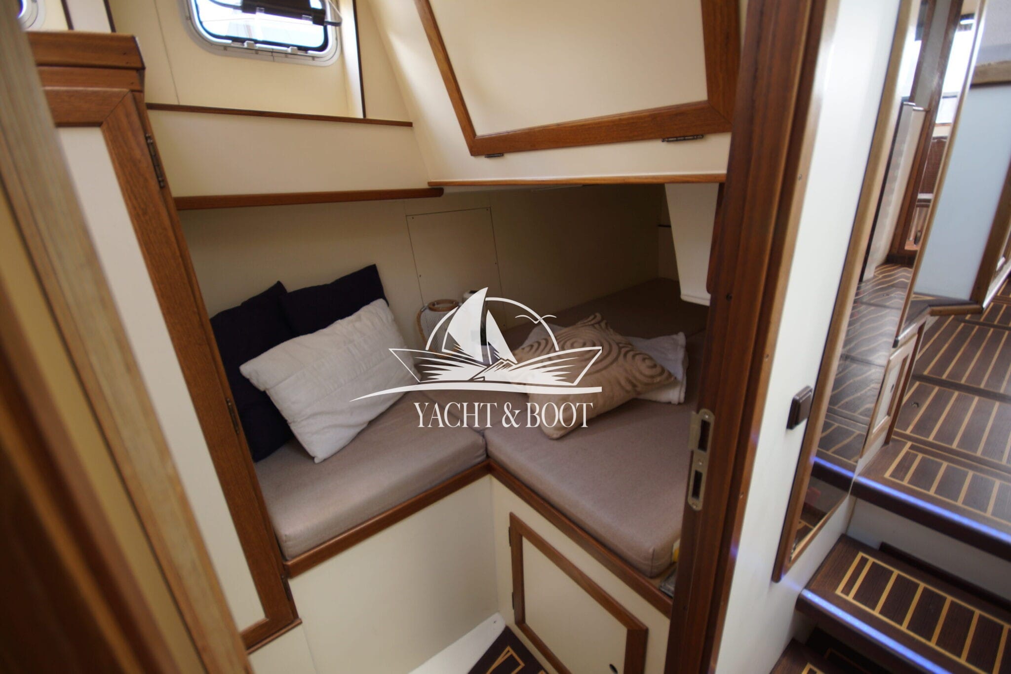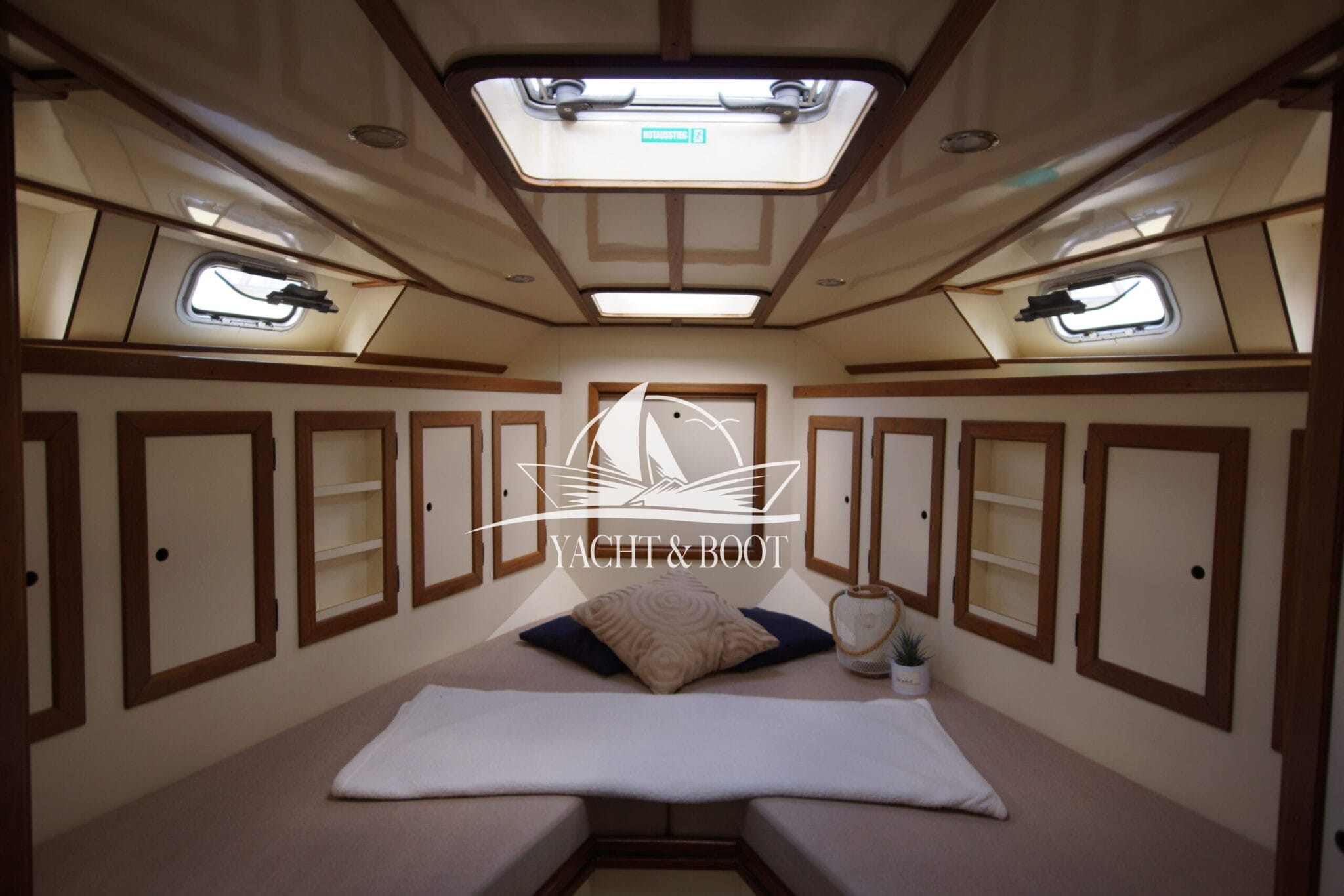 Auf der gesamten Motoryacht mit Flybridge wird die konsequente Verwendung hochwertiger Materialien sichtbar. Teakbeläge auf der Badeplattform und in der Plicht, massive Edelstahlbeschläge, stabile Handläufe sowie eine robuste Reling unterstreichen den hohen Qualitätsanspruch. Hinter den massiven Doppeltüren eröffnet sich ein stilvoll gestalteter Salon, der die Handschrift eines erfahrenen Tischlermeisters trägt. Das Interieur überzeugt durch eine gelungene Kombination aus Ästhetik und Funktionalität und präsentiert sich klar strukturiert, aufgeräumt und durchdacht. Besondere Akzente setzen ein integrierter LED-Sternenhimmel, eine dezente Stufenbeleuchtung sowie intelligente Lösungen wie eine Kranschiene in der Plicht und ein zentral organisierter Technikbereich.