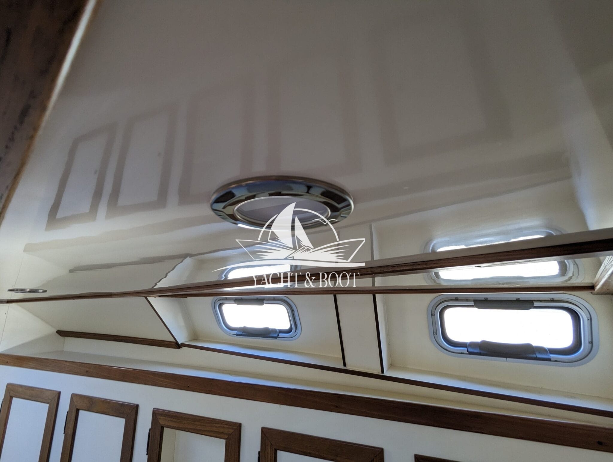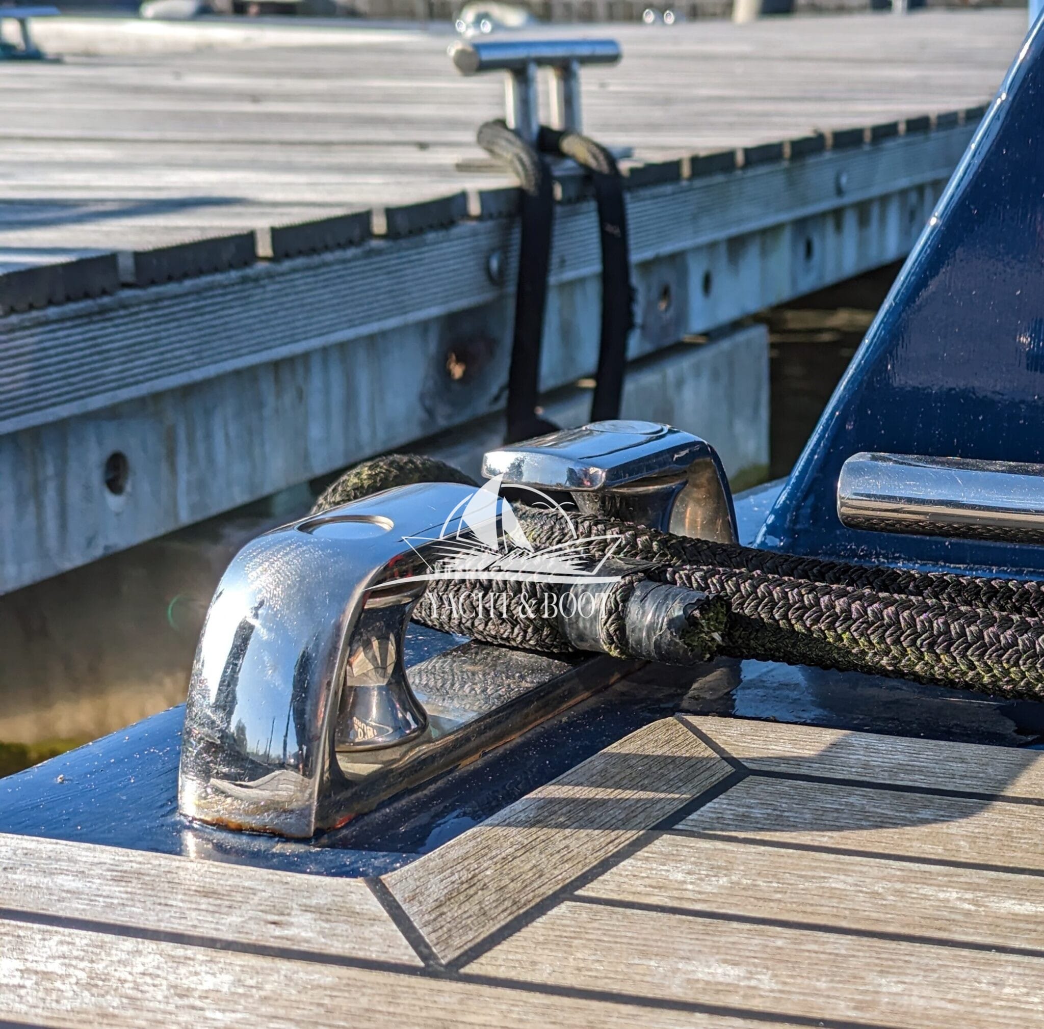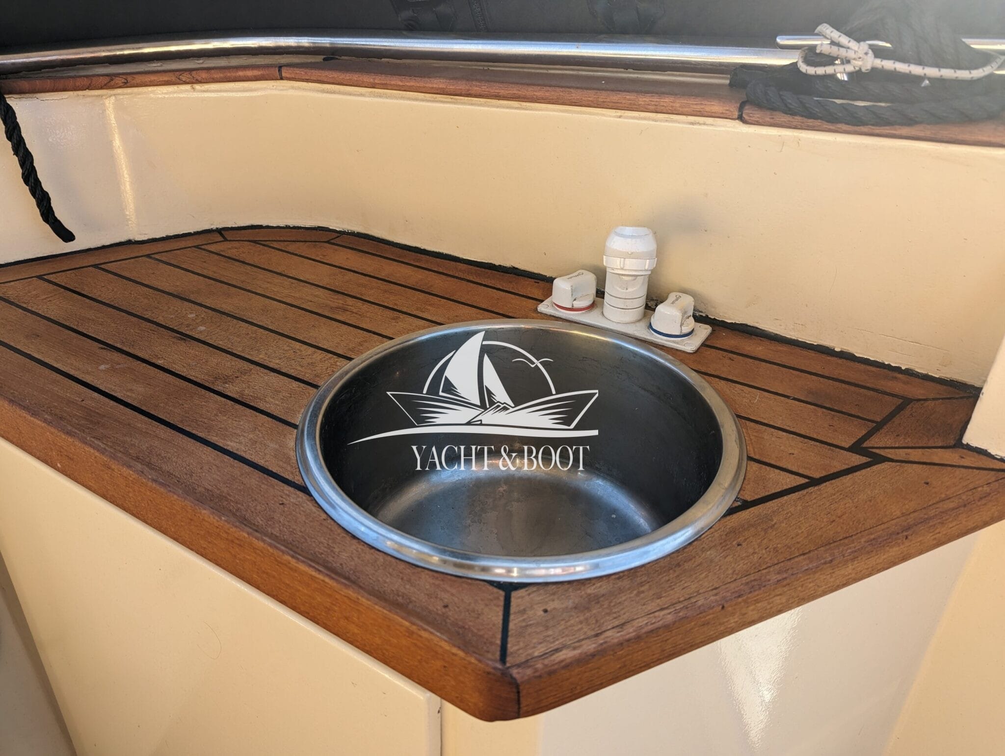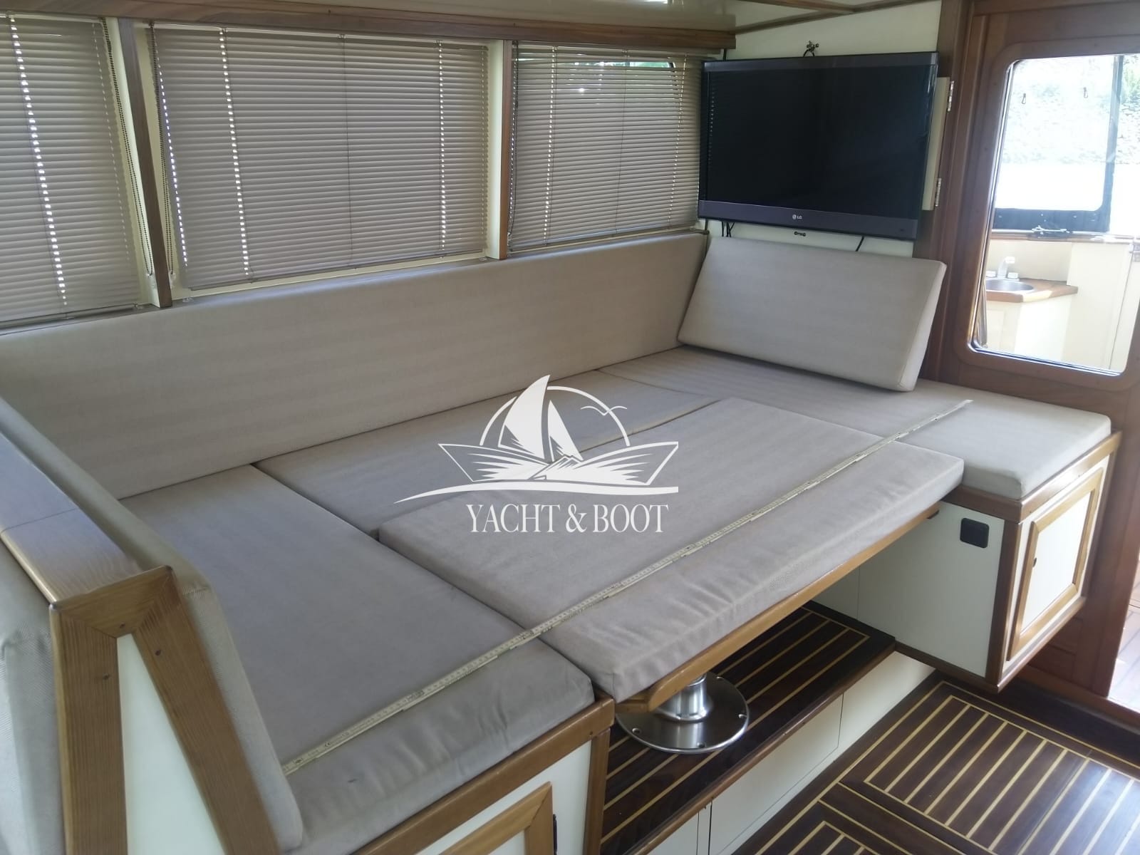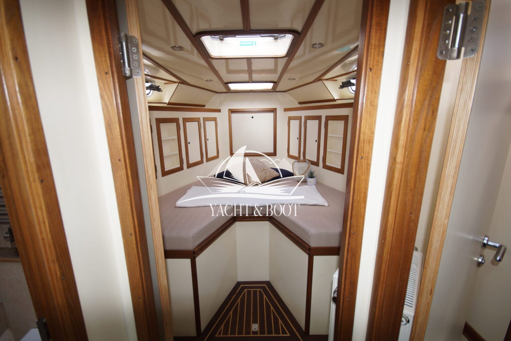 Auf der gesamten Motoryacht mit Flybridge wird die konsequente Verwendung hochwertiger Materialien sichtbar. Teakbeläge auf der Badeplattform und in der Plicht, massive Edelstahlbeschläge, stabile Handläufe sowie eine robuste Reling unterstreichen den hohen Qualitätsanspruch. Hinter den massiven Doppeltüren eröffnet sich ein stilvoll gestalteter Salon, der die Handschrift eines erfahrenen Tischlermeisters trägt. Das Interieur überzeugt durch eine gelungene Kombination aus Ästhetik und Funktionalität und präsentiert sich klar strukturiert, aufgeräumt und durchdacht. Besondere Akzente setzen ein integrierter LED-Sternenhimmel, eine dezente Stufenbeleuchtung sowie intelligente Lösungen wie eine Kranschiene in der Plicht und ein zentral organisierter Technikbereich.
