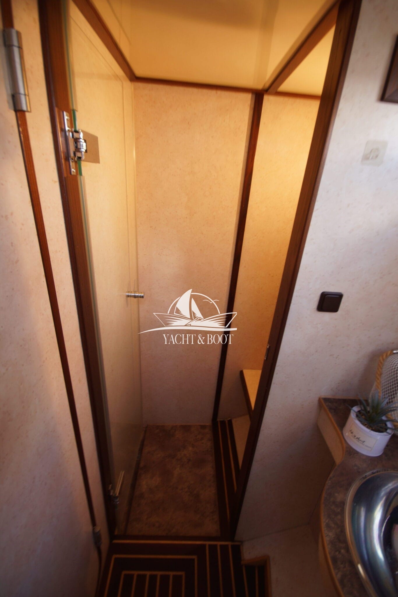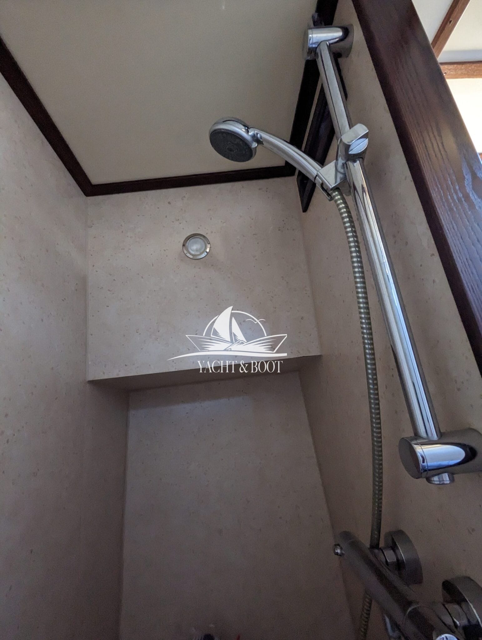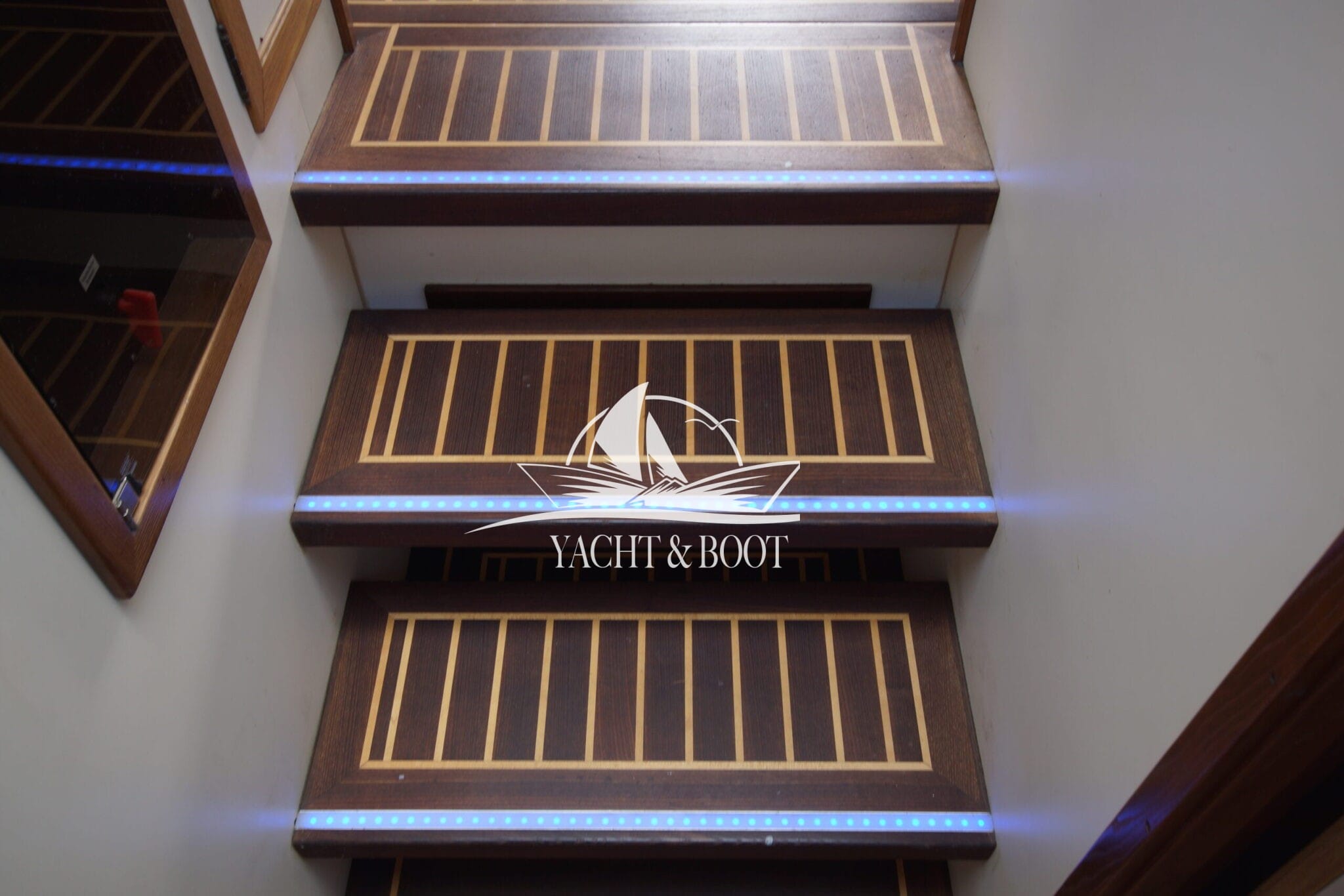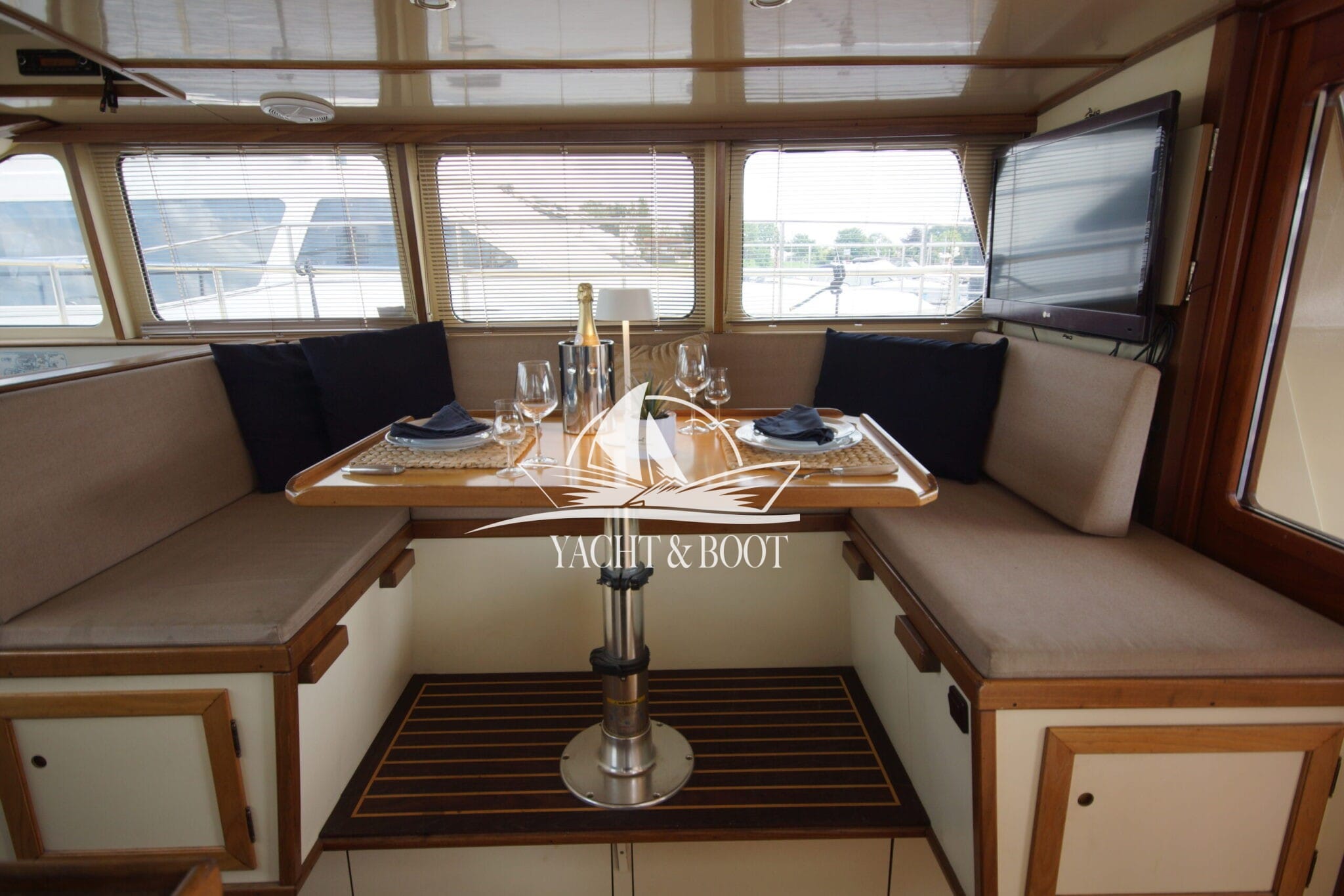 Auf der gesamten Motoryacht mit Flybridge wird die konsequente Verwendung hochwertiger Materialien sichtbar. Teakbeläge auf der Badeplattform und in der Plicht, massive Edelstahlbeschläge, stabile Handläufe sowie eine robuste Reling unterstreichen den hohen Qualitätsanspruch. Hinter den massiven Doppeltüren eröffnet sich ein stilvoll gestalteter Salon, der die Handschrift eines erfahrenen Tischlermeisters trägt. Das Interieur überzeugt durch eine gelungene Kombination aus Ästhetik und Funktionalität und präsentiert sich klar strukturiert, aufgeräumt und durchdacht. Besondere Akzente setzen ein integrierter LED-Sternenhimmel, eine dezente Stufenbeleuchtung sowie intelligente Lösungen wie eine Kranschiene in der Plicht und ein zentral organisierter Technikbereich.