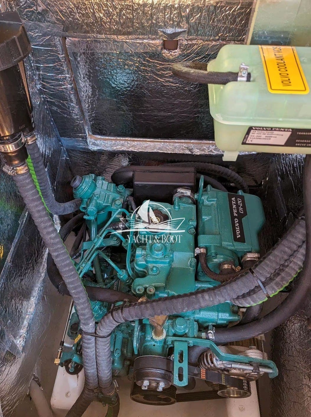 An Bord arbeitet typischerweise ein zuverlässiger Innenborder mit Saildrive, z. B. Volvo Penta D1-20, der für sichere Hafenmanöver und solide Marschfahrt sorgt.