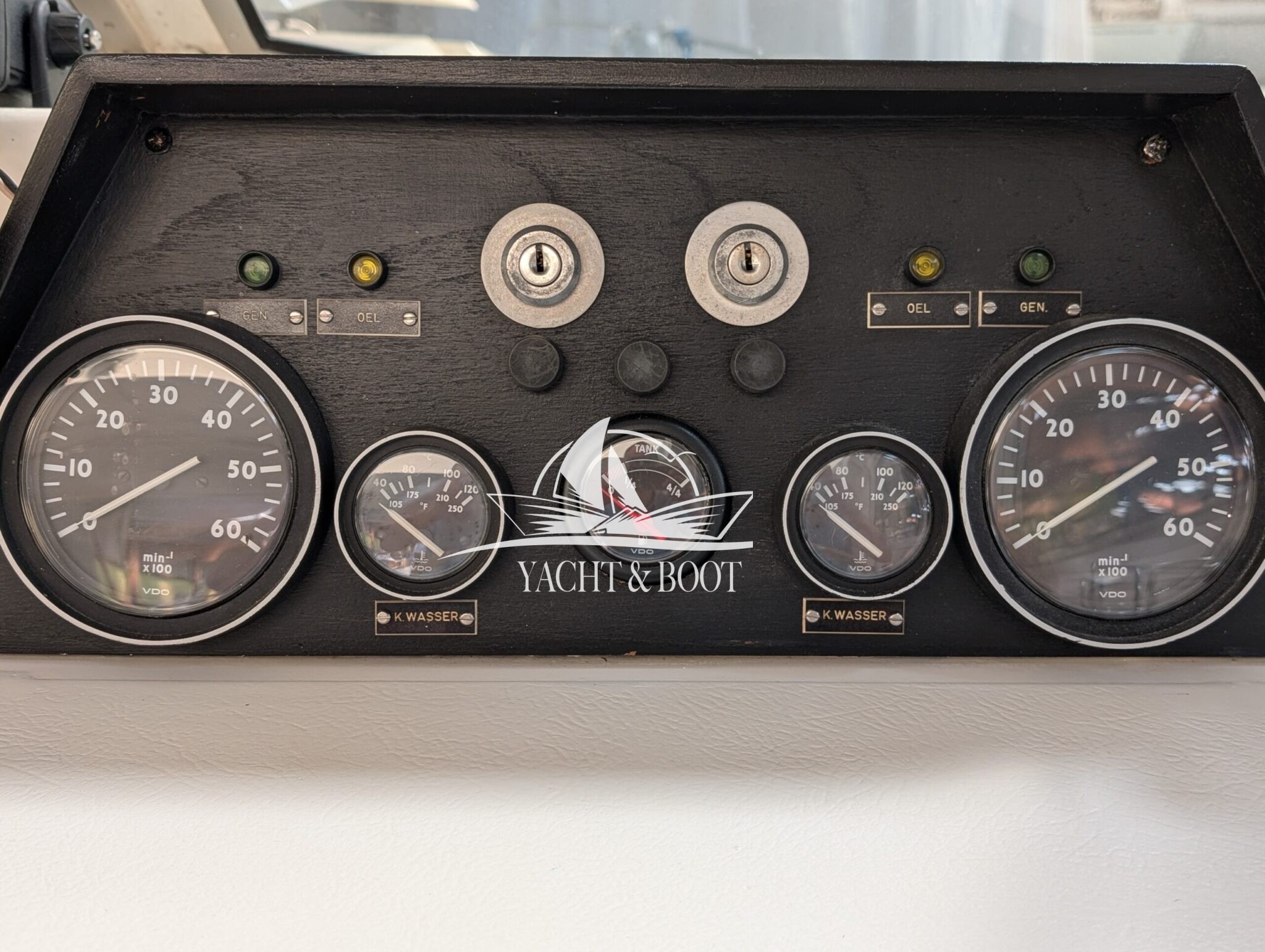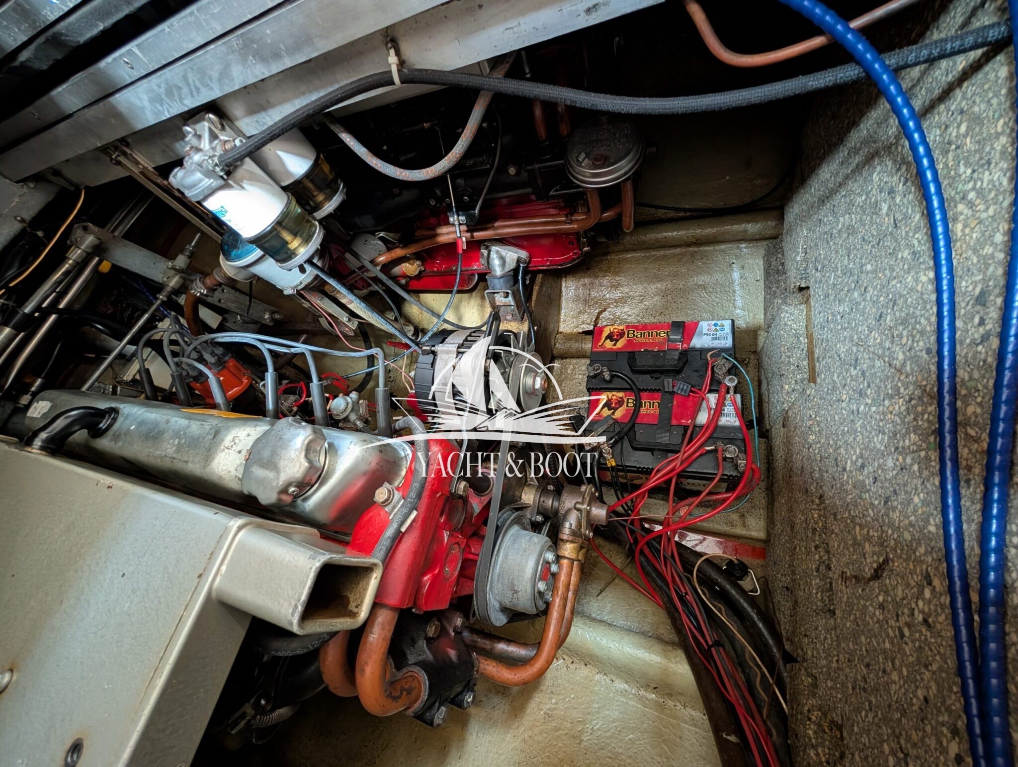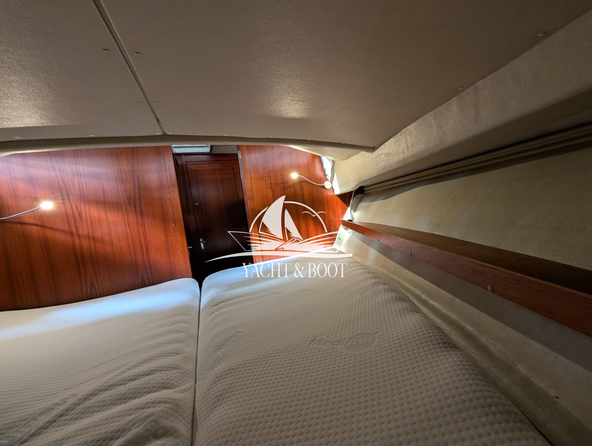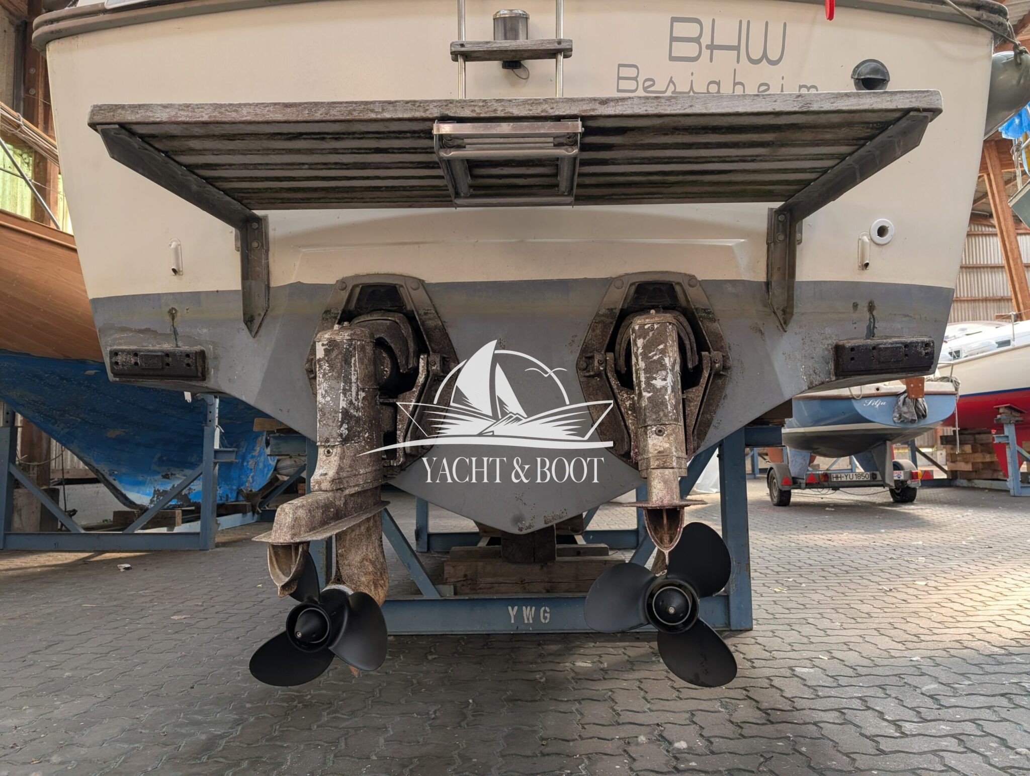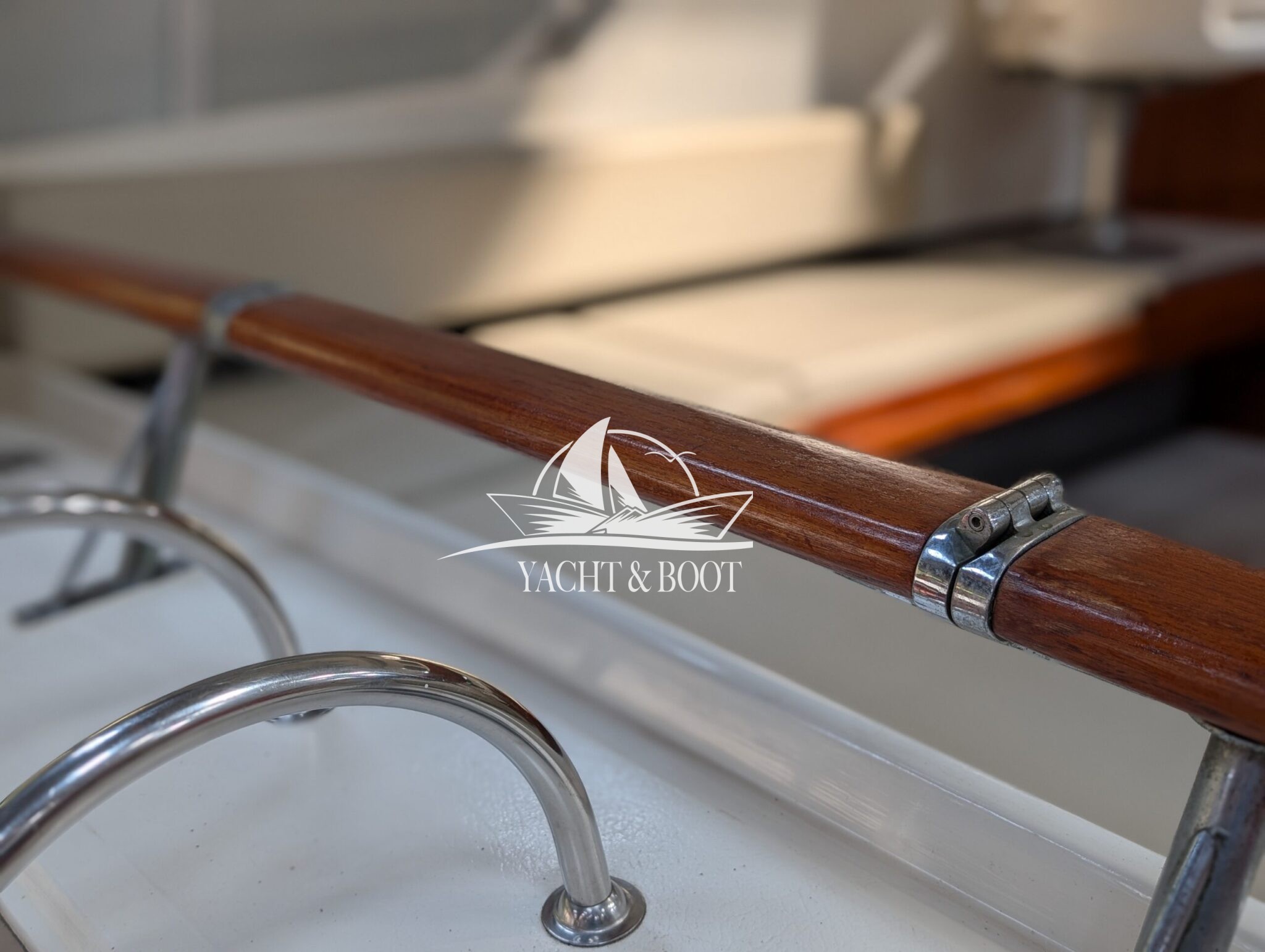 The "Old Lady" is in a very well-kept condition, always maintained and visually upgraded, especially in the saloon. A lot has also been invested technically in recent years. The two 270 Z-drives from Volvo were completely overhauled in 2023. The alternators and starter motors were replaced on both engines. New electric trim tabs ensure a better driving experience and new upholstery and the custom-made mattress provide more comfort.