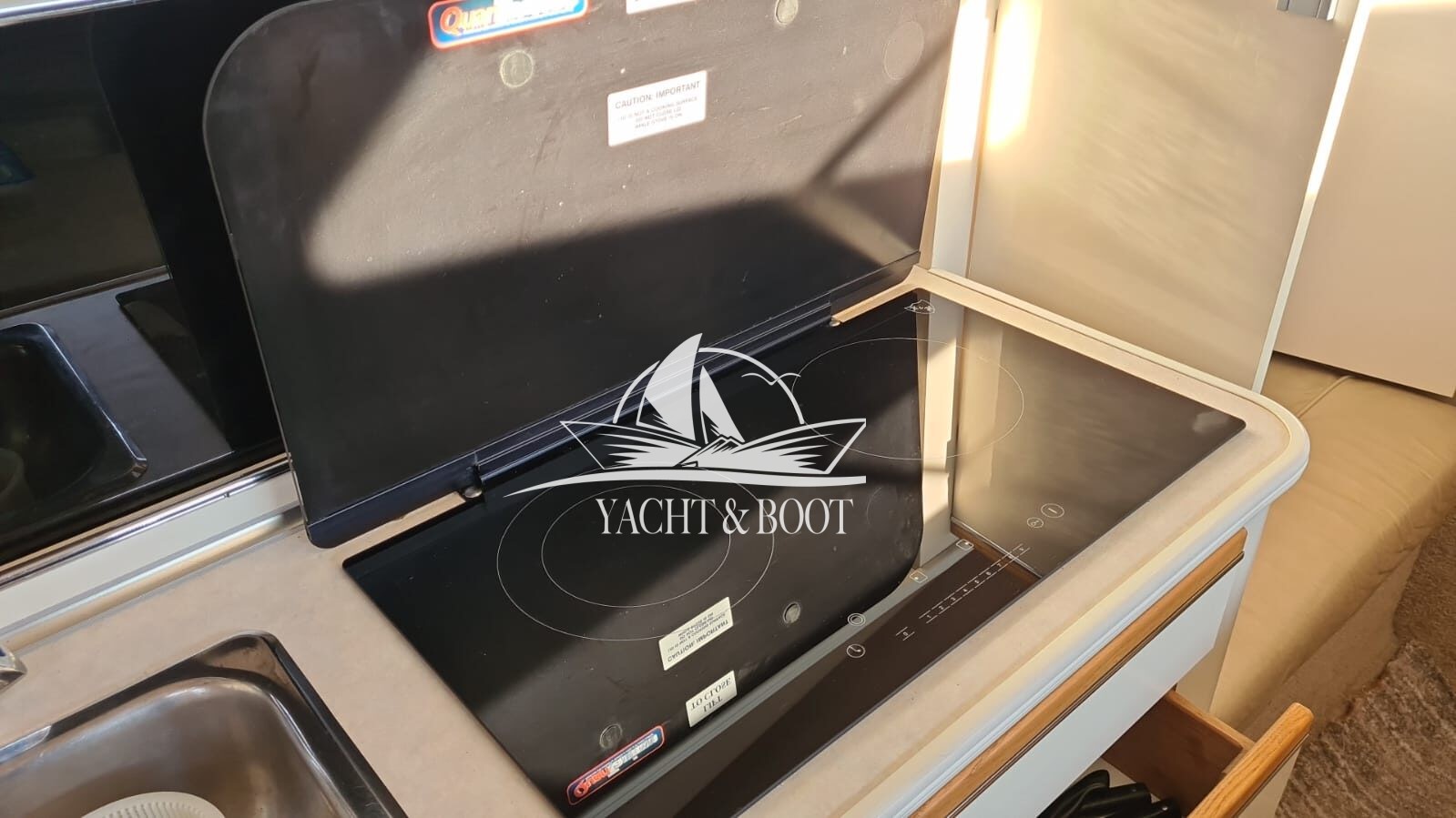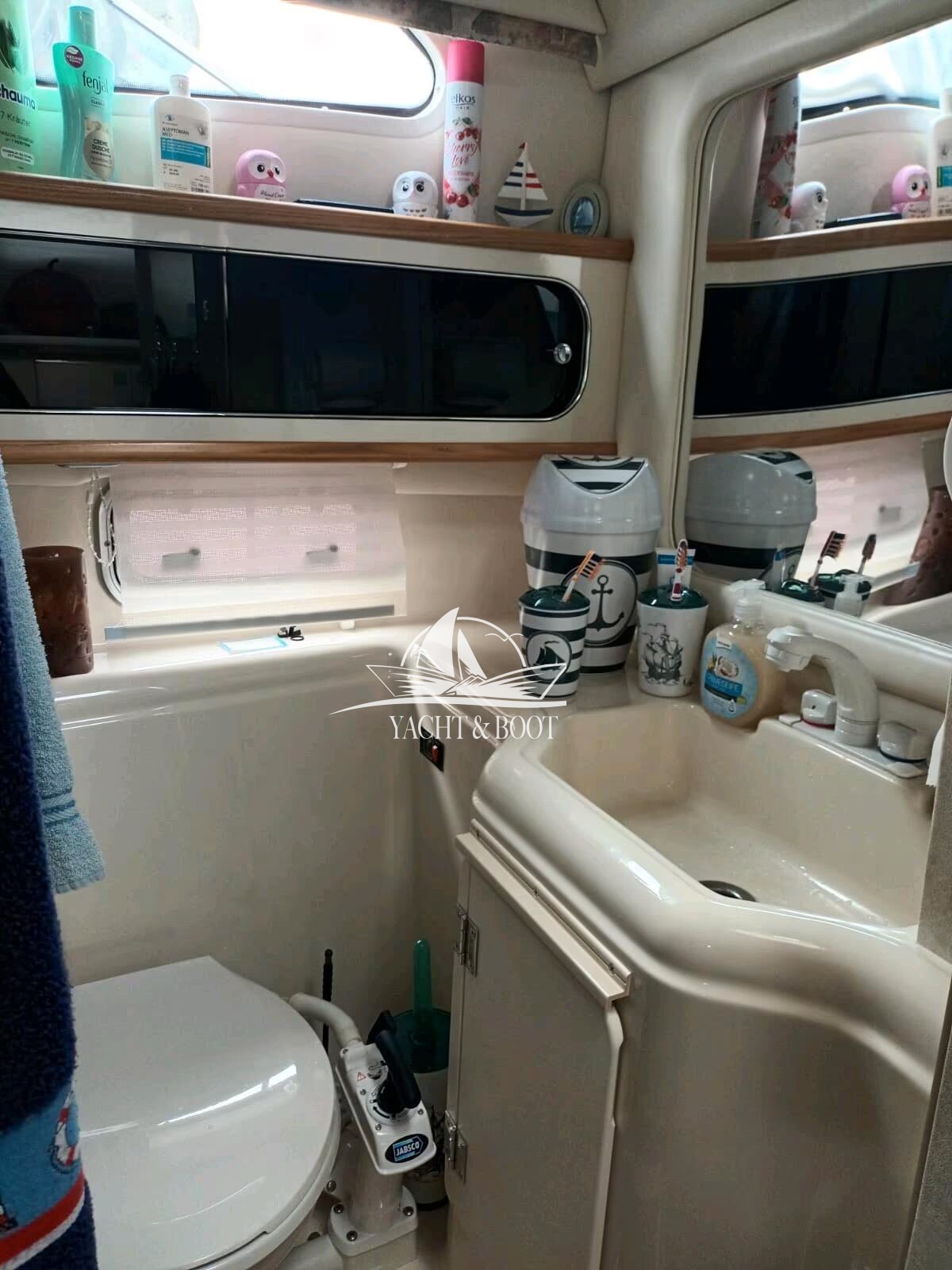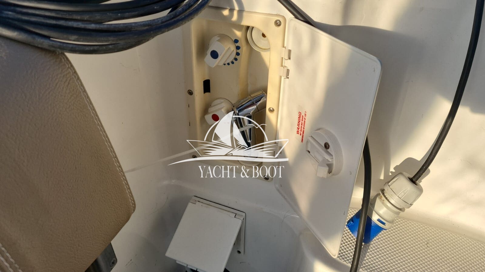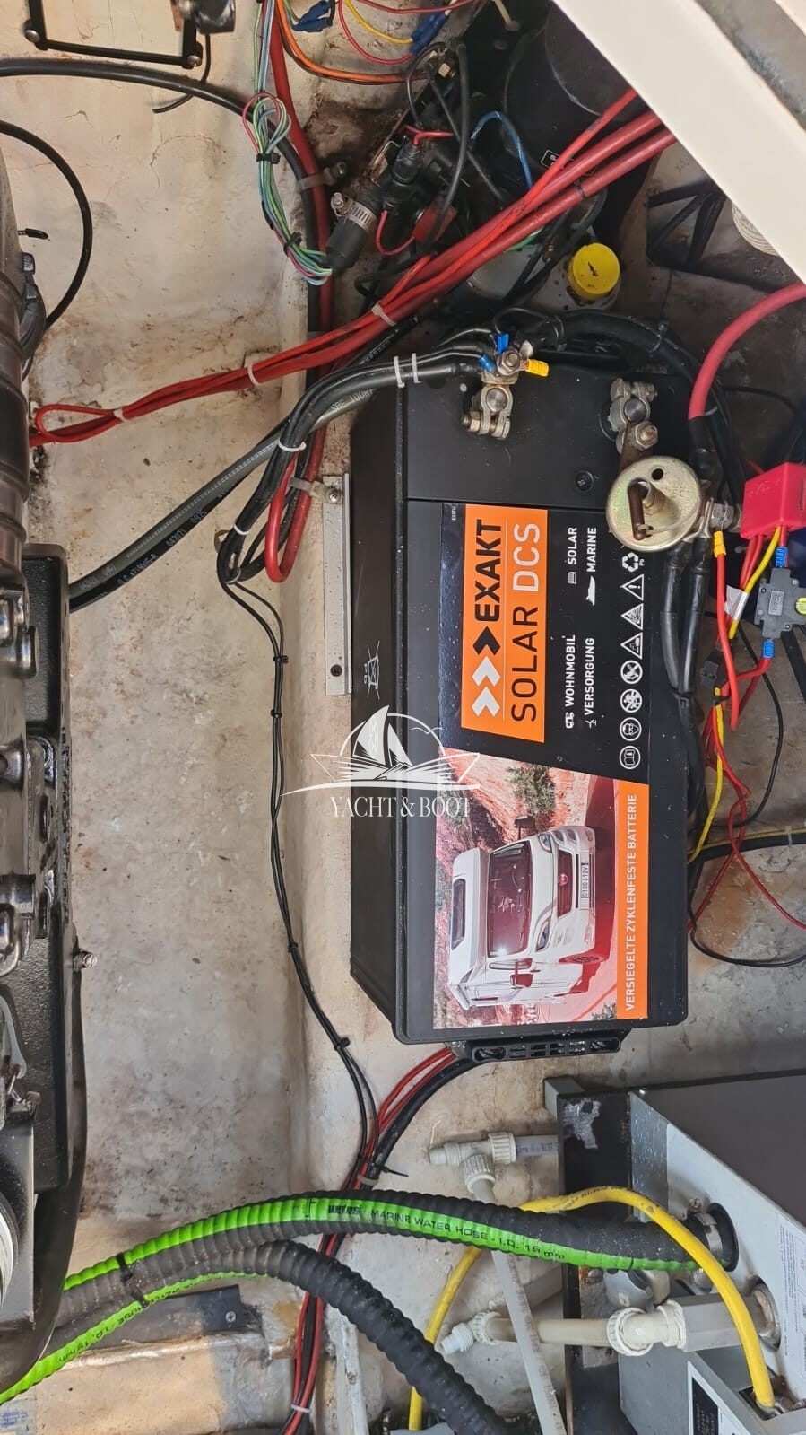 Technically, the Bayliner is excellently equipped. It has a shore power connection (220 V), battery charger, new starter and consumer batteries, pressurized water system, hot water boiler, inverter, generator, underwater lighting and trim tabs with display. A bow thruster facilitates maneuvering in harbors and narrow areas.