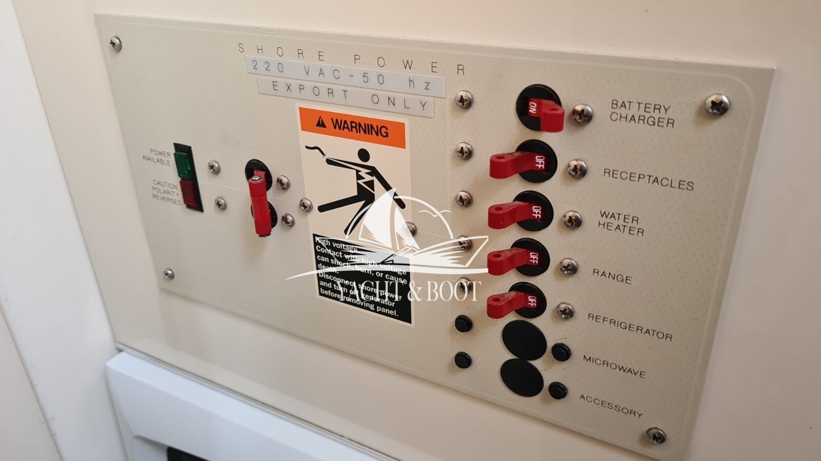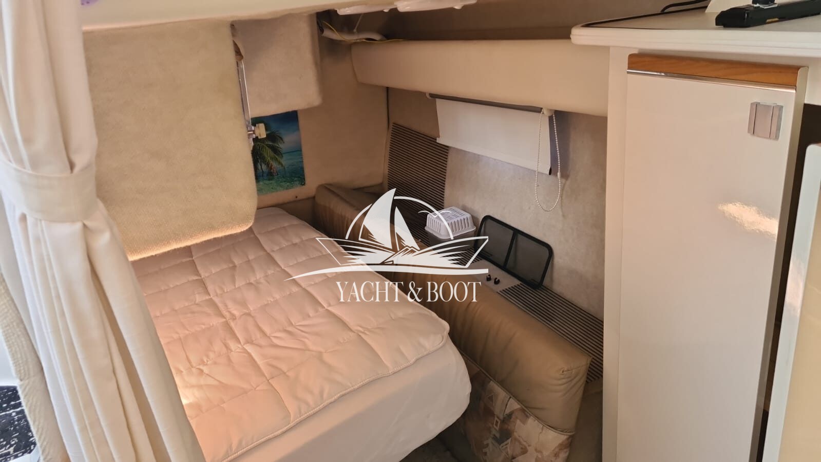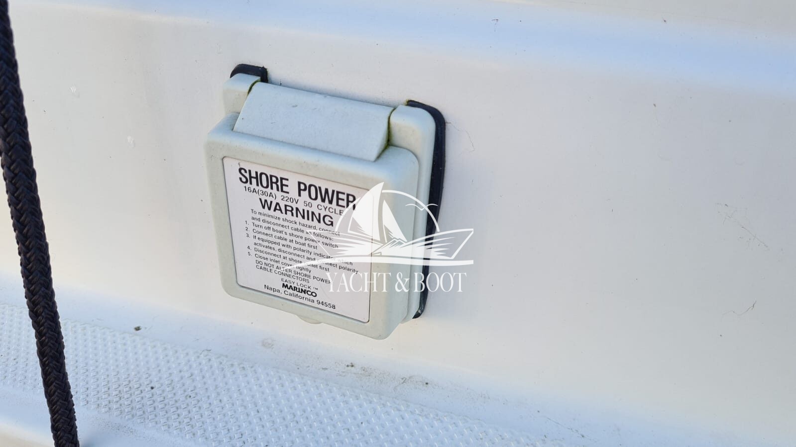 Technically, the Bayliner is excellently equipped. It has a shore power connection (220 V), battery charger, new starter and consumer batteries, pressurized water system, hot water boiler, inverter, generator, underwater lighting and trim tabs with display. A bow thruster facilitates maneuvering in harbors and narrow areas.