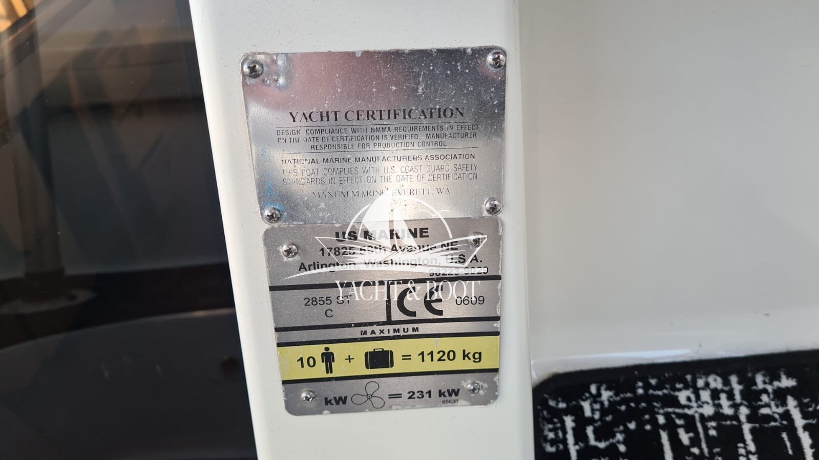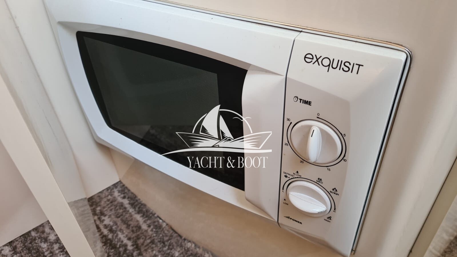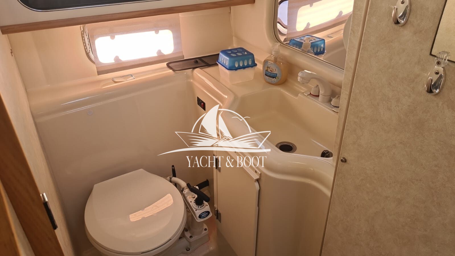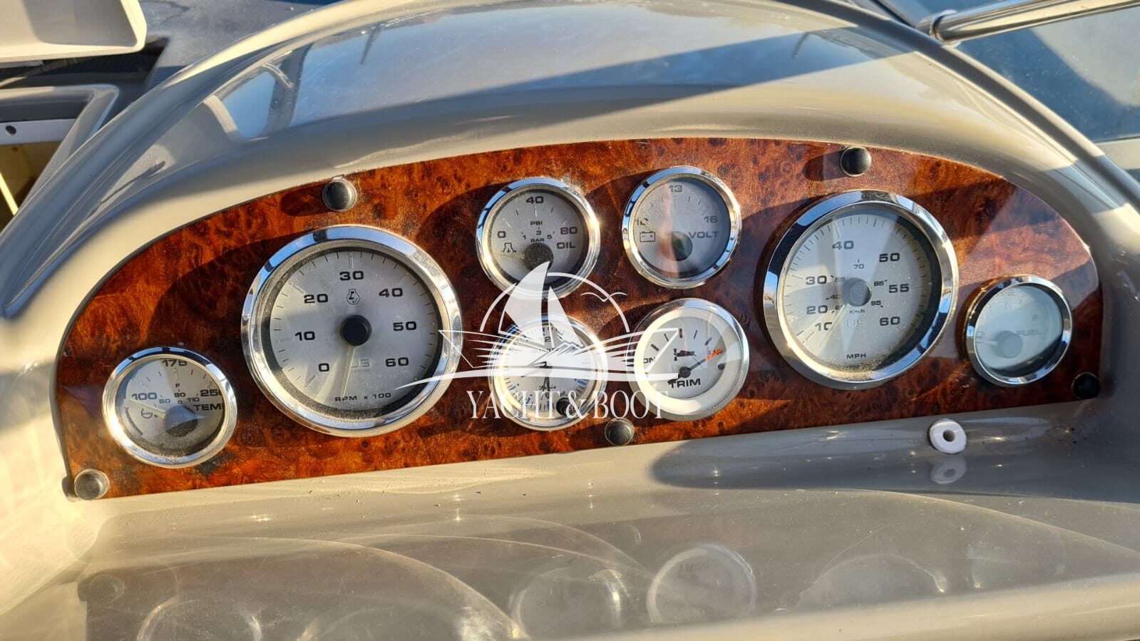 Technically, the Bayliner is excellently equipped. It has a shore power connection (220 V), battery charger, new starter and consumer batteries, pressurized water system, hot water boiler, inverter, generator, underwater lighting and trim tabs with display. A bow thruster facilitates maneuvering in harbors and narrow areas.