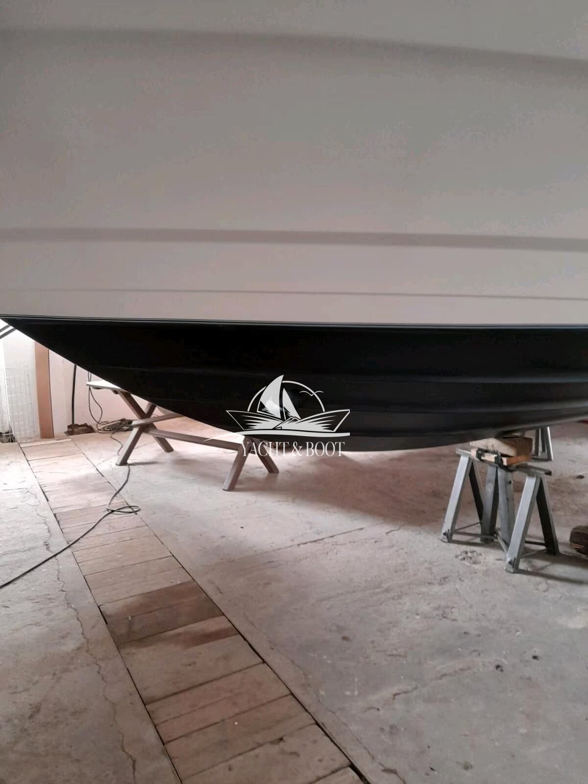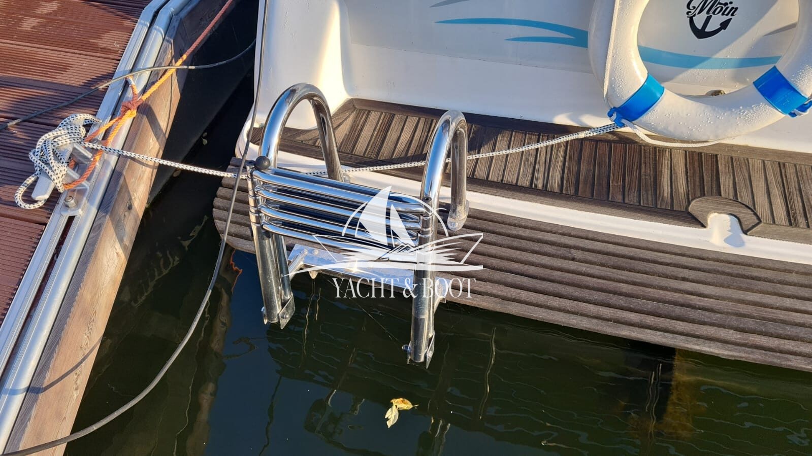 With a length of 9.23 meters, a width of 3.00 meters and a draught of 0.80 meters, the "Emilia" offers a good balance of space, stability and sporty agility. The white GRP planing hull impresses with its solid construction and timeless design, which still looks modern today.