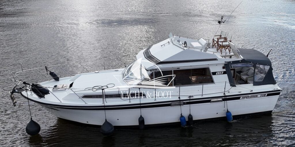 With a length of 9.23 meters, a width of 3.00 meters and a draught of 0.80 meters, the "Emilia" offers generous space and stable, safe handling. The white GRP planing hull is in excellent condition and is ideal for inland and coastal waters (CE category C).
