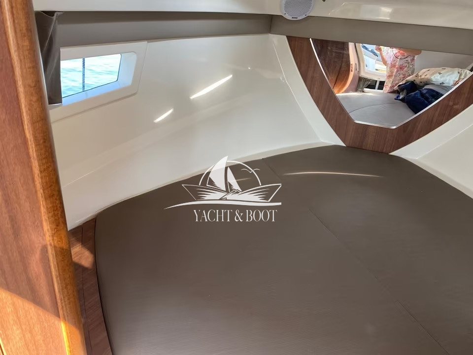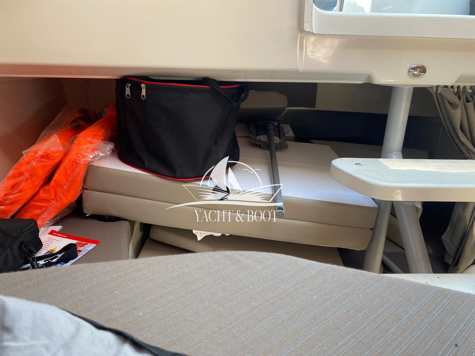 Der großzügige Cockpitbereich mit Teakboden, Badeplattformverlängerung, Sonnenpolstern sowie Camper- und Sonnenverdeck bietet viel Aufenthaltsqualität an Bord. Unter Deck stehen zwei Kabinen mit mehreren Kojen sowie eine vollständig ausgestattete Pantry und ein Bad zur Verfügung. Toilette, Kühlschrank und Waschbecken wurden bislang kaum bzw. nicht genutzt, was den neuwertigen Eindruck unterstreicht.