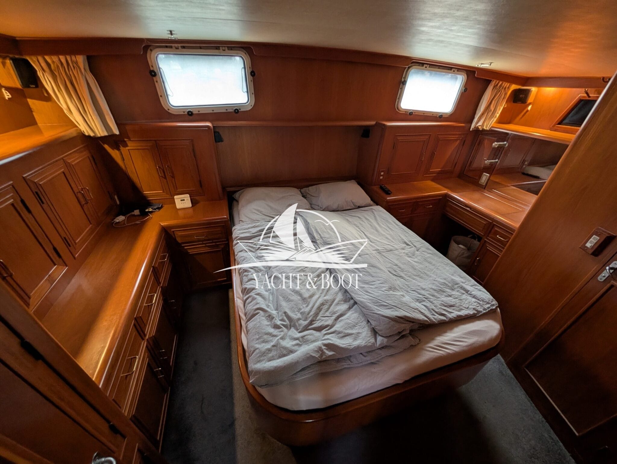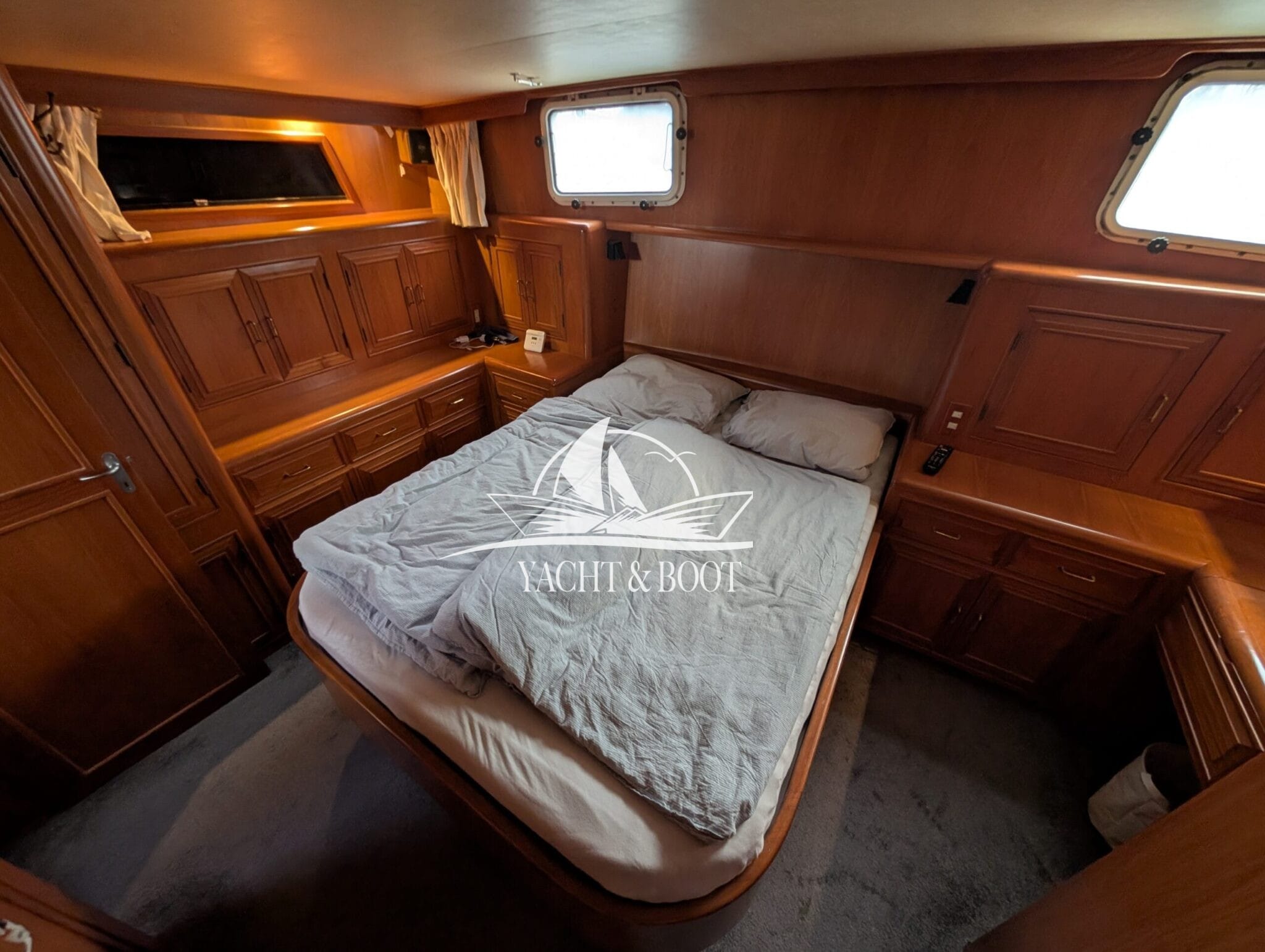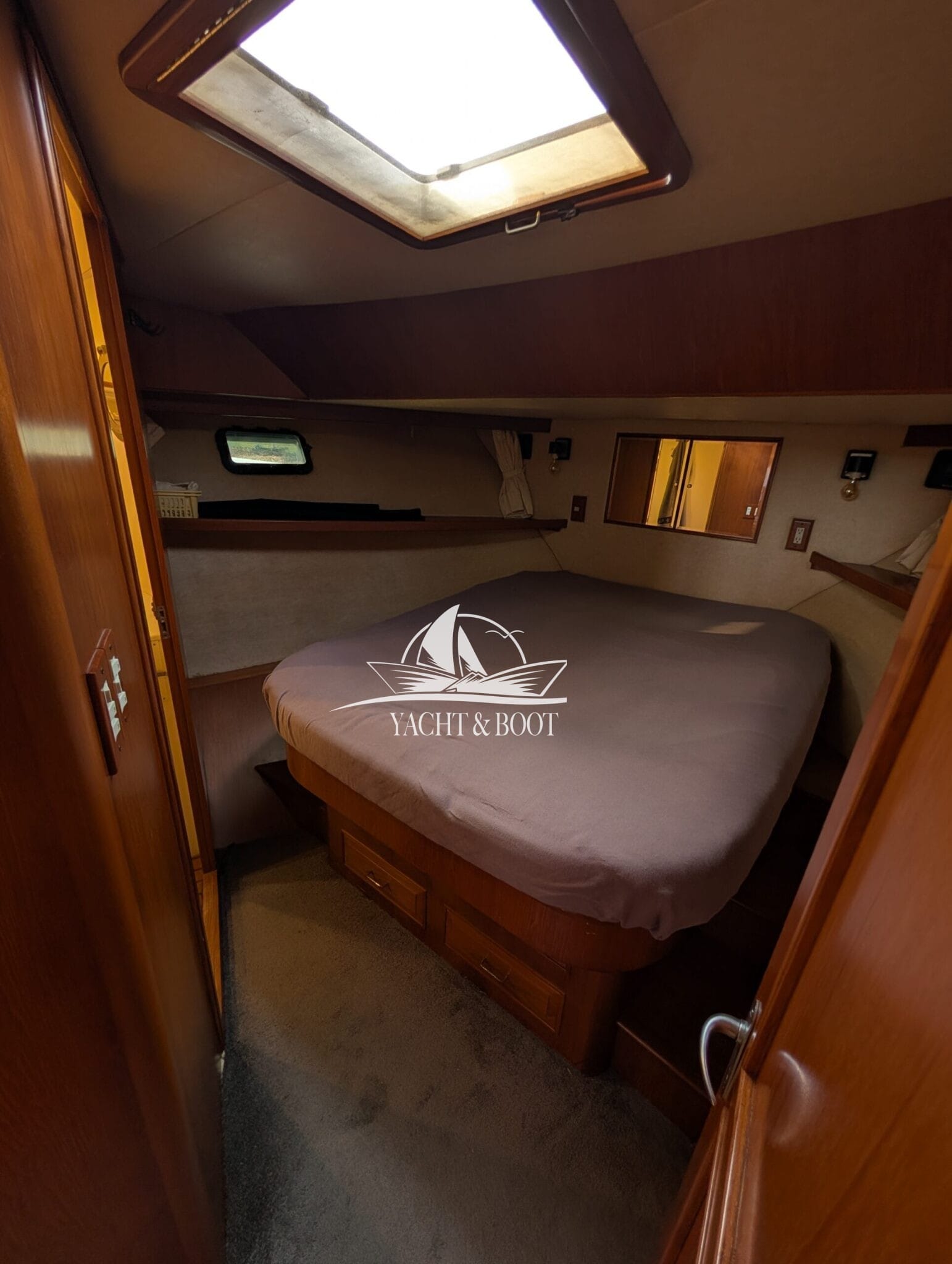 A particular highlight is the wide aft cabin, which is designed as a fully-fledged owner's apartment and offers plenty of storage space and a private wet room. It is complemented by a separate guest cabin in the foredeck, ensuring privacy for everyone on board. This classic aft cabin structure makes the Camargue 42 Sundeck a popular choice for families and owners with space requirements.